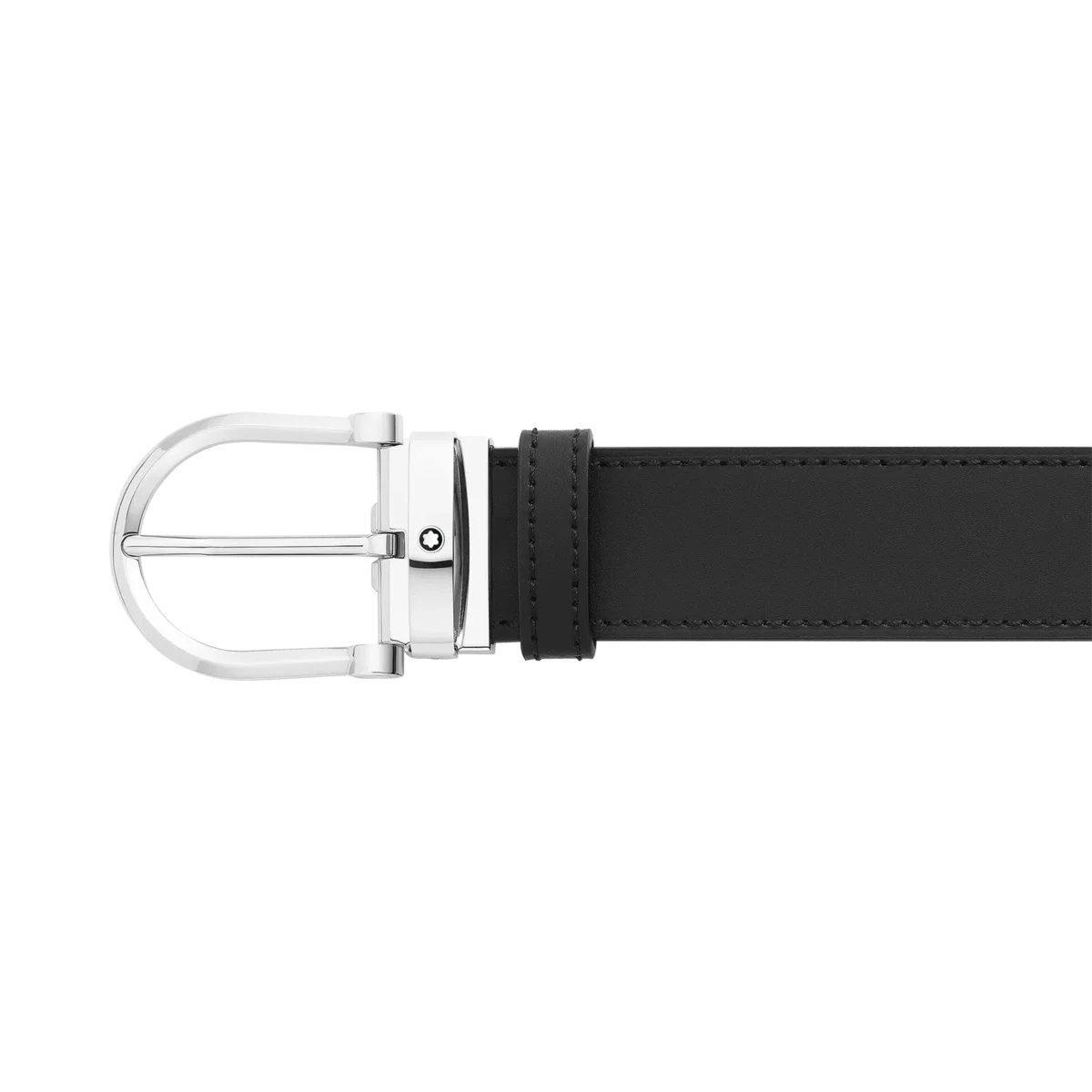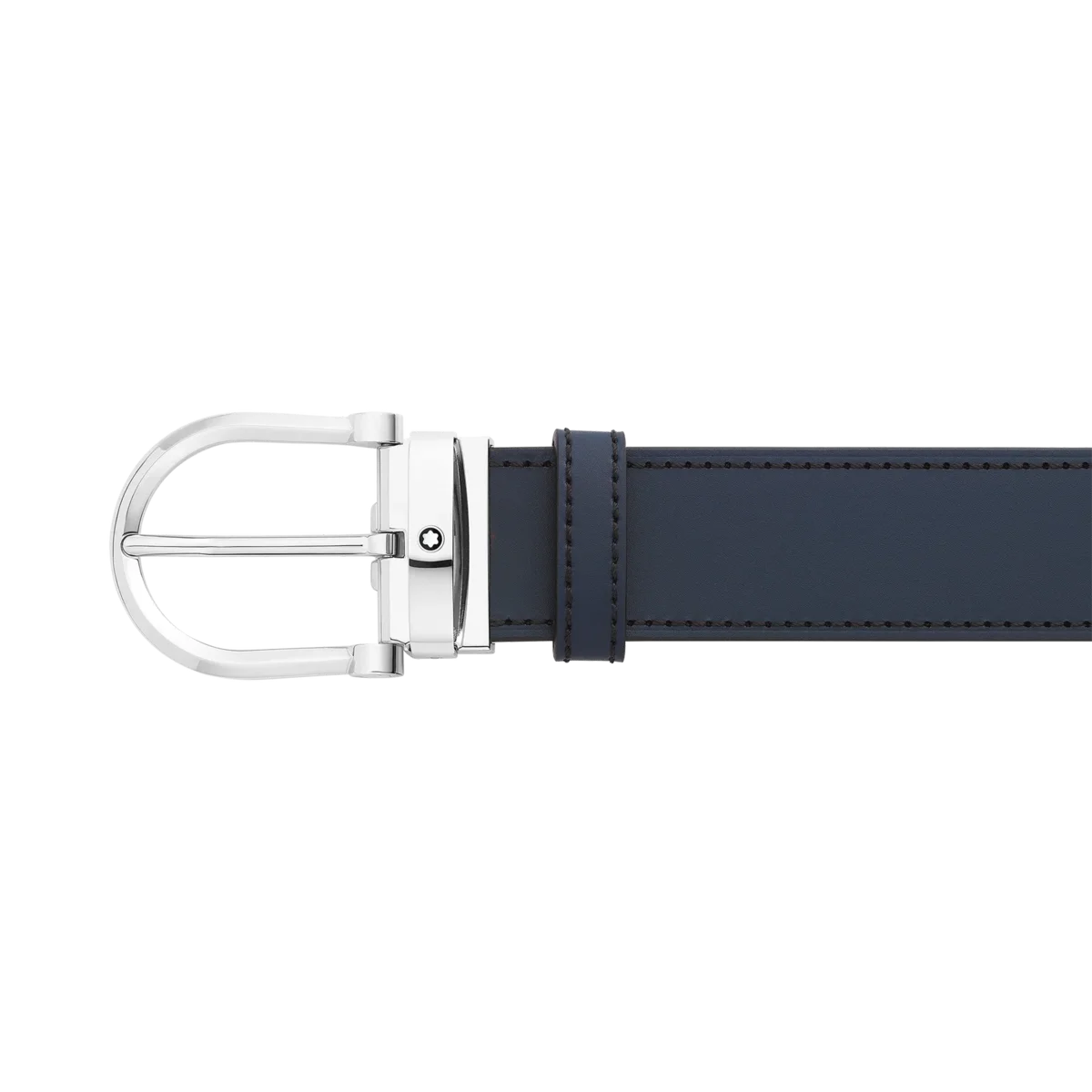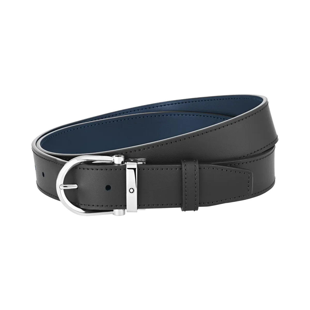 Catarama din oțel inoxidabil lucios în formă de potcoavă. Curea din piele reversibilă, auto-reglabilă, 3,5 cm x 120 cm, în culori negru și albastru. Casuală și sofisticată.