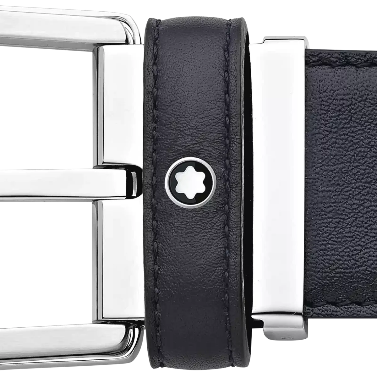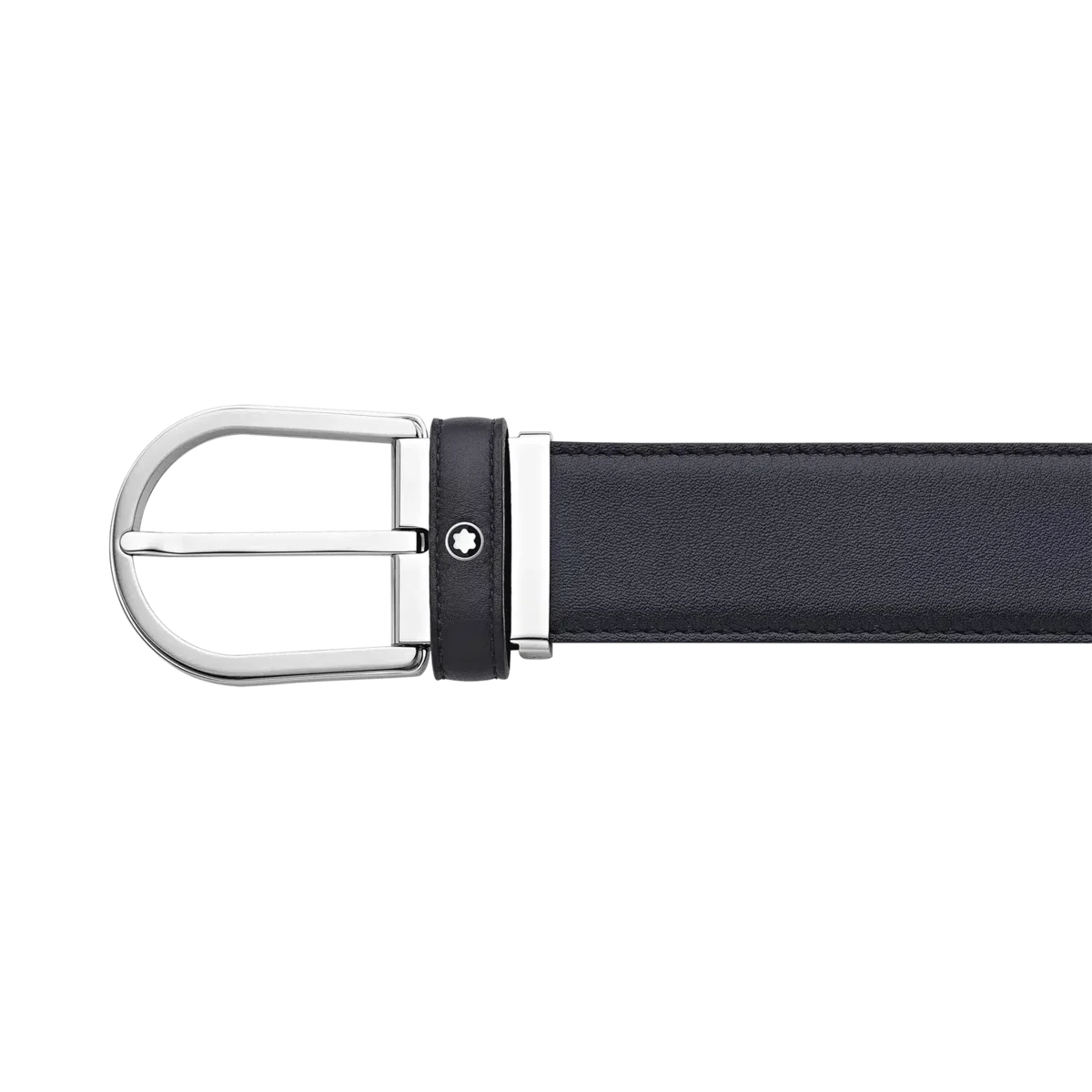 Catarama în formă de potcoavă din oțel inoxidabil lucios și mat. Auto-reglabilă, 3,5 cm x 120 cm, curea din piele albastră simplă, cu patina pielii vopsite manual, cu o gradație delicată de culori. Concepută pentru un look casual, dar elegant.