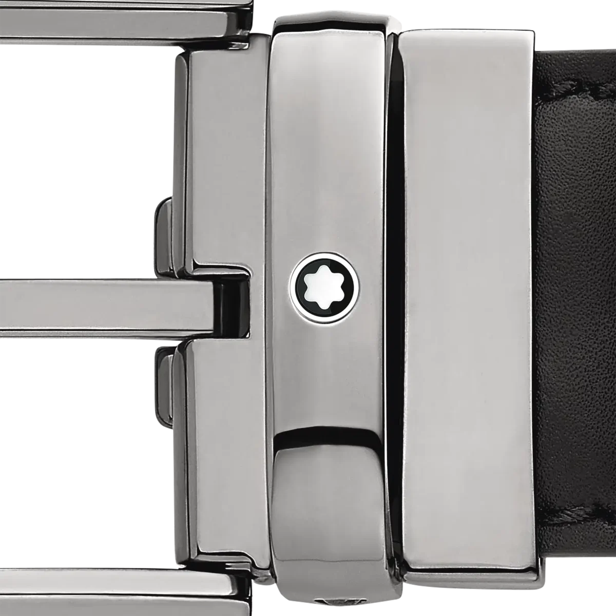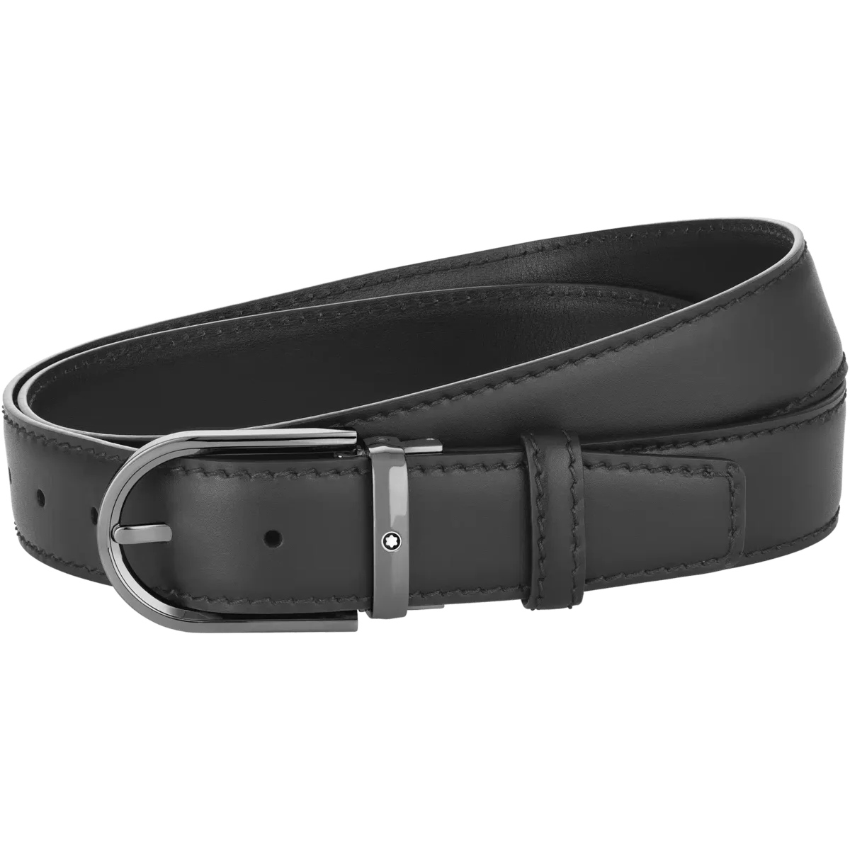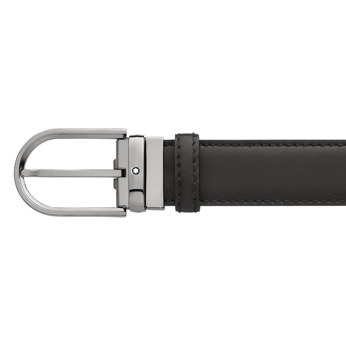 Catarama în formă de potcoavă cu finisaj lucios din ruteniu. Auto-reglabilă, 3,5 cm x 120 cm, cu curea din piele neagră și cusături pricker. Concepută pentru un look clasic cu un plus de originalitate.