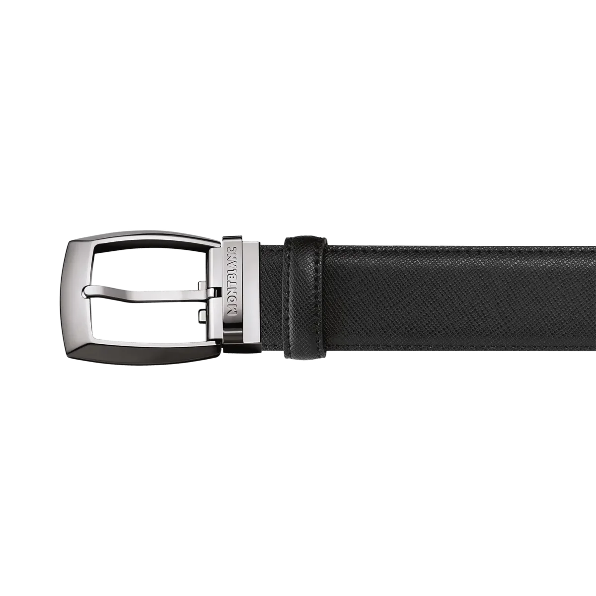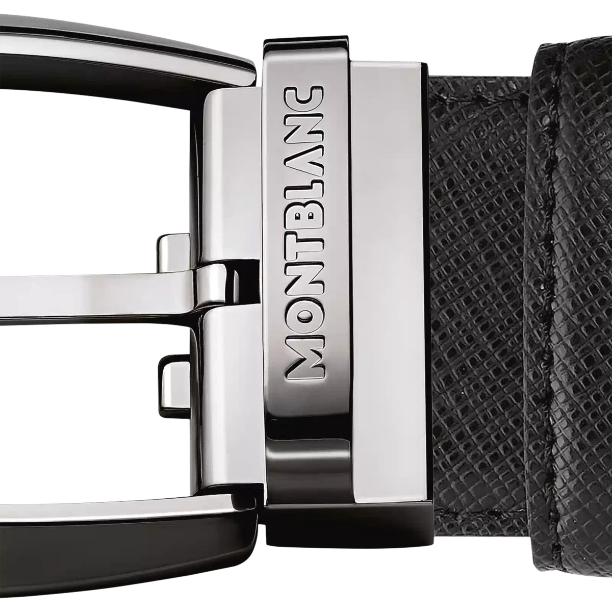 Catarama lucioasă, convexă, cu finisaj din ruteniu, cu numele mărcii Montblanc gravat. Ușor de ajustat, 3,5 cm x 120 cm, cu curea din piele neagră imprimată saffiano. Concepută pentru un look casual.MB112408