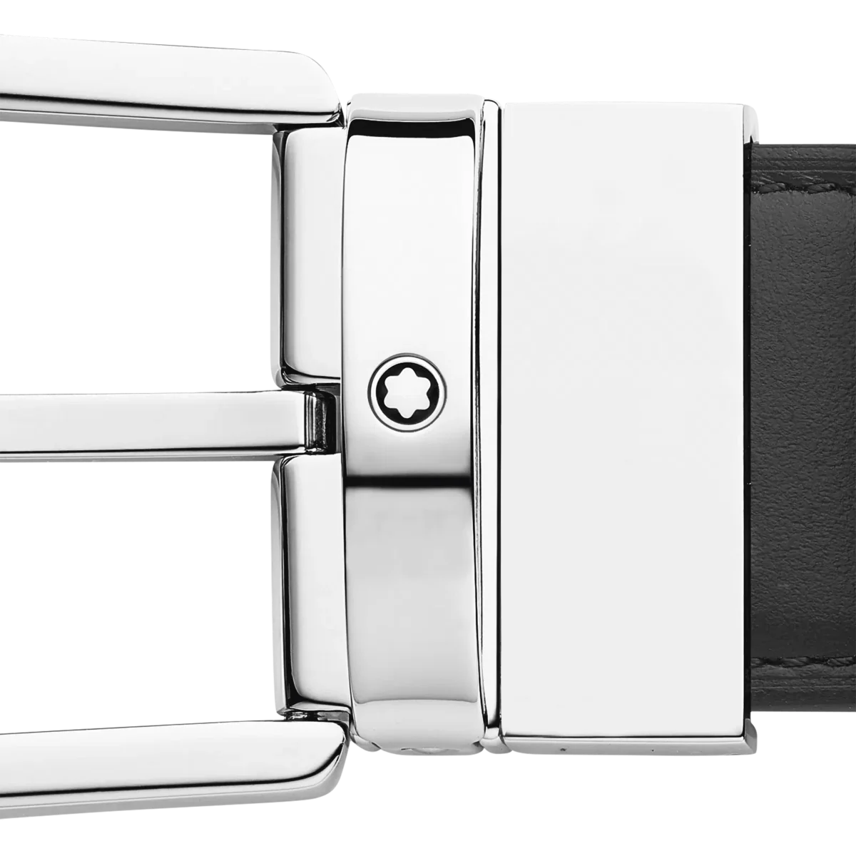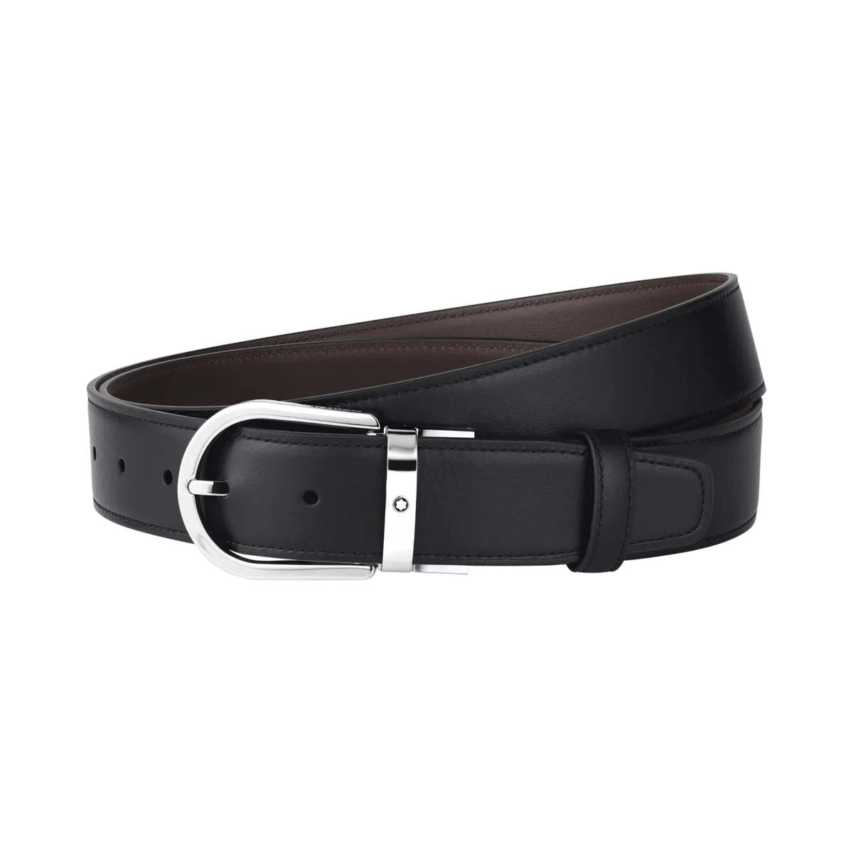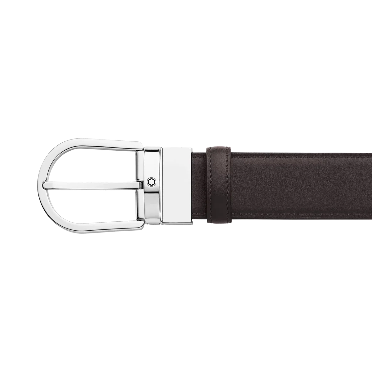 Catarama cu finisaj paladiu lucios în formă de potcoavă. Curea din piele reversibilă, auto-reglabilă, 3,5 cm x 120 cm, de culoare neagră pe o parte și maro închis pe cealaltă. Rafinată și discretă, pentru orice tip de ținută.