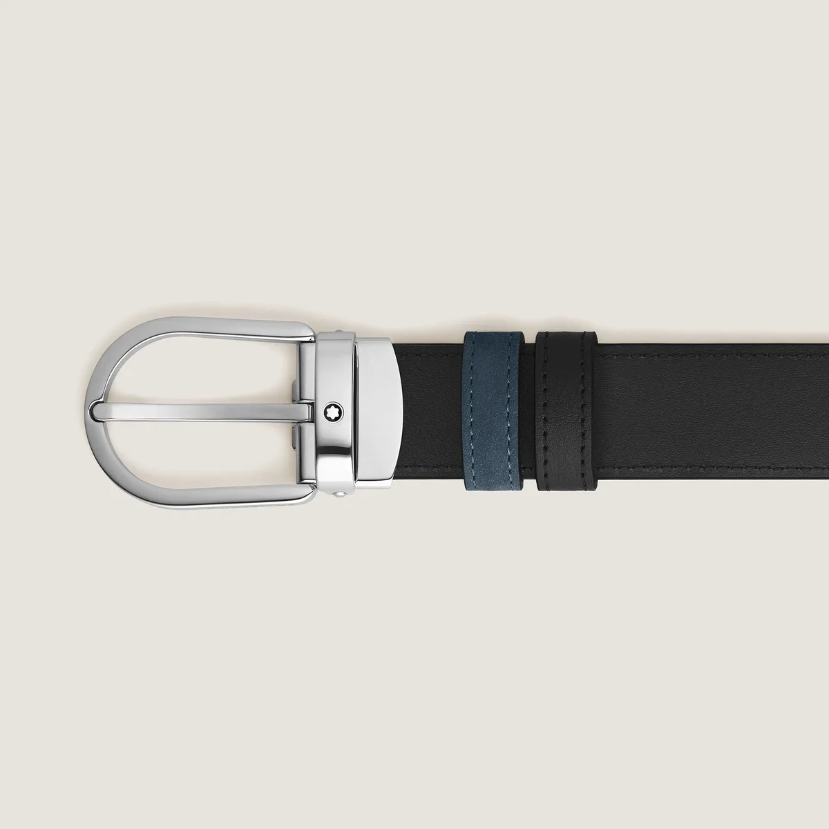 Cu piele de căprioară albastră catifelată la atingere pe o parte și piele neagră netedă pe cealaltă, această curea reversibilă de 30 mm oferă un stil dublu. Catarama în formă de potcoavă cu finisaj strălucitor din paladiu adaugă un aspect atemporal, completat de emblema Montblanc.
