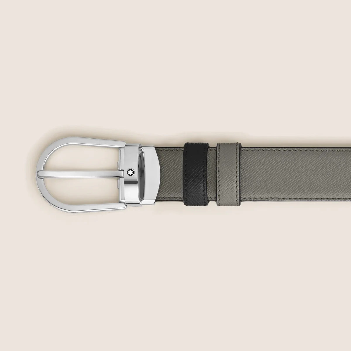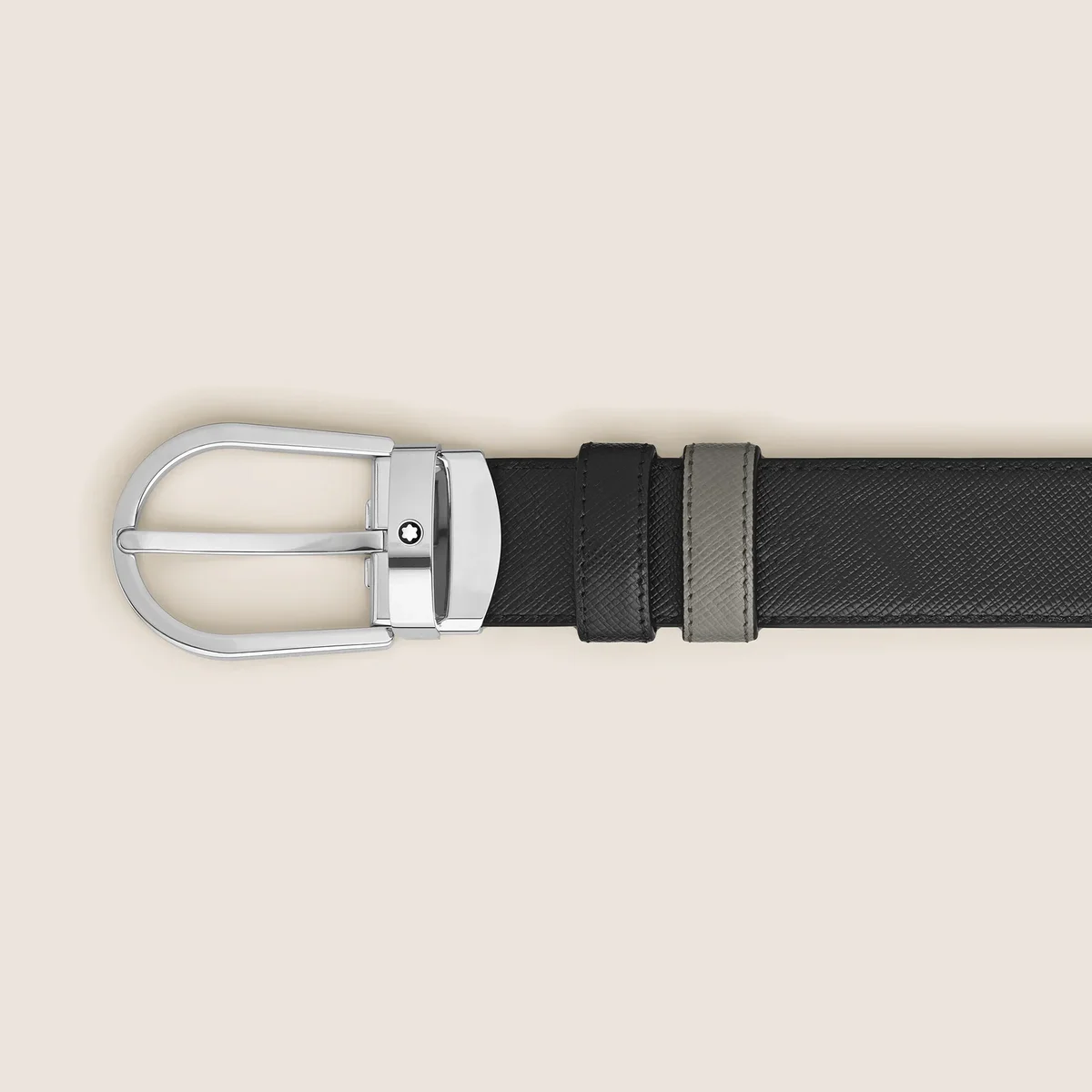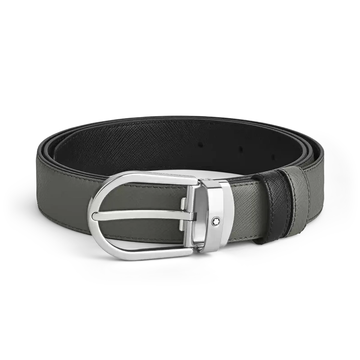 Această curea reversibilă versatilă are o cataramă rafinată în formă de potcoavă, oferind două aspecte într-unul singur. Confecționată din piele Saffiano de lux, o parte prezintă o nuanță subtilă de gri mediu, în timp ce cealaltă rămâne clasică în negru, oferind un stil și o adaptabilitate fără efort pentru orice ocazie.MB220019