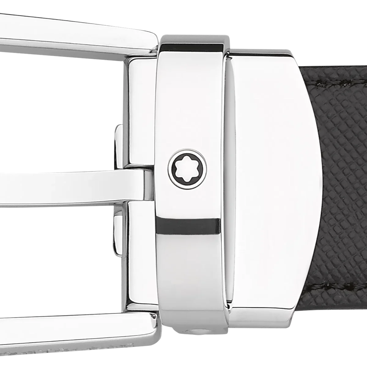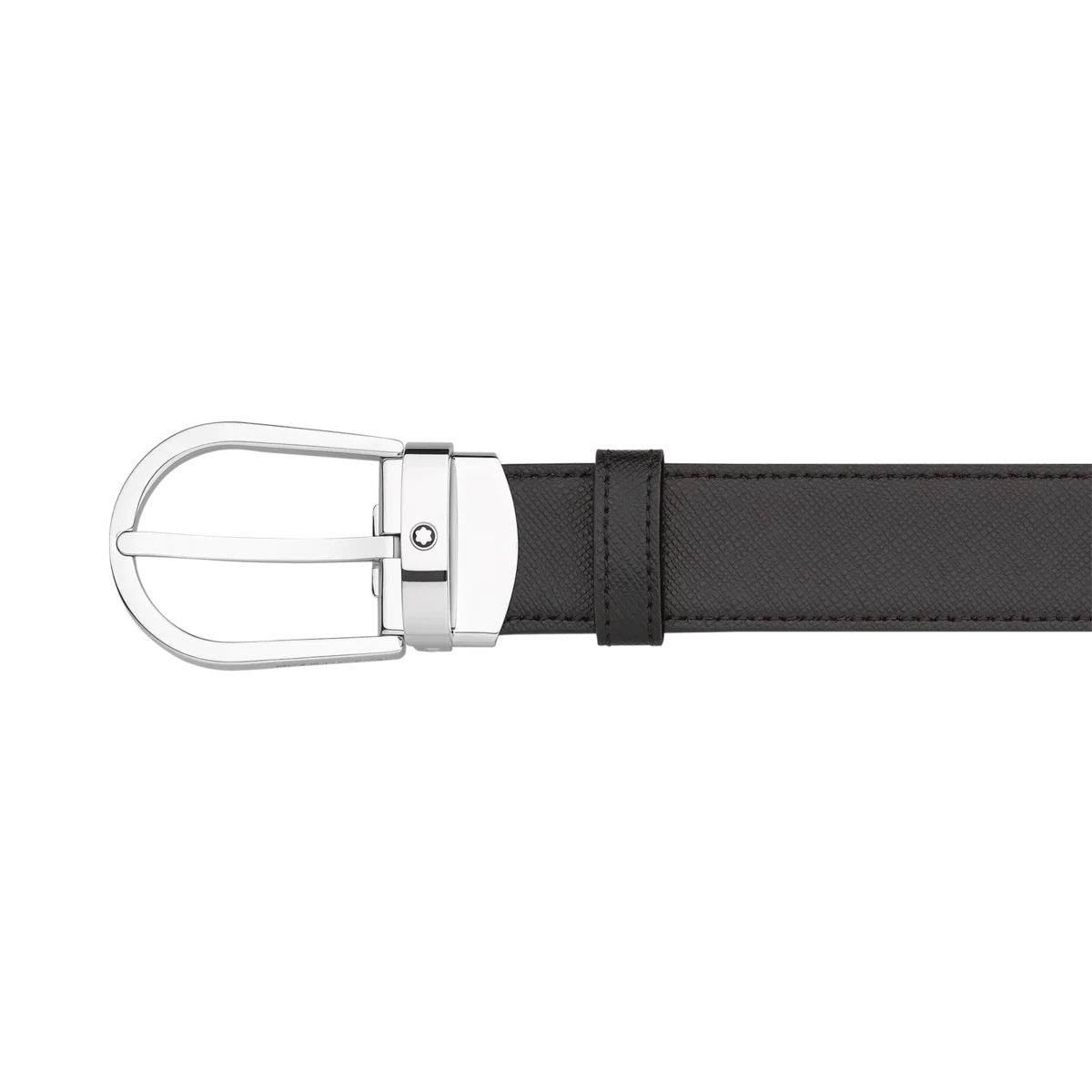 Catarama strălucitoare din oțel inoxidabil în formă de potcoavă, cu emblemă Montblanc. Curea din piele reversibilă, auto-reglabilă, 3 cm x 120 cm, cu imprimeu saffiano negru și maro.