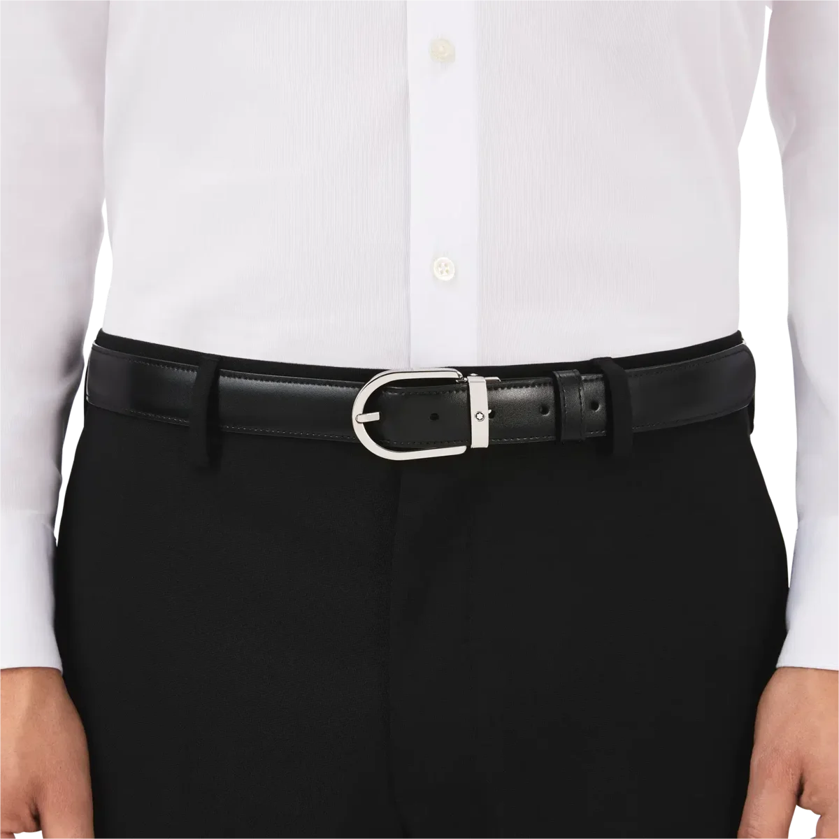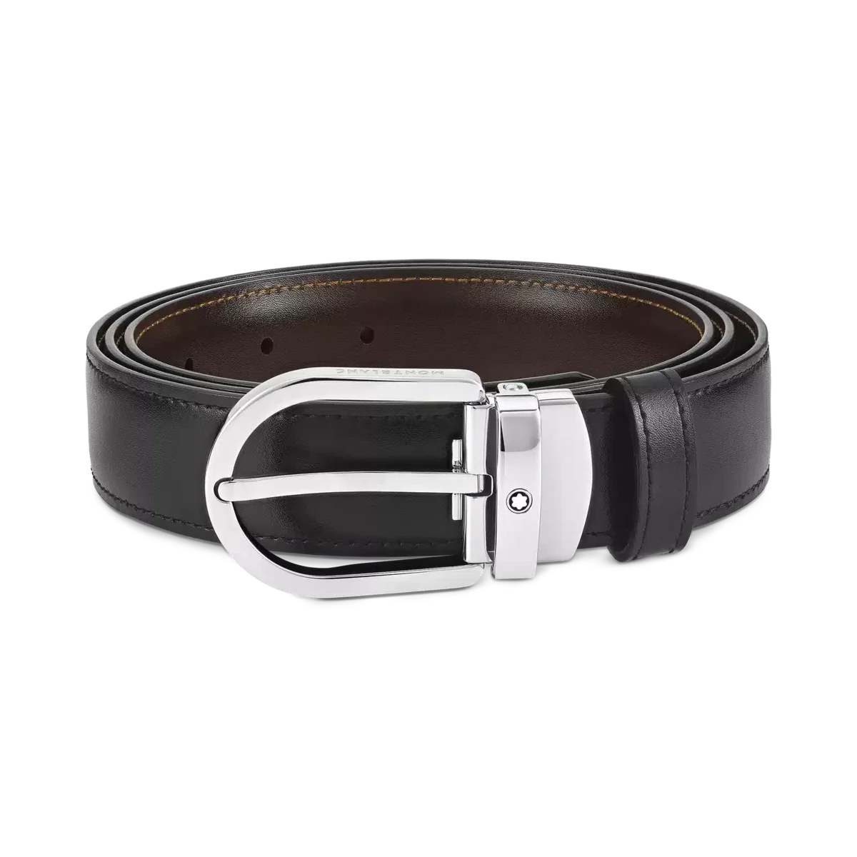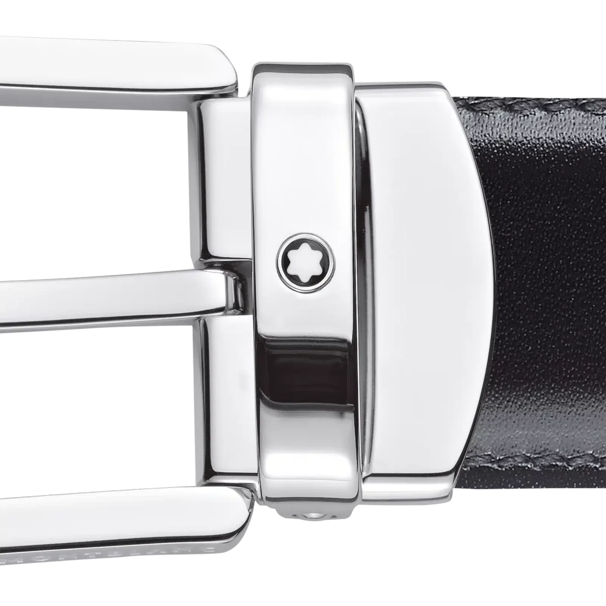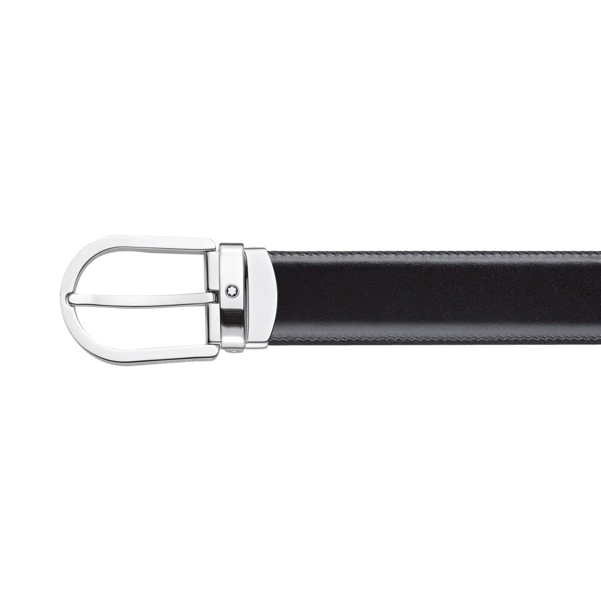 Catarama strălucitoare cu finisaj paladiu, în formă de potcoavă, cu numele mărcii Montblanc gravat pe laterale și emblema Montblanc. Curea din piele neagră/maro reversibilă, auto-reglabilă, 3 cm x 120 cm. Rafinată și discretă, pentru orice tip de ținută.