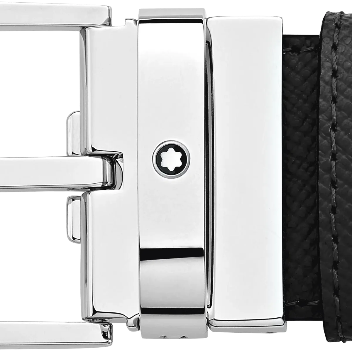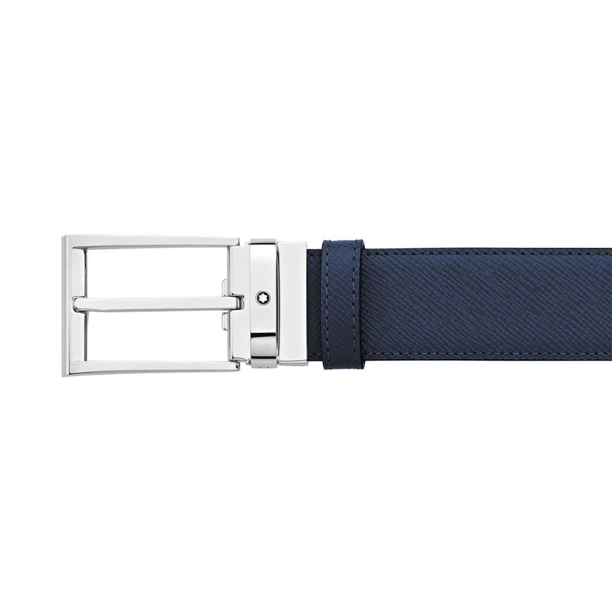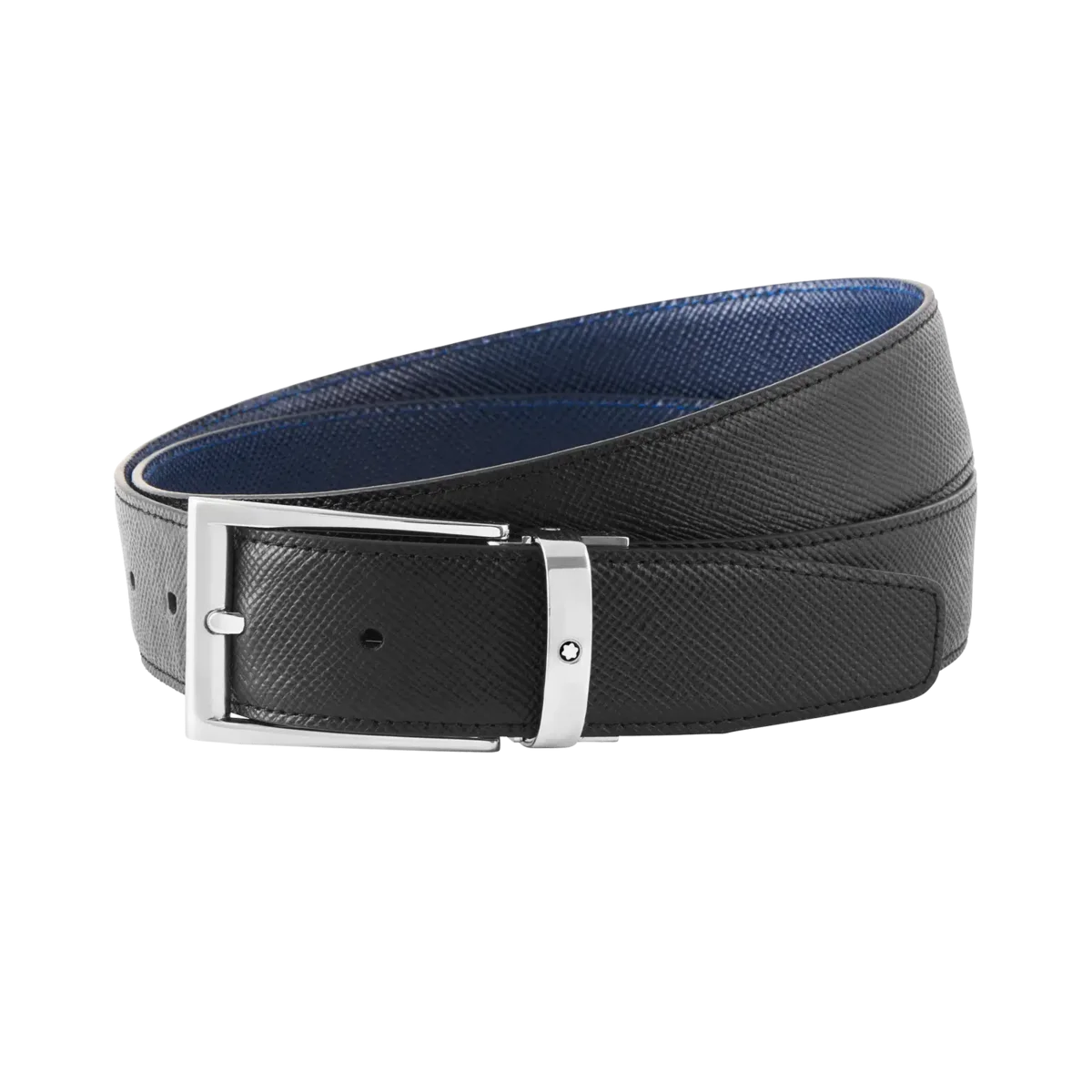 Catarama trapeză lucioasă acoperită cu paladiu. Curea auto-reglabilă, 3,5 cm x 120 cm, reversibilă, din piele imprimată Saffiano, negru și albastru, asortată cu gama de articole din piele Montblanc Sartorial. Această curea reversibilă are o cataramă sobră din oțel inoxidabil și o curea elegantă din piele de vițel, neagră pe o parte și albastră pe cealaltă, fiind potrivită atât pentru ținute business, cât și casual.
