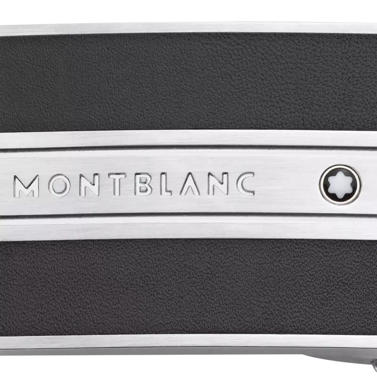 Catarama dreptunghiulară cu finisaj paladiu, cu design Meisterstück, gravată cu numele mărcii Montblanc și emblema Montblanc, 3 cm x 120 cm, curea reversibilă din piele neagră și maro. Concepută pentru un look casual, dar elegant.