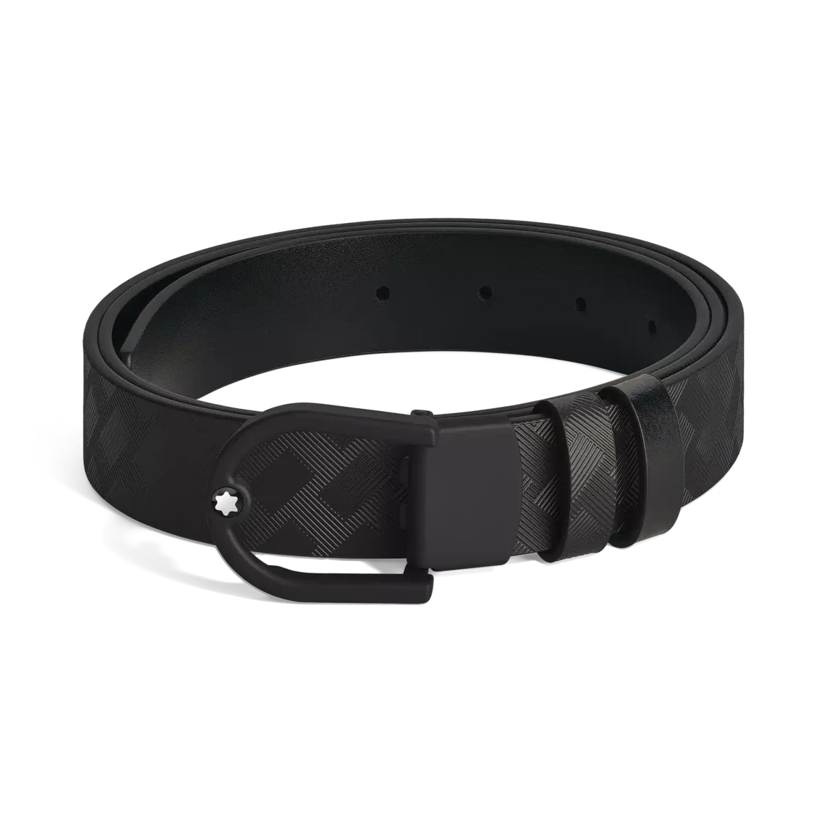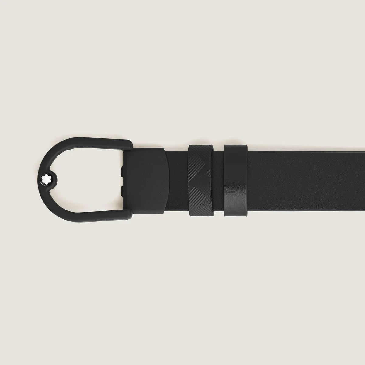 Această curea reversibilă de 30 mm combină silueta elegantă a unei catarame cauciucate cu finisaj PVD cu versatilitatea a două curele distincte din piele. Cu linii curate și curbate, catarama în formă de potcoavă adaugă o notă de rafinament modern stilului dvs. Cureaua oferă versatilitate și stil rafinat, prezentând două aspecte distincte într-un singur accesoriu: în timp ce o parte prezintă piele neagră Extreme 3.0 imprimată cu un design îndrăzneț, texturat, partea opusă prezintă piele Meisterstück neagră elegantă pentru un finisaj atemporal și rafinat.