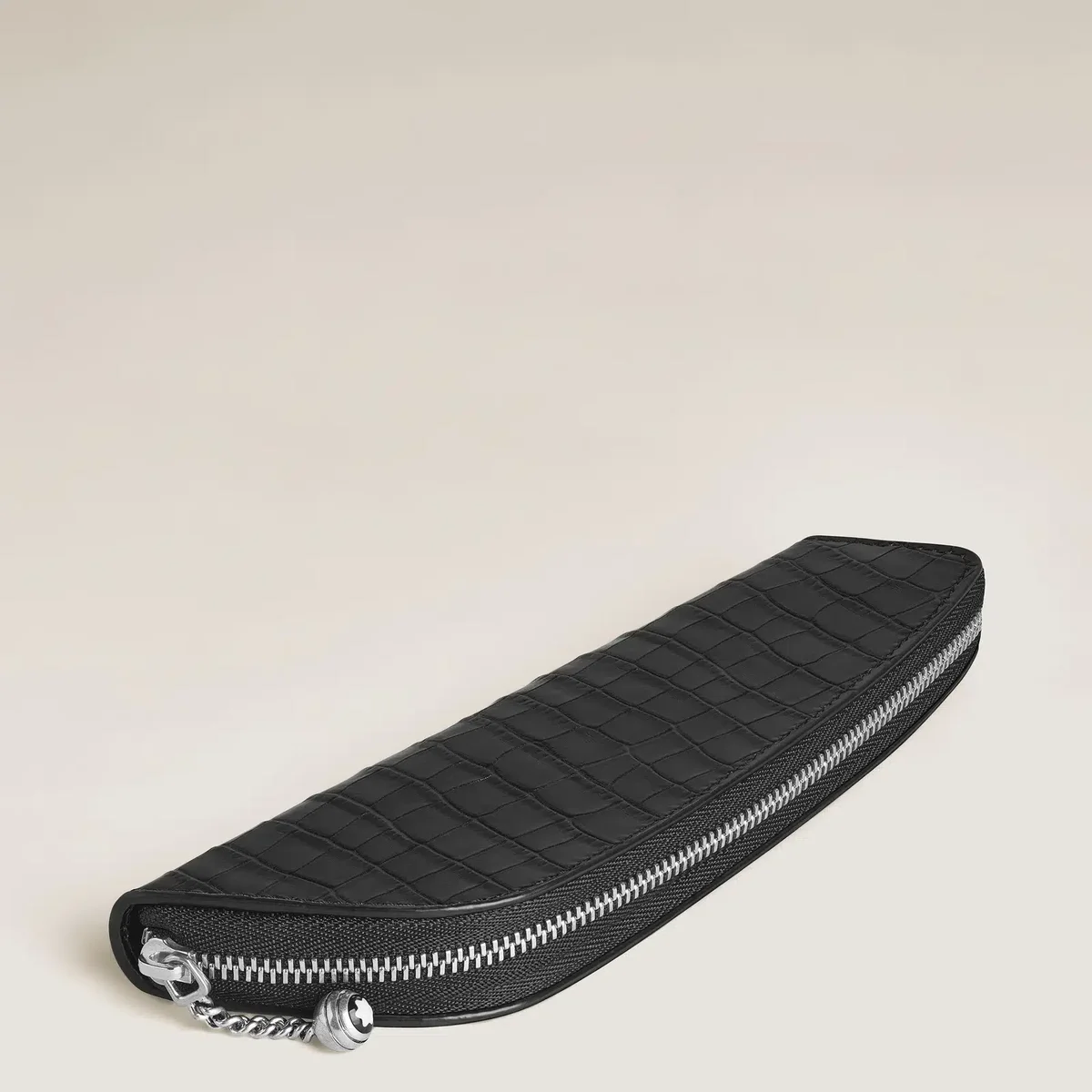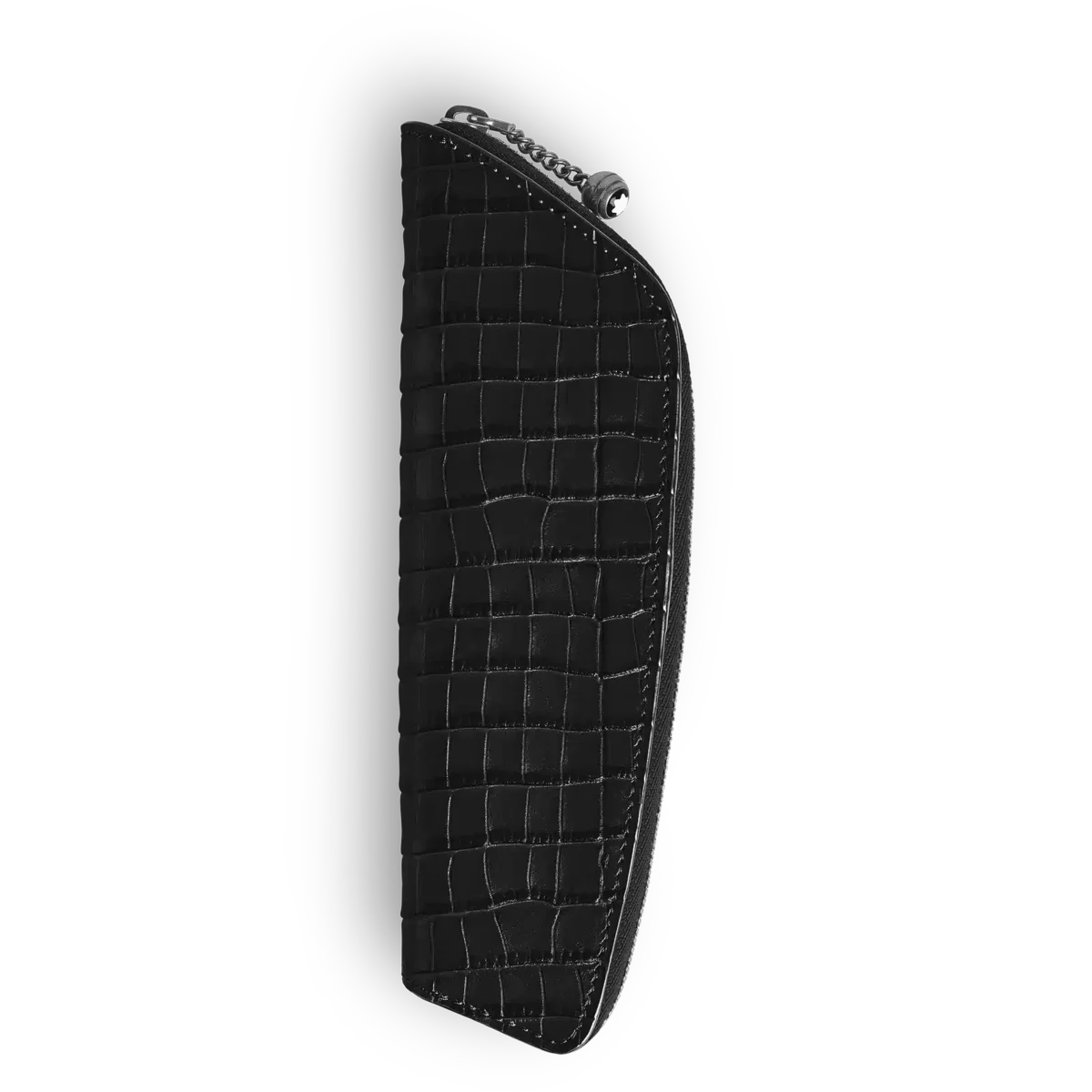 Husa pentru stilouri celebrează moștenirea Montblanc cu o notă modernă. Realizată din piele neagră cu imprimeu croco, aceasta prezintă fermoarul cu lanț și emblemă sferică, inspirat de o husă pentru stilouri Montblanc din arhivă, una dintre primele creații din piele ale mărcii. Concepută pentru a depozita un instrument de scris, precum Meisterstück Classique sau LeGrand, această husă elegantă îmbină stilul distinctiv cu practicitatea de zi cu zi.