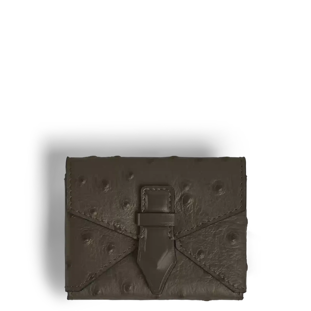 Acest elegant portcard, confecționat din piele luxoasă de culoare kaki cu imprimeu de struț, combină textura distinctivă cu practicitatea de zi cu zi. Dotat cu un mâner detașabil pentru transport versatil, este conceput pentru a păstra carduri și mărunțiș. Finisat cu închizătoare cu capsă în formă de peniță, acest accesoriu compact este o combinație elegantă de rafinament și funcționalitate.