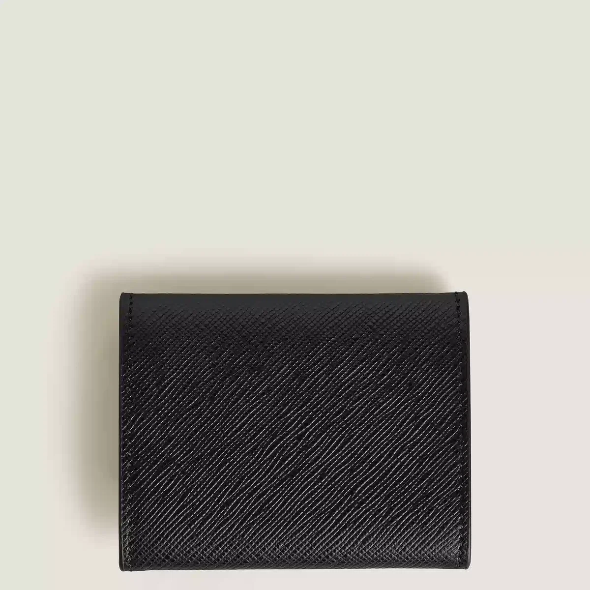 Elegantă și compactă, această portofelă pentru monede este confecționată din piele neagră embosată. Are un compartiment spațios pentru monede și este concepută pentru a se potrivi discret în buzunar.