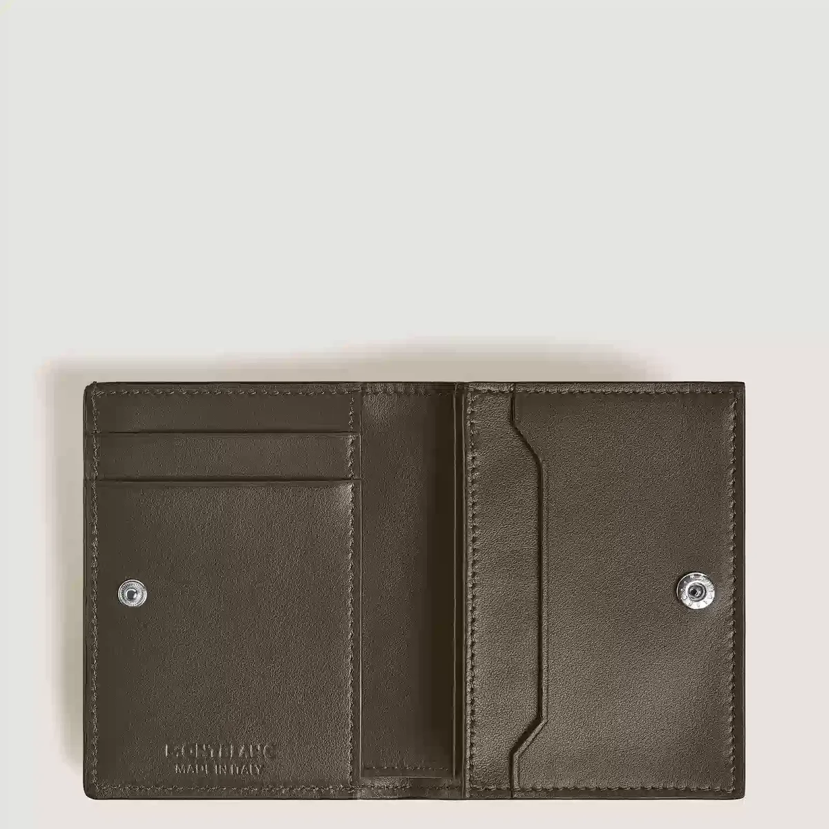 Cu silueta sa elegantă și pielea sofisticată Corteccia de culoare kaki, acest portofel continental mic este un accesoriu stilat pentru fiecare zi. Pielea embosată, îmbunătățită de un efect sfumato aplicat manual, adaugă profunzime și textură designului său rafinat. Compact, dar funcțional, are un buzunar principal cu fermoar, un compartiment pentru bancnote, trei sloturi pentru carduri de credit, două buzunare suplimentare și emblema Montblanc pe partea din față.