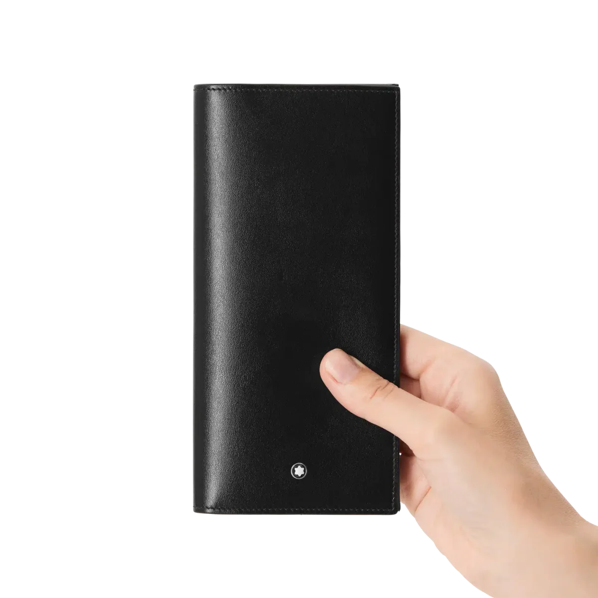 Un portofel elegant, conceput având în vedere funcționalitatea, Meisterstück 14cc are un buzunar mare cu fermoar pentru a păstra în siguranță monedele sau obiectele esențiale și poate acomoda 14 carduri de credit în compartimente dedicate. Portofelul sofisticat are, de asemenea, două compartimente pentru bancnote, plus două buzunare suplimentare pentru chitanțe. Confecționat din piele netedă, este căptușit cu țesătură neagră și finisat cu emblema Montblanc.