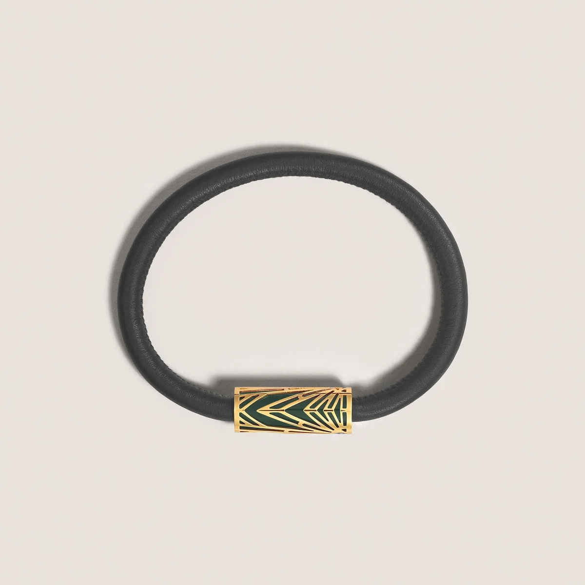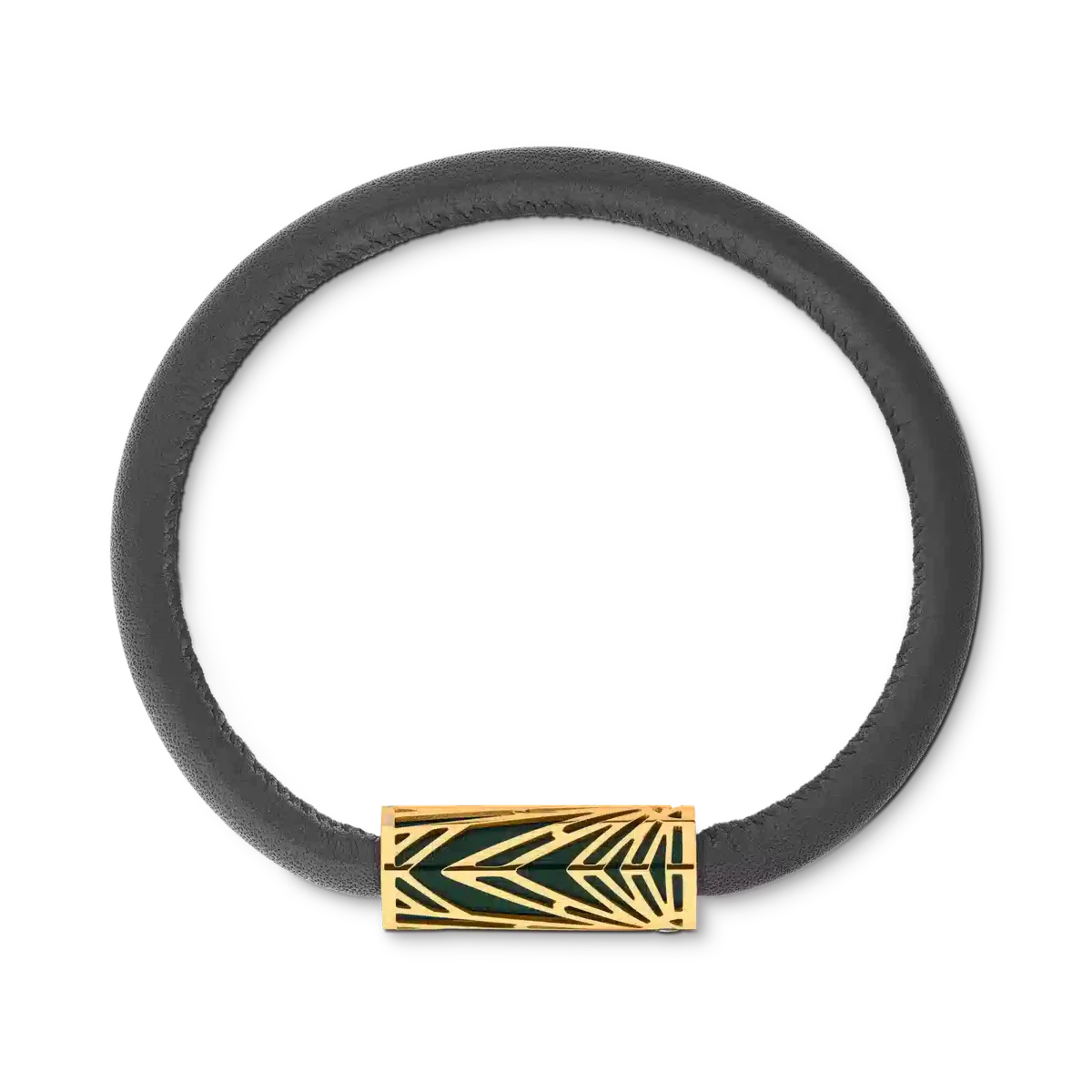 Bijuteria are o brățară din piele neagră și un tub din oțel inoxidabil cu acoperire PVD și lac verde (mărimea 68). Este inspirată din modelul Solitaire din arhivă.