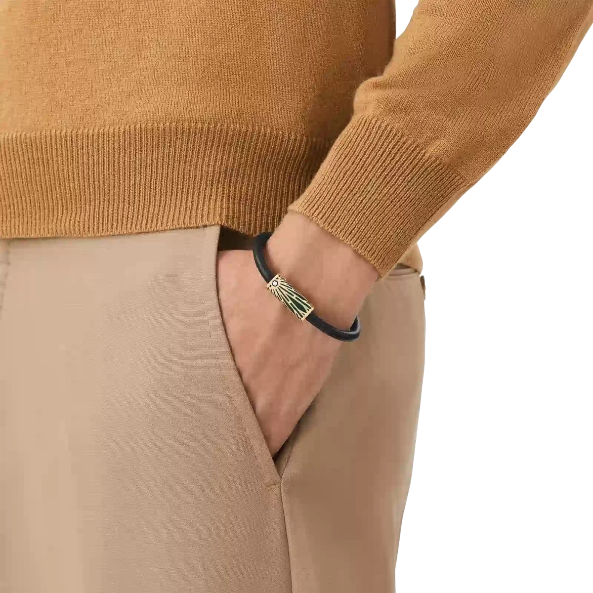 Bijuteria are o brățară din piele neagră și un tub din oțel inoxidabil cu acoperire PVD și lac verde (mărimea 60). Este inspirată din modelul Solitaire din arhivă.