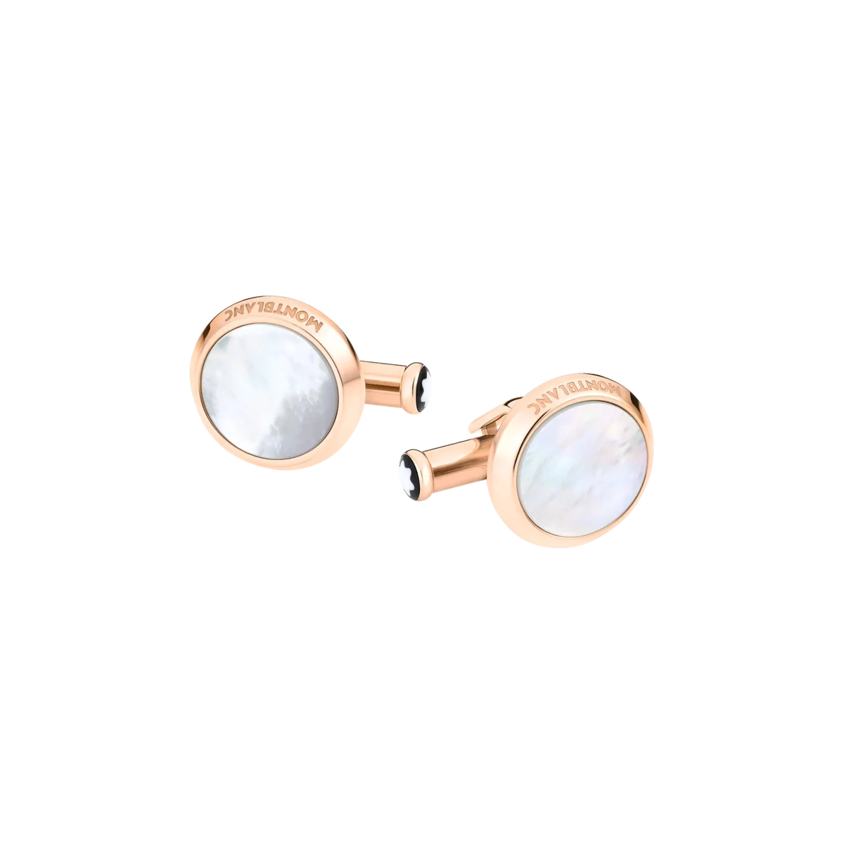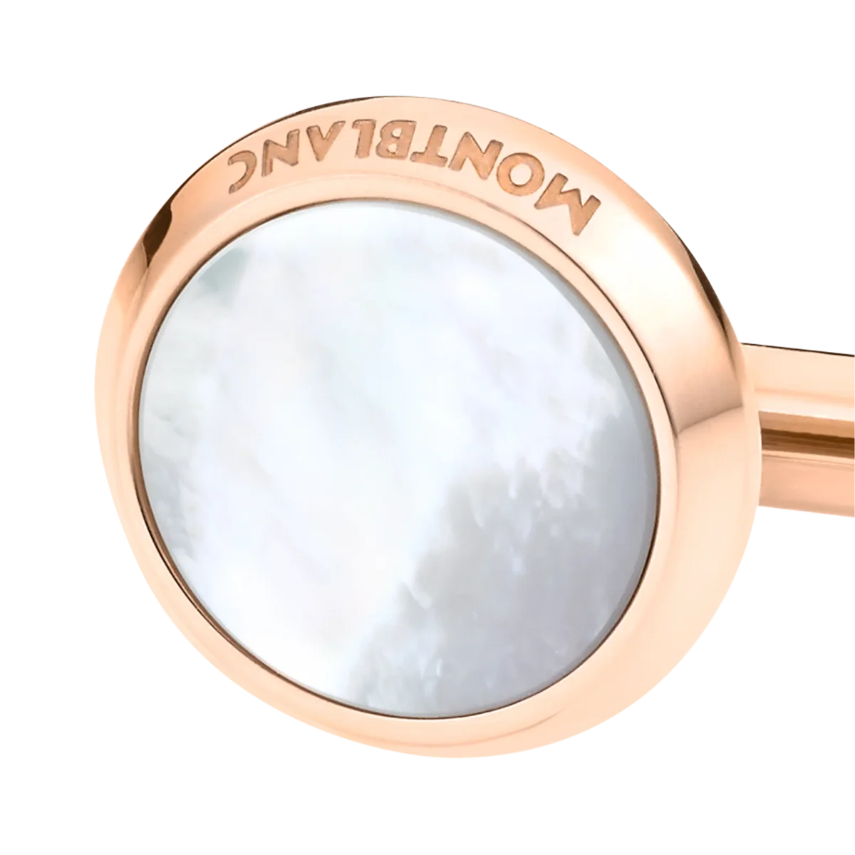 Butonii Meisterstück celebrează un stil atemporal. Legat de instrumentul de scris Montblanc Meisterstück, forma rotundă atemporală din oțel inoxidabil cu finisaj PVD de culoare auriu roz și incrustări din sidef creează o bijuterie cu o semnătură Montblanc puternică.