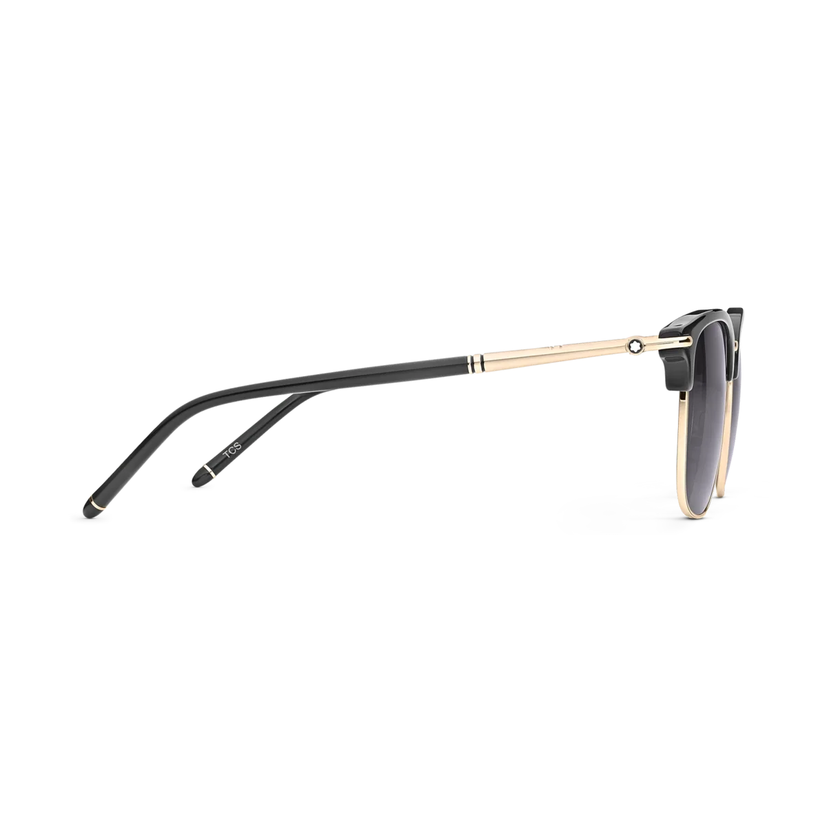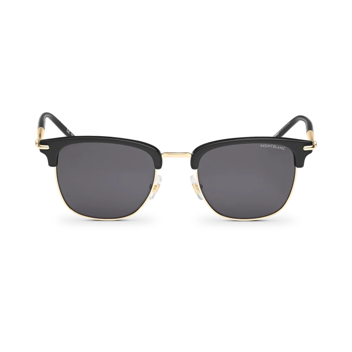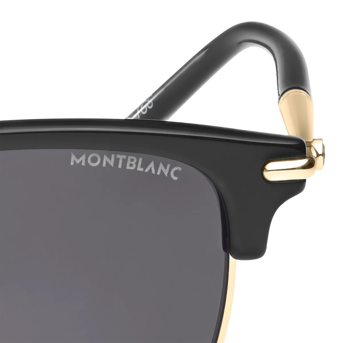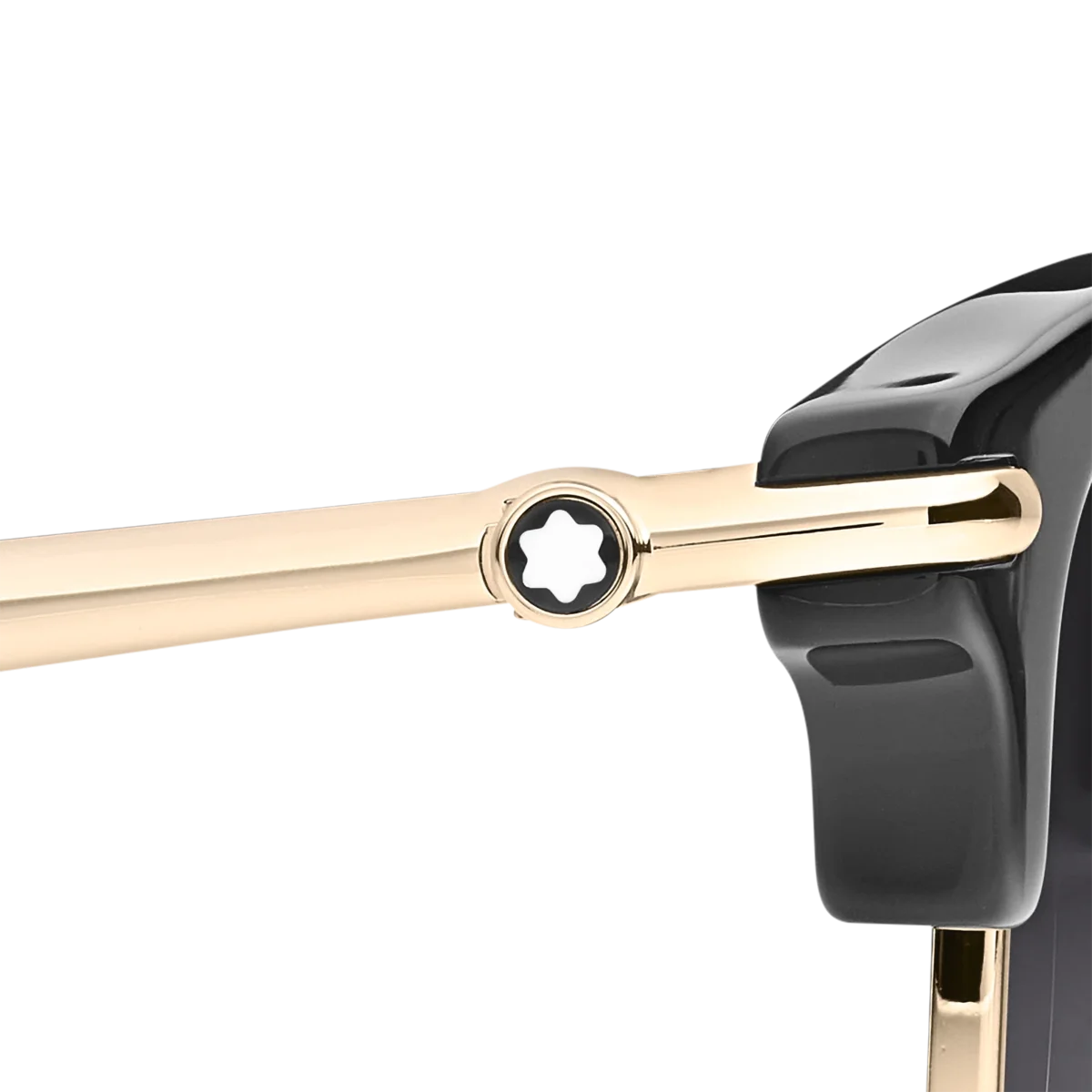 Acești ochelari de soare în stil dreptunghiular au o ramă injectată de culoare neagră și lentile gri. Emblema Montblanc Snowcap este încorporată în braț, iar logo-ul Montblanc este gravat cu laser pe lentila stângă. Detaliul cu trei inele de pe braț amintește de colecția Montblanc Meisterstück.