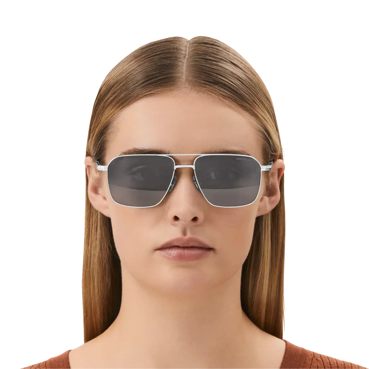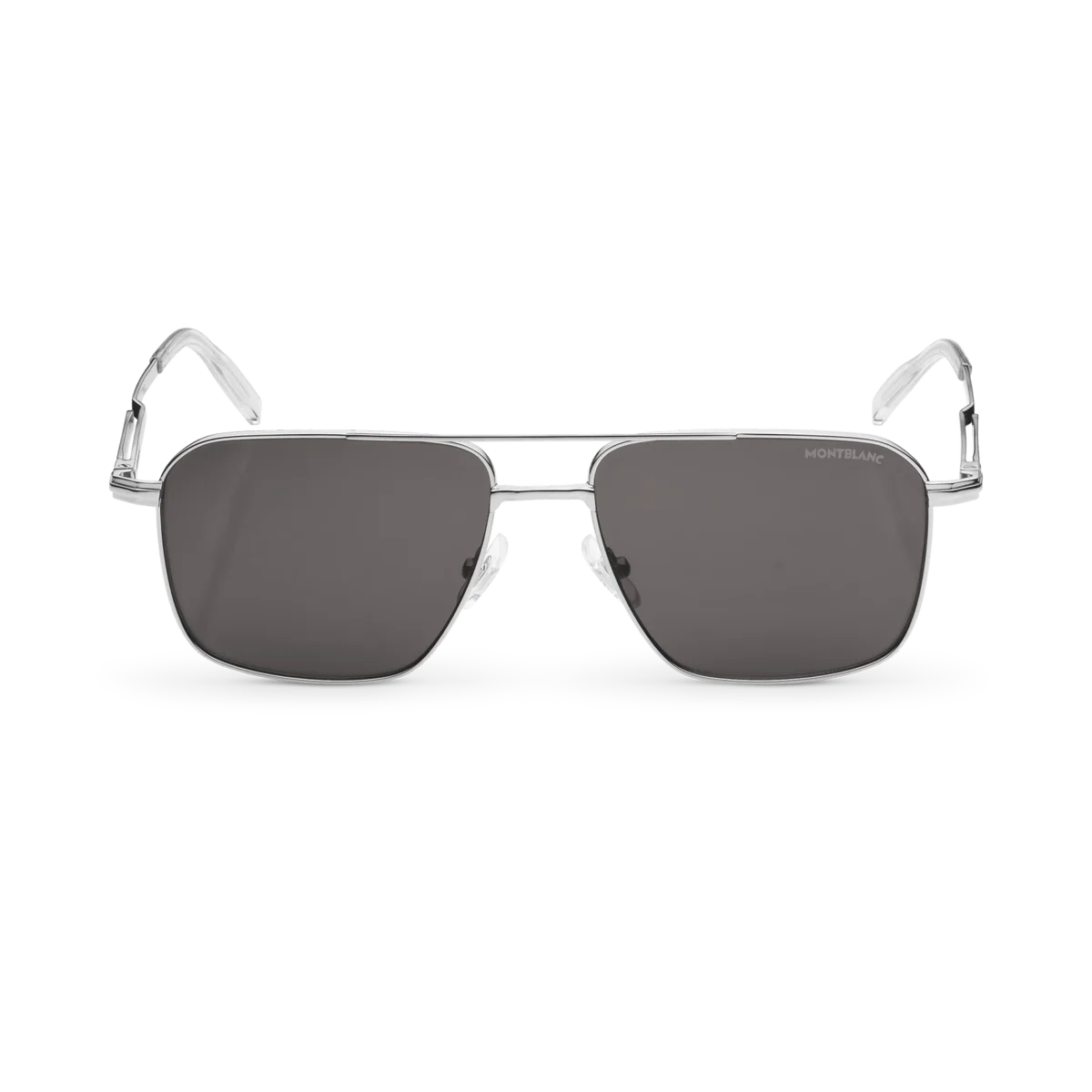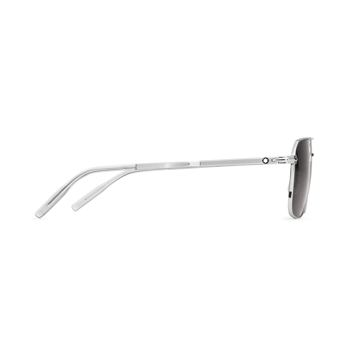 Acești ochelari de soare în stil dreptunghiular au o ramă metalică argintie și lentile de culoare gri. Au o punte metalică dublă în partea din față. Detaliul argintiu al clemei este elementul central al designului brațelor. Acesta celebrează un element important al instrumentului de scris Meisterstück, care permite, de asemenea, agățarea ramei de buzunare. Emblema Montblanc cu vârful acoperit de zăpadă este încorporată în detaliul clemei brațului, iar logo-ul Montblanc este gravat cu laser pe lentila stângă.