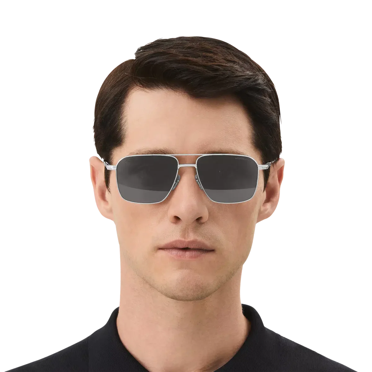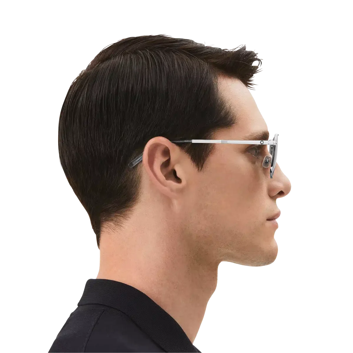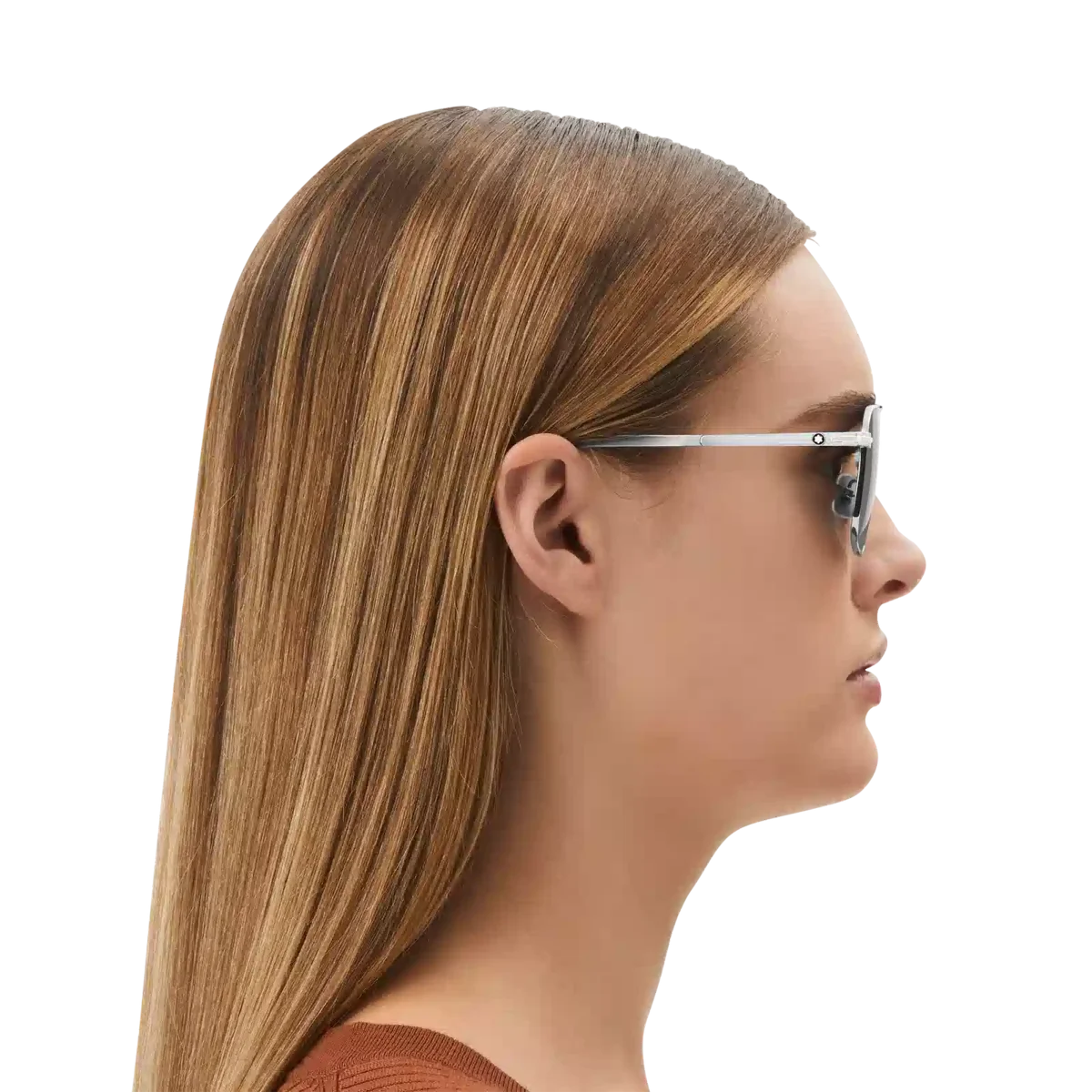 Acești ochelari de soare în stil dreptunghiular au o ramă metalică argintie și lentile de culoare gri. Au o punte metalică dublă în partea din față. Detaliul argintiu al clemei este elementul central al designului brațelor. Acesta celebrează un element important al instrumentului de scris Meisterstück, care permite, de asemenea, agățarea ramei de buzunare. Emblema Montblanc cu vârful acoperit de zăpadă este încorporată în detaliul clemei brațului, iar logo-ul Montblanc este gravat cu laser pe lentila stângă.