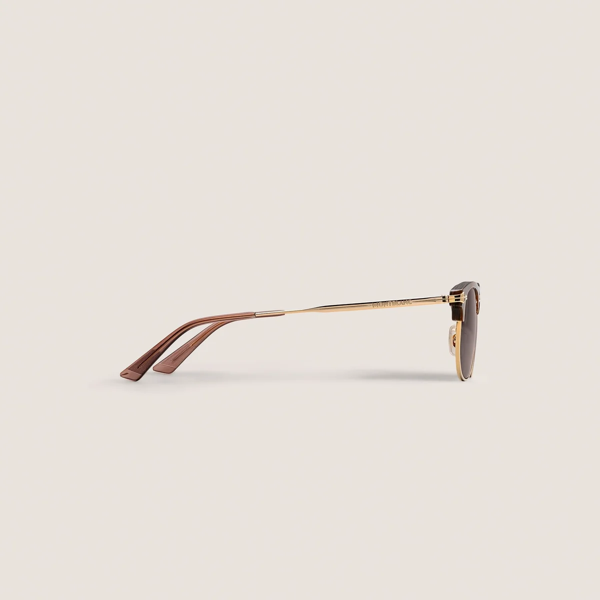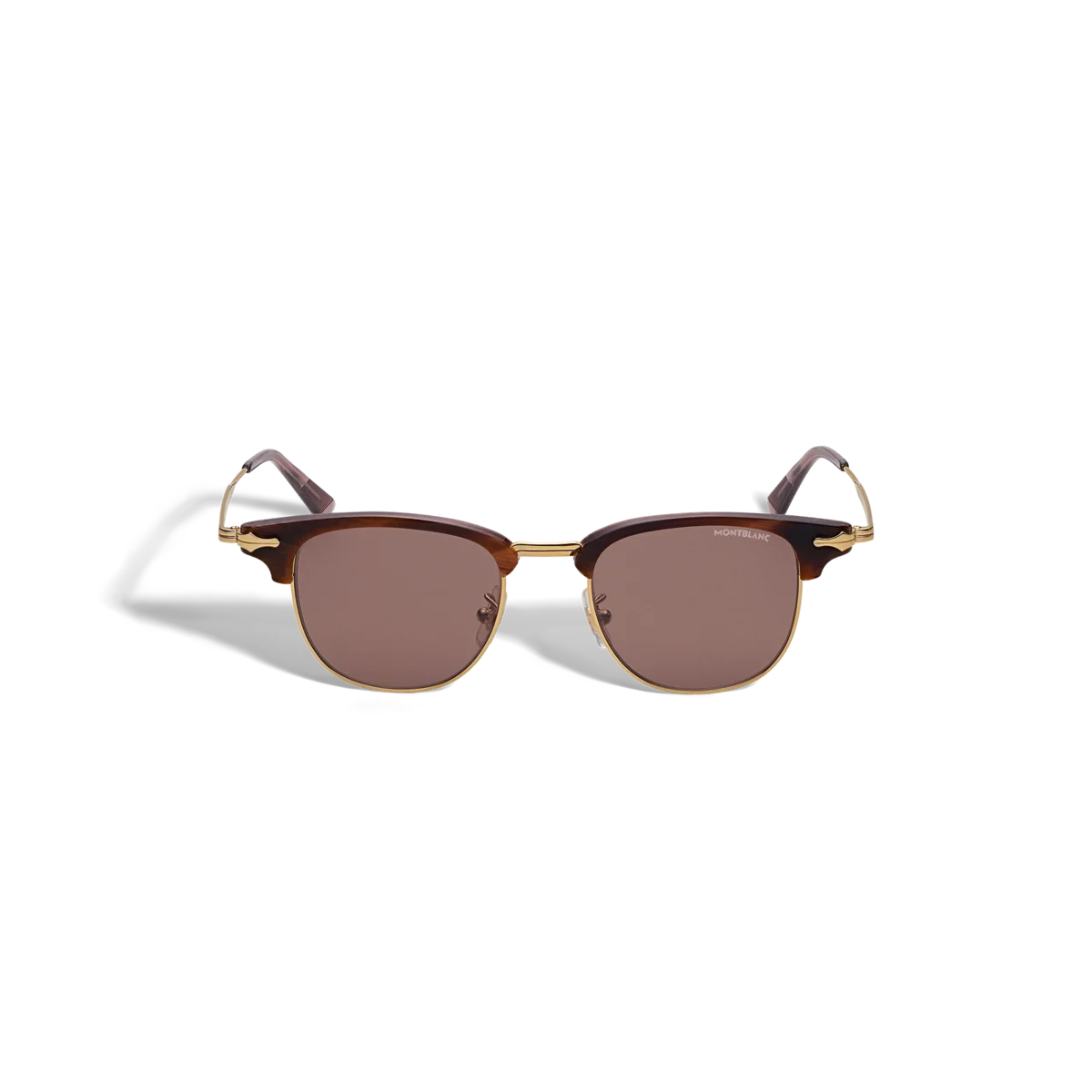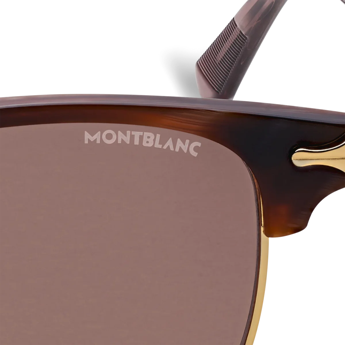 Acești ochelari de soare în stil dreptunghiular au o ramă metalică aurie și lentile maro. Inspirat de designul peniței instrumentelor de scris, un detaliu decorativ în formă de peniță este prezent pe designul brațelor metalice. Logo-ul Montblanc este gravat cu laser pe lentila stângă, iar modelul antiderapant este gravat cu laser pe partea interioară a vârfurilor brațelor pentru a spori confortul.
