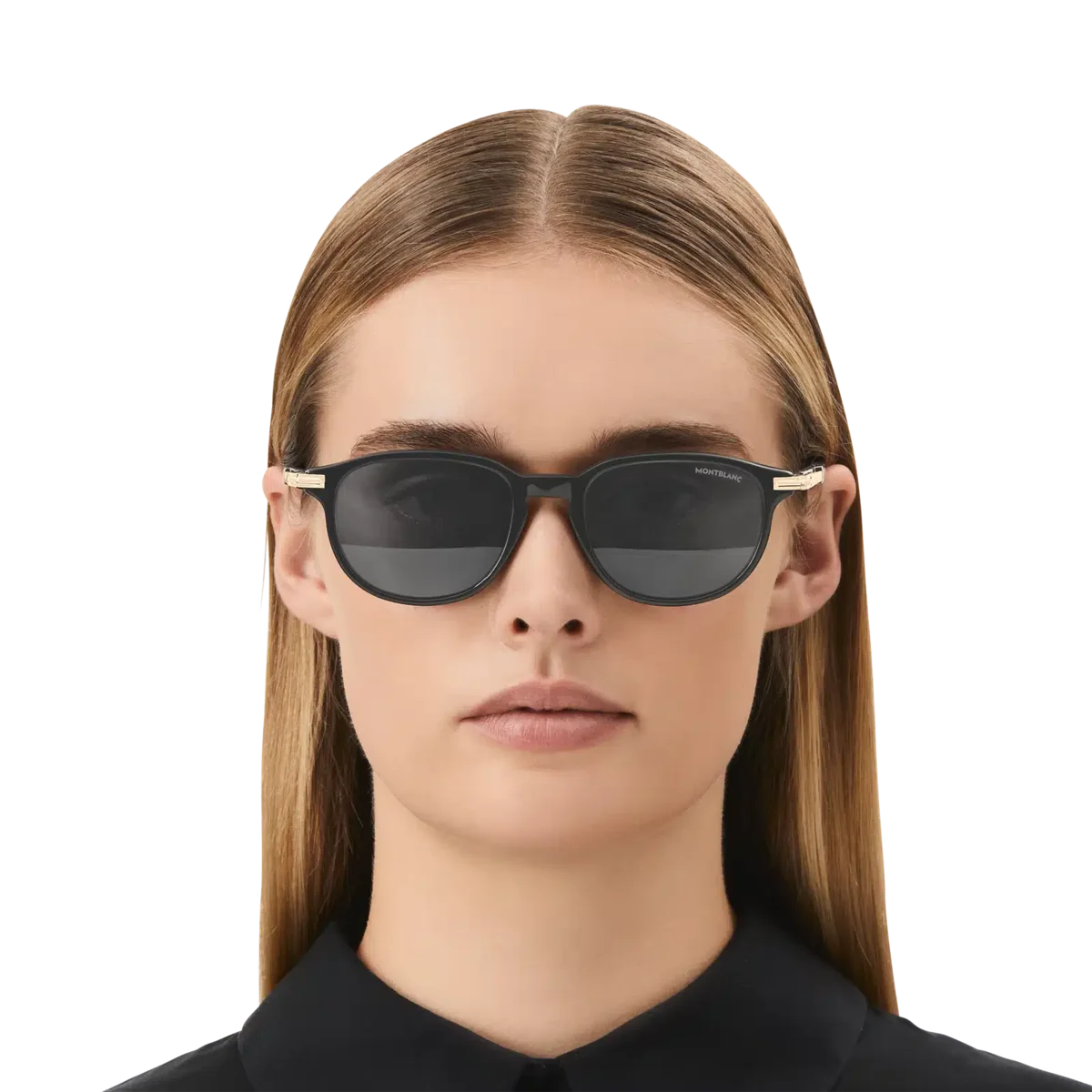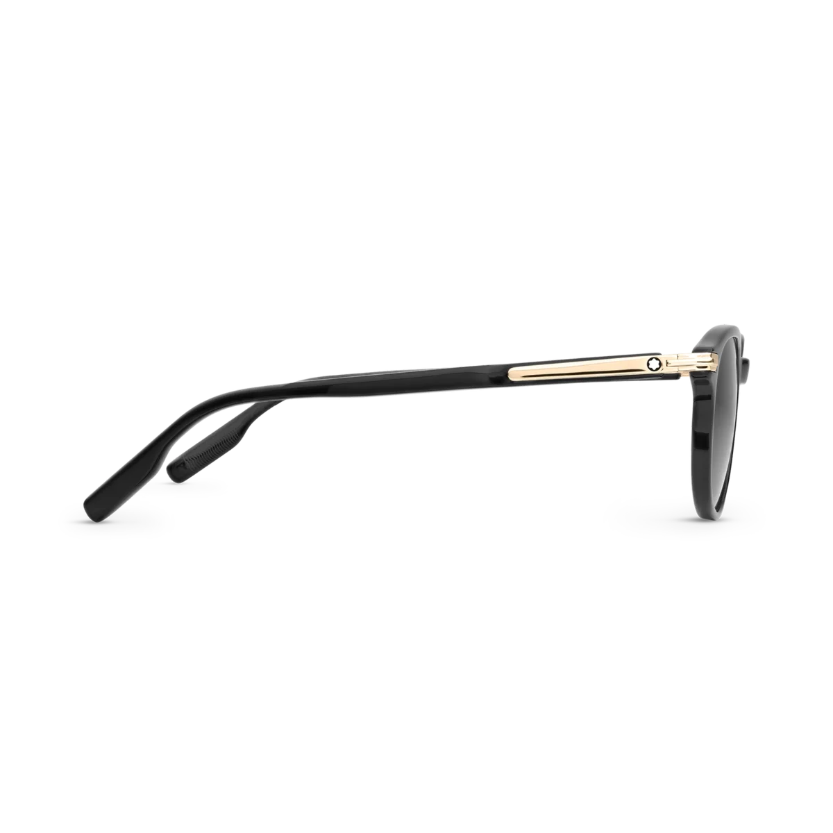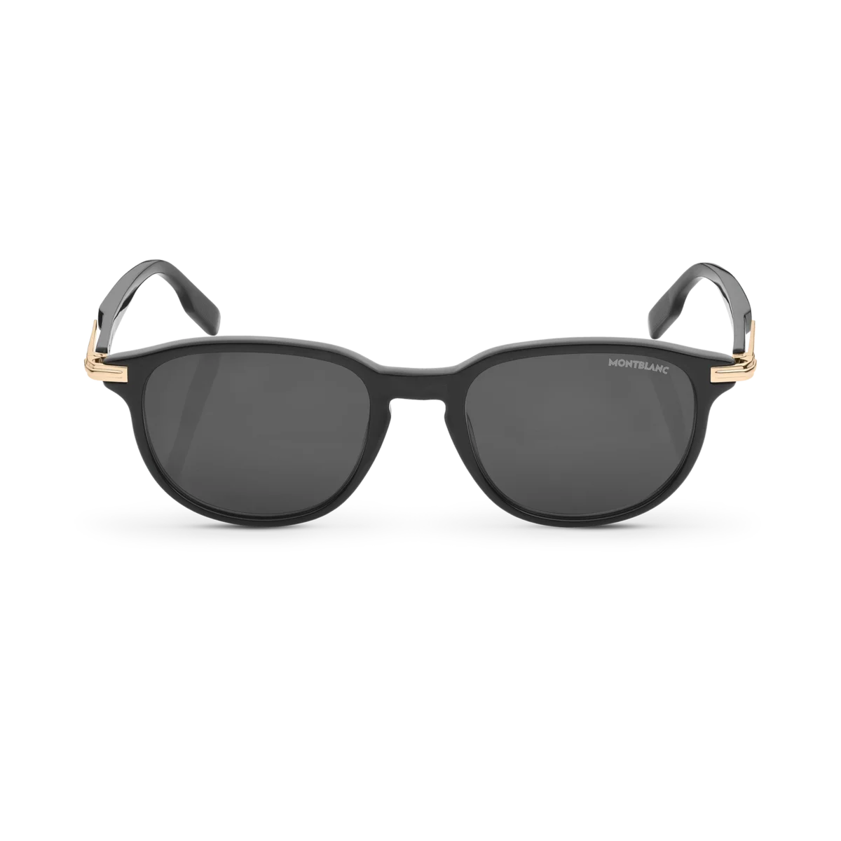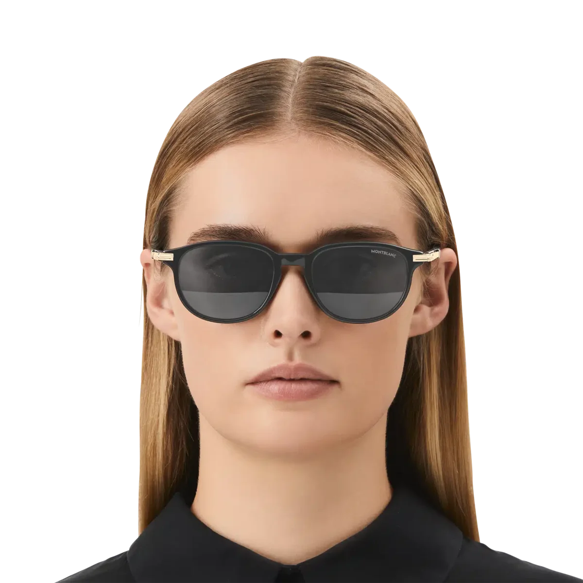 Acești ochelari de soare pătrați au o ramă din acetat de culoare neagră și lentile de culoare neagră. Detaliul clipului de culoare aurie este elementul central al designului brațelor. Acesta celebrează un element important al instrumentului de scris Meisterstück, care permite, de asemenea, agățarea ramei de buzunare. Emblema Montblanc cu vârful acoperit de zăpadă este încorporată în detaliul clipului de pe braț, iar logo-ul Montblanc este gravat cu laser pe lentila stângă.