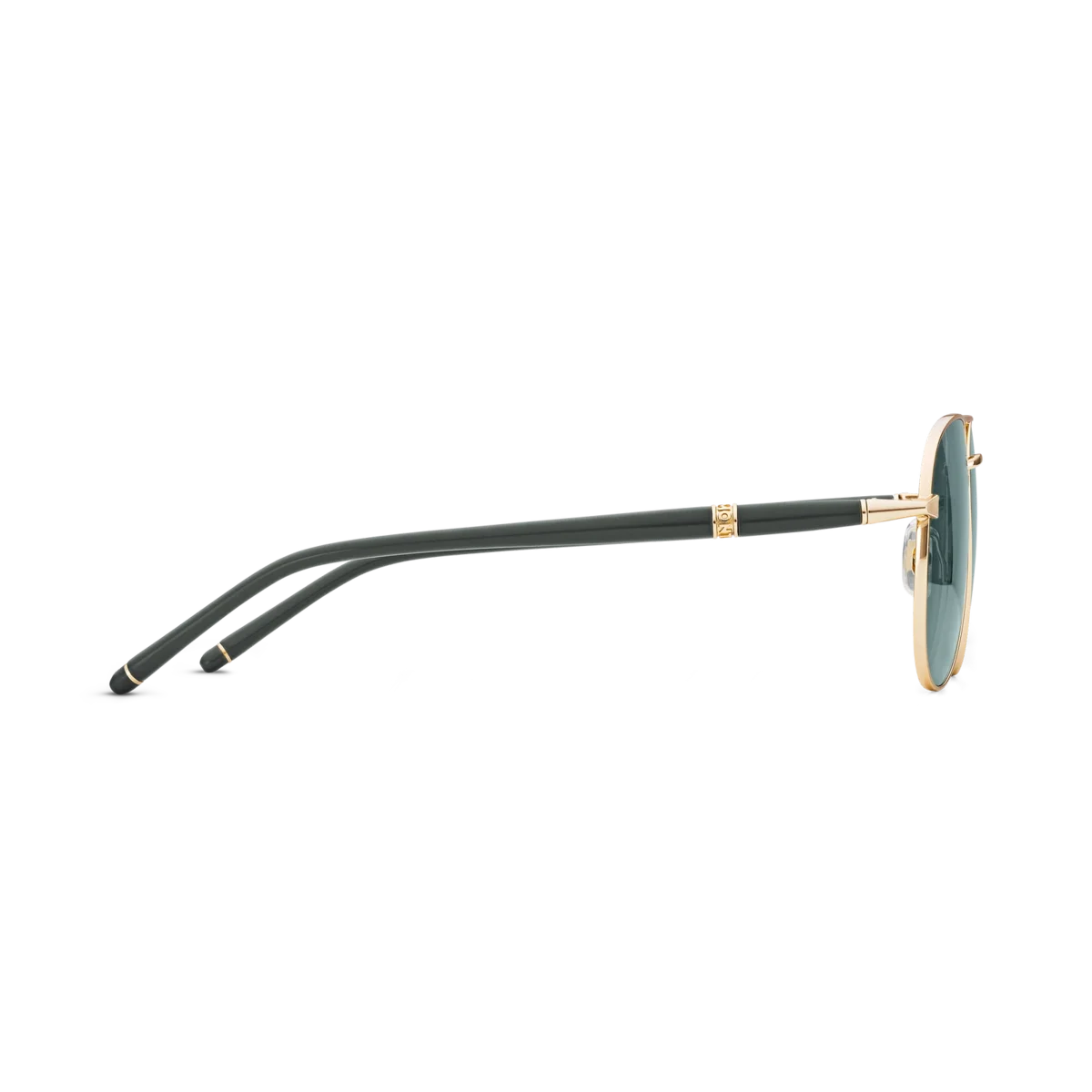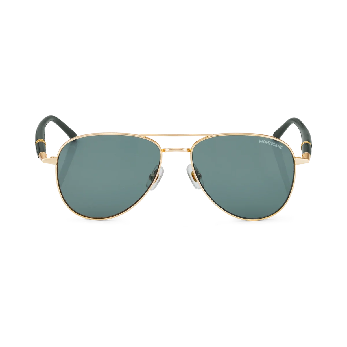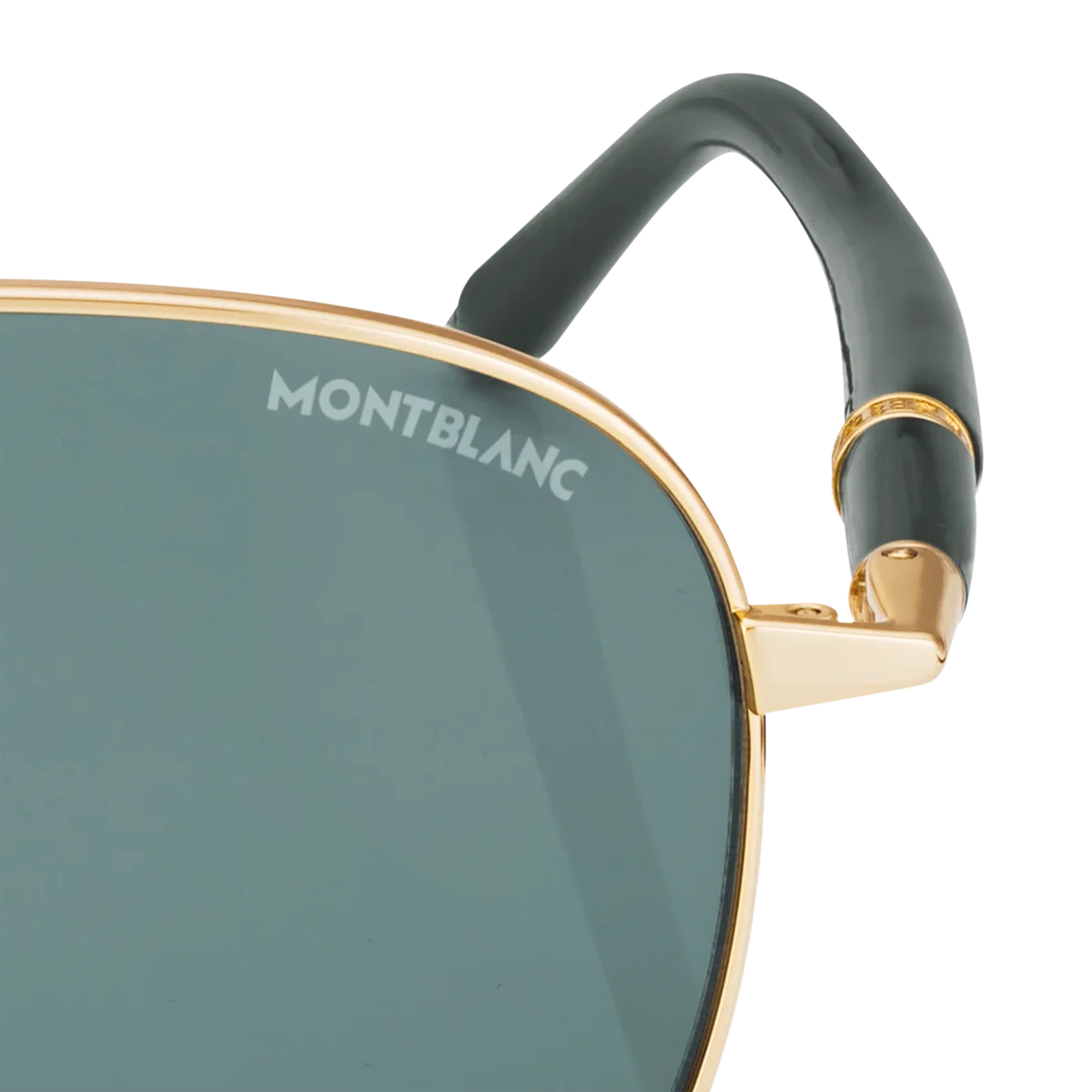 Acești ochelari de soare pătrați au o ramă metalică aurie și lentile verzi. Au o punte dublă metalică în partea din față. Brațele tubulare, inspirate de instrumentele de scris Meisterstück, sunt îmbogățite cu un detaliu cu trei inele. Logo-ul Montblanc este gravat cu laser pe lentila stângă, iar vârfurile brațelor sunt încrustate cu un detaliu din email negru.