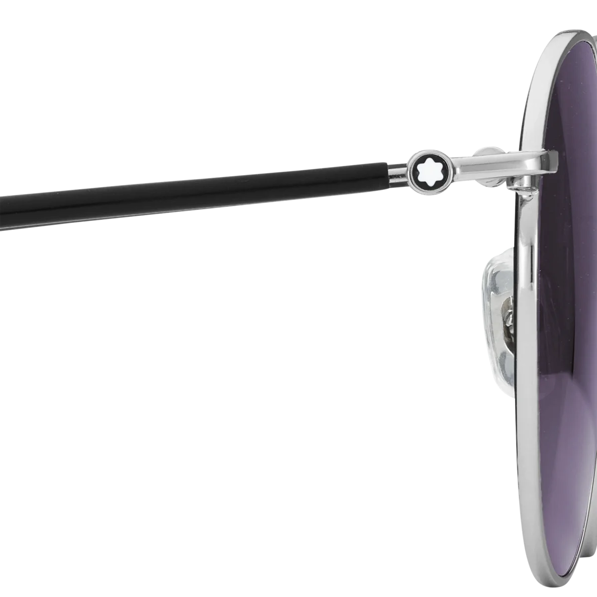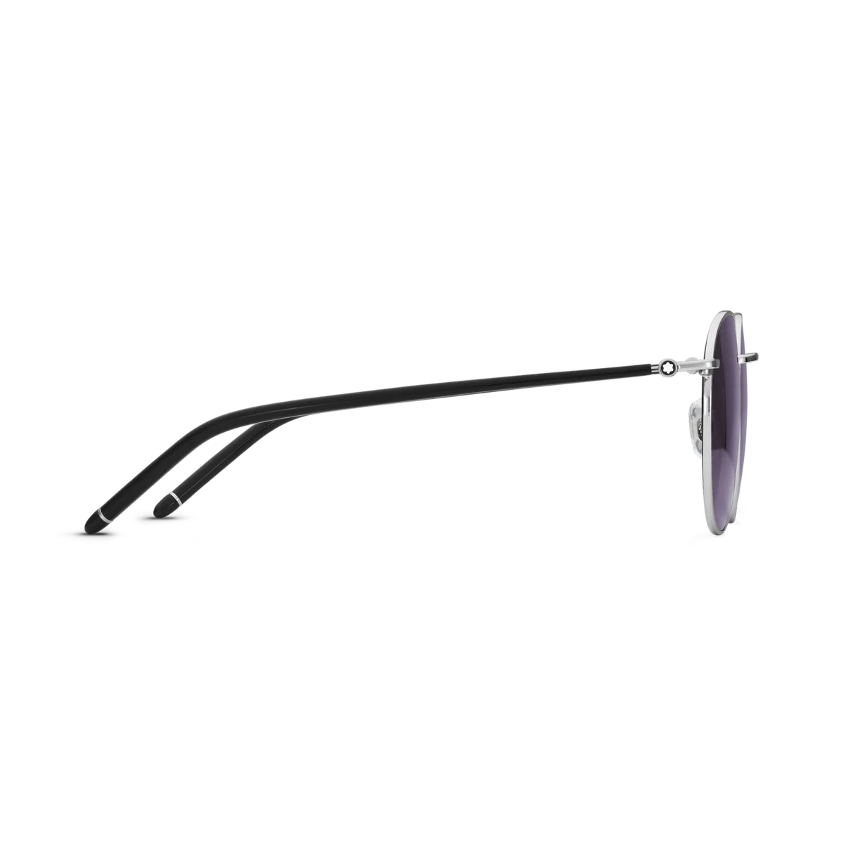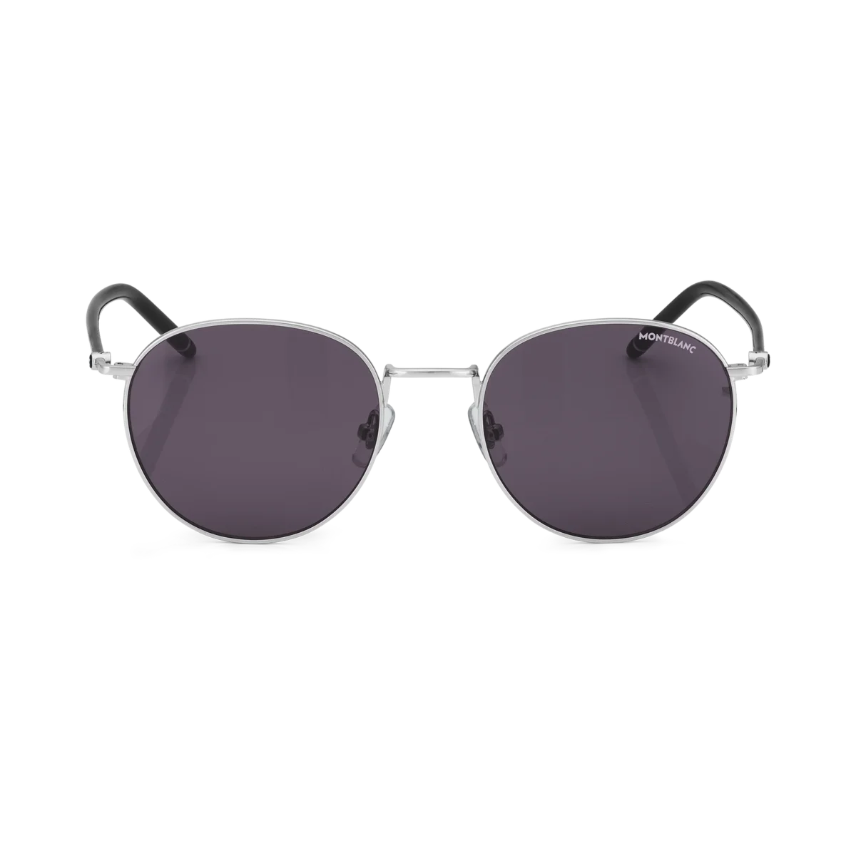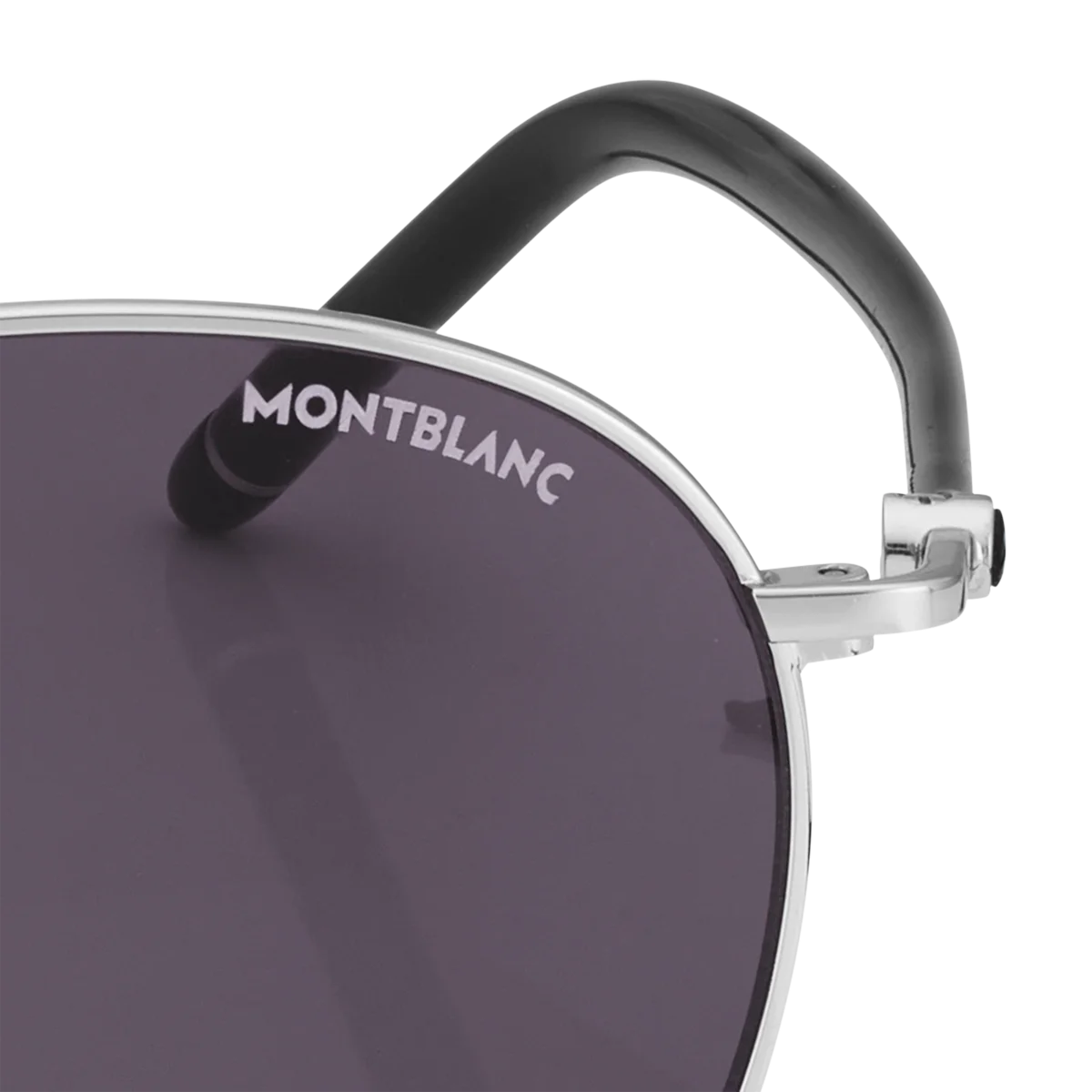 Acești ochelari de soare rotunzi au o ramă metalică argintie și lentile gri. Brațele tubulare sunt inspirate de instrumentele de scris Meisterstück și îmbogățite cu un detaliu din email negru la vârfurile brațelor. Logo-ul Montblanc este gravat cu laser pe lentila stângă, iar logo-ul cu vârful de zăpadă este încorporat în braț.
