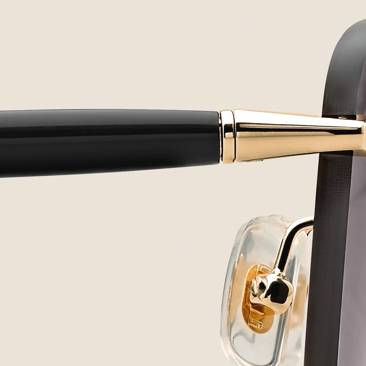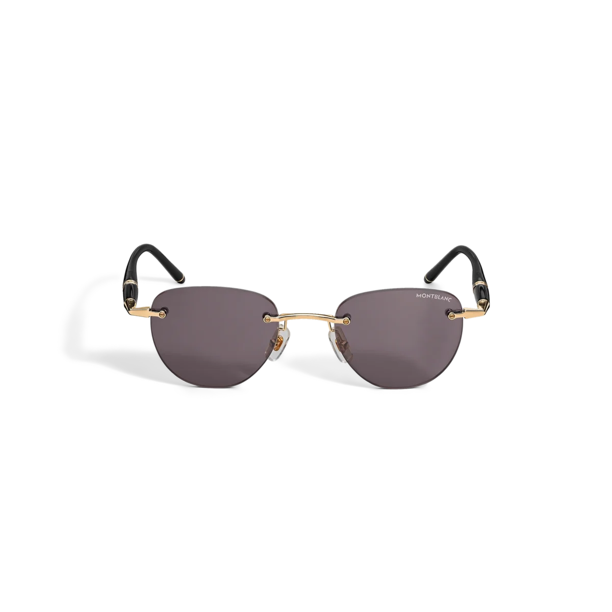 Acești ochelari de soare fără ramă, în stil rotund, au o ramă metalică aurie și lentile gri. Brațele tubulare, inspirate de instrumentele de scris Meisterstück, sunt îmbogățite cu inscripția Montblanc. Logo-ul Montblanc este gravat cu laser pe lentila stângă.