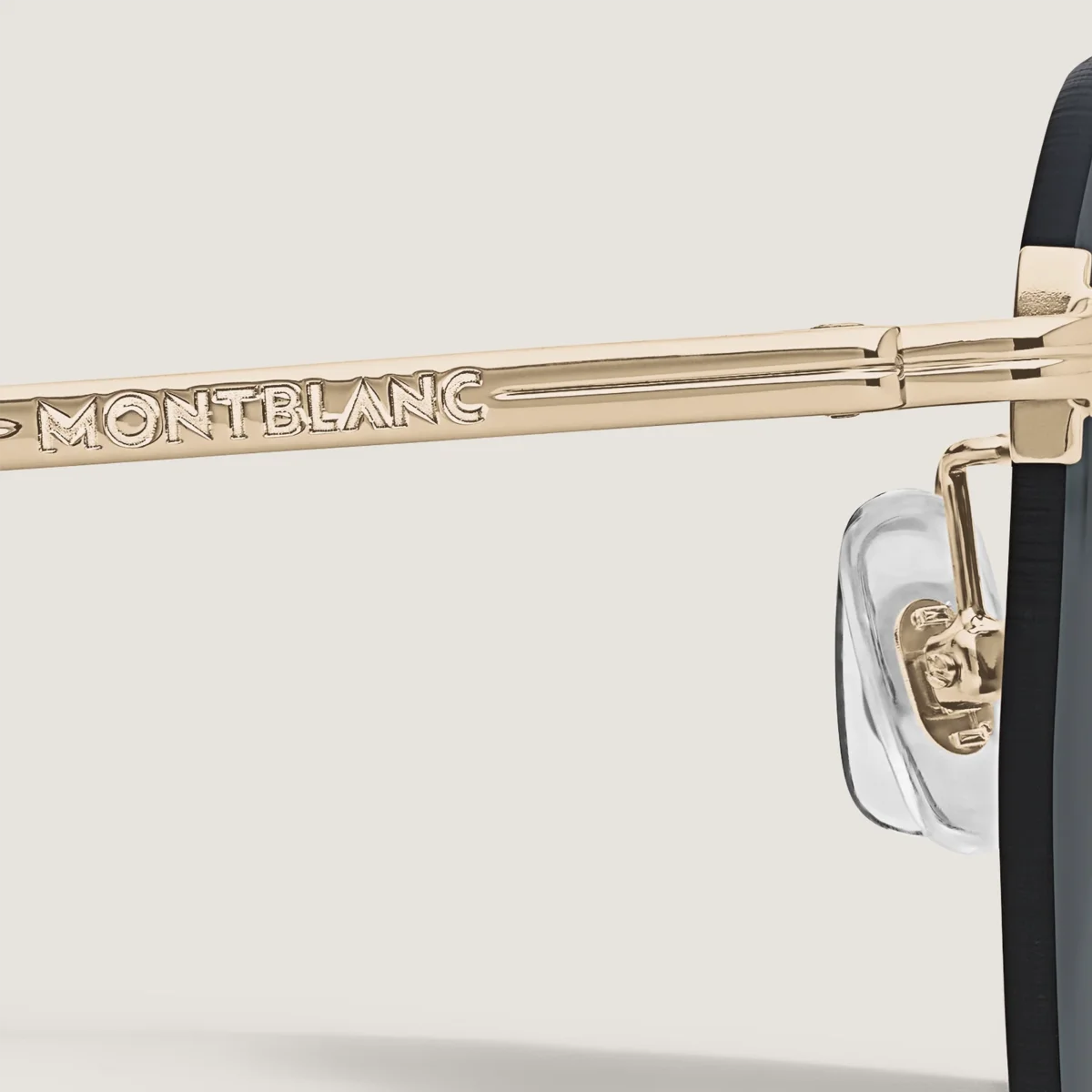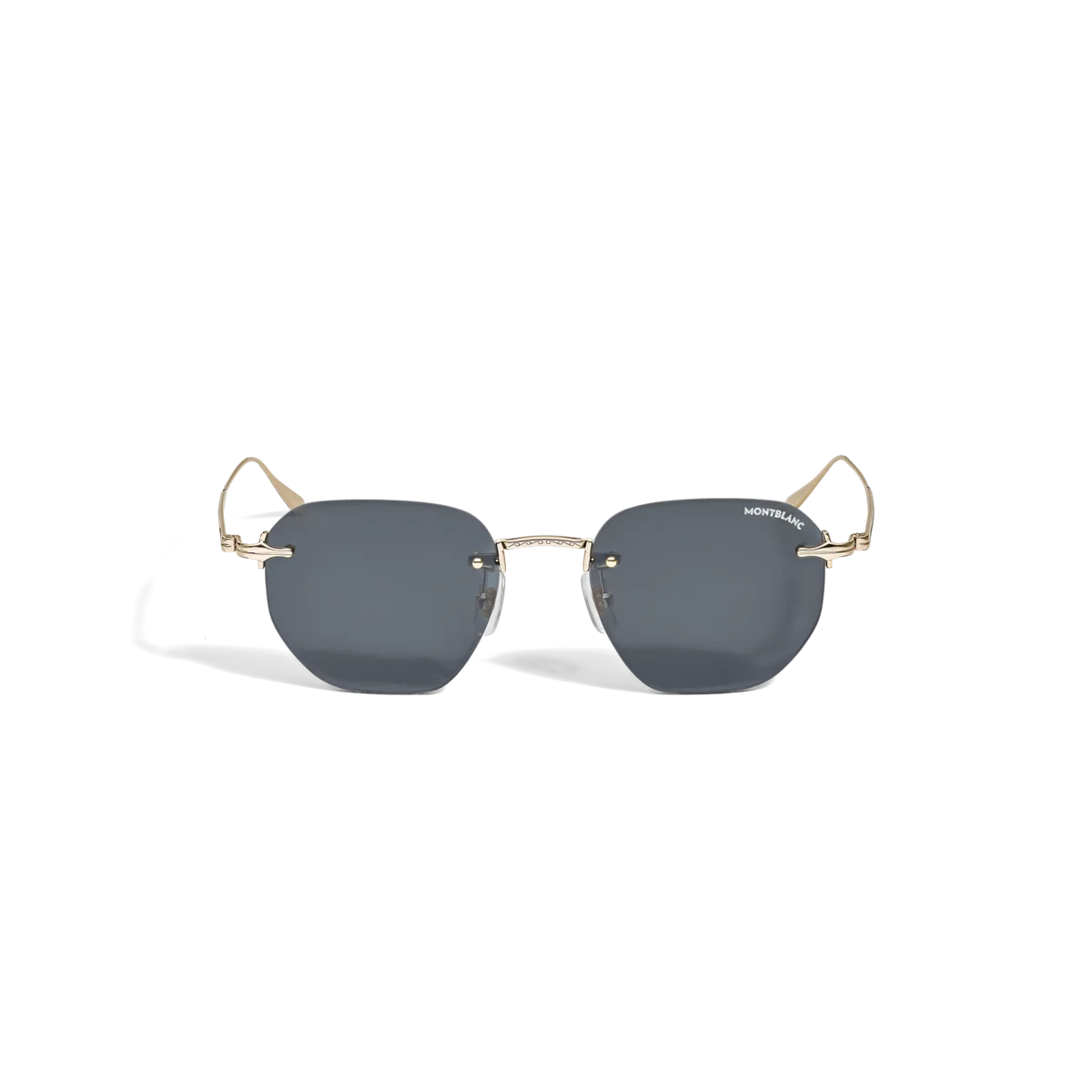 Acești ochelari de soare rotunzi au o ramă metalică aurie și lentile gri. Inspirați de designul peniței instrumentelor de scris, un detaliu decorativ în formă de peniță este prezent pe designul metalic al brațelor. Logo-ul Montblanc one line este gravat pe partea dreaptă a brațului, iar logo-ul este gravat cu laser pe lentila stângă și un detaliu decorativ este gravat pe capetele brațului.