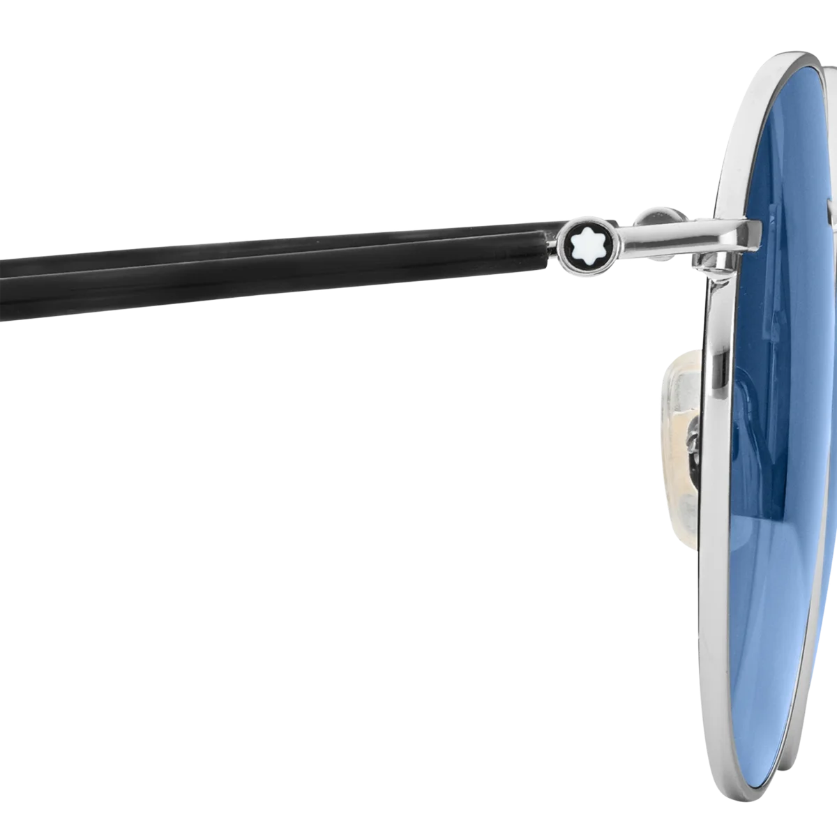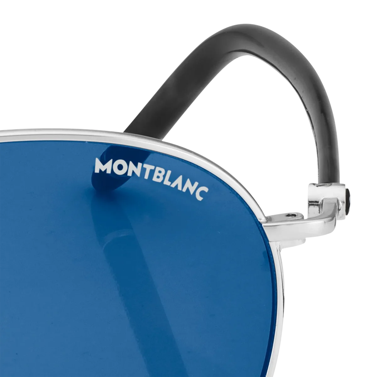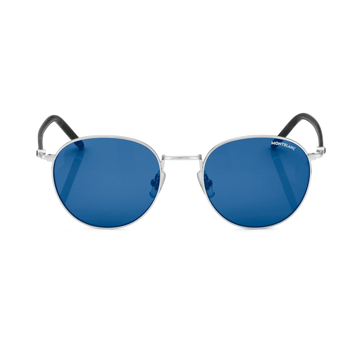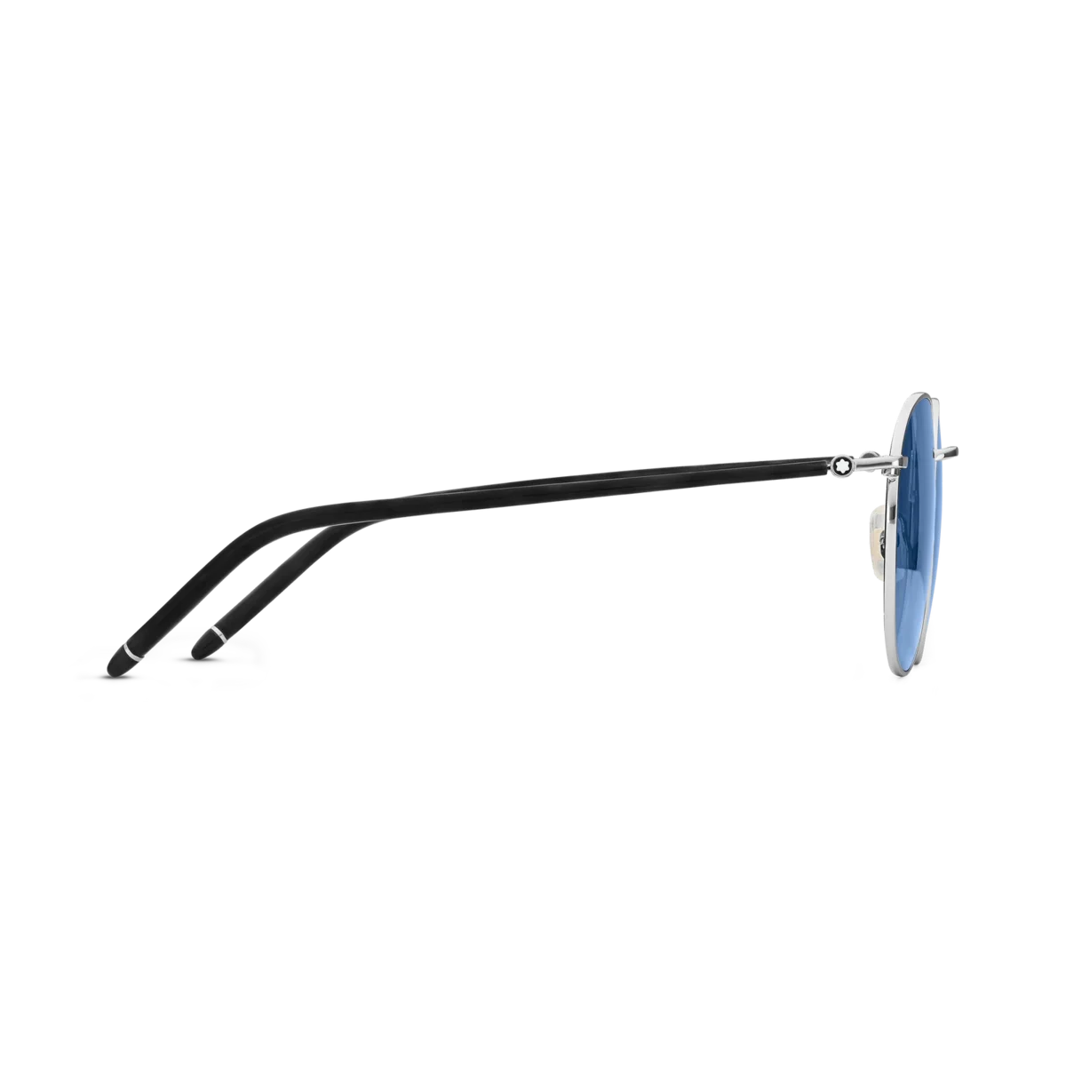 Acești ochelari de soare rotunzi au o ramă metalică de culoare ruteniu și lentile albastre. Brațele tubulare sunt inspirate de instrumentele de scris Meisterstück și îmbogățite cu un detaliu din email negru pe vârfurile brațelor. Logo-ul Montblanc este gravat cu laser pe lentila stângă, iar logo-ul cu vârful de zăpadă este încorporat pe braț.