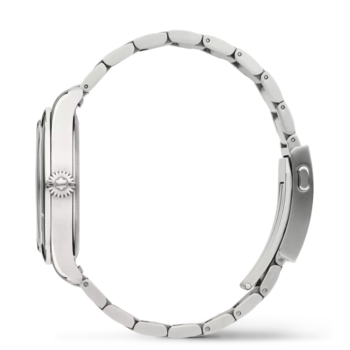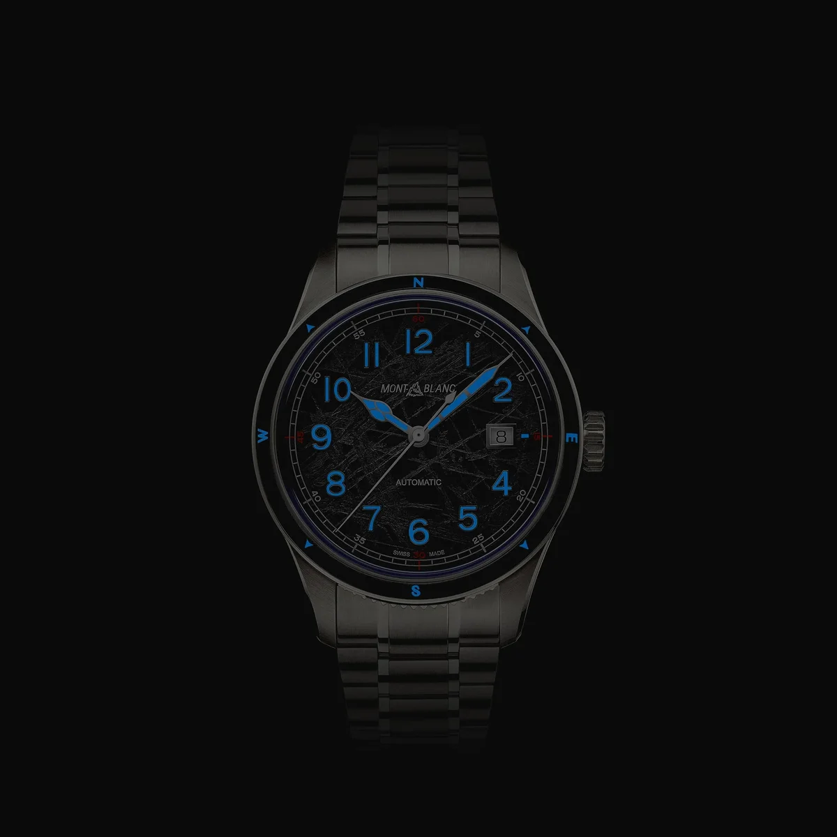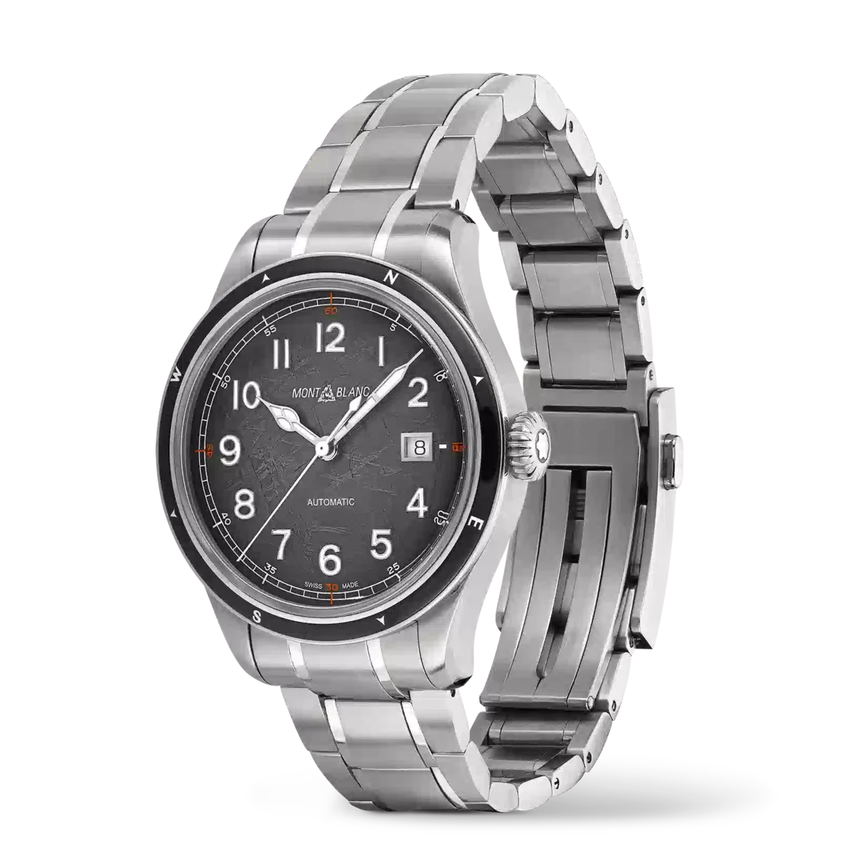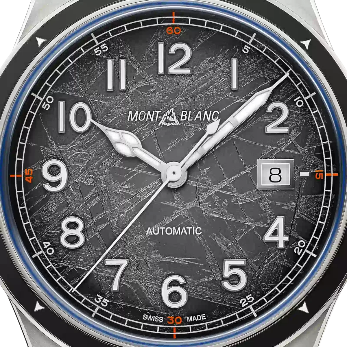 În semn de omagiu adus celor mai înalte vârfuri din lume și alpinistilor care îndrăznesc să le escaladeze în condiții extreme, Montblanc 1858 Automatic Date 0 Oxygen The 8000 este încorporat într-o carcasă din oțel inoxidabil de 41 mm, complet lipsită de oxigen. Aceasta prezintă mai multe avantaje pentru exploratori, eliminând aburirea și prevenind oxidarea, permițând astfel mecanismului să funcționeze mult mai mult timp cu o precizie mai mare. Ceasul este alimentat de calibrul automat MB 24.17 și este dotat cu o ramă din ceramică neagră cu puncte cardinale luminescente, un cadran gri închis cu model sfumato glacier și accente portocalii, luminescență albastră și un capac posterior cu gravura „Spirit of Exploration”. La fel ca și celelalte modele din această colecție capsulă, Montblanc 1858 Automatic Date 0 Oxygen The 8000 este prevăzut cu o brățară conică din oțel inoxidabil interschimbabilă, cu un sistem de reglare fină. Nr. de identificare: MB130984