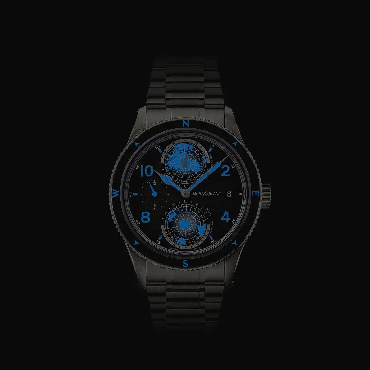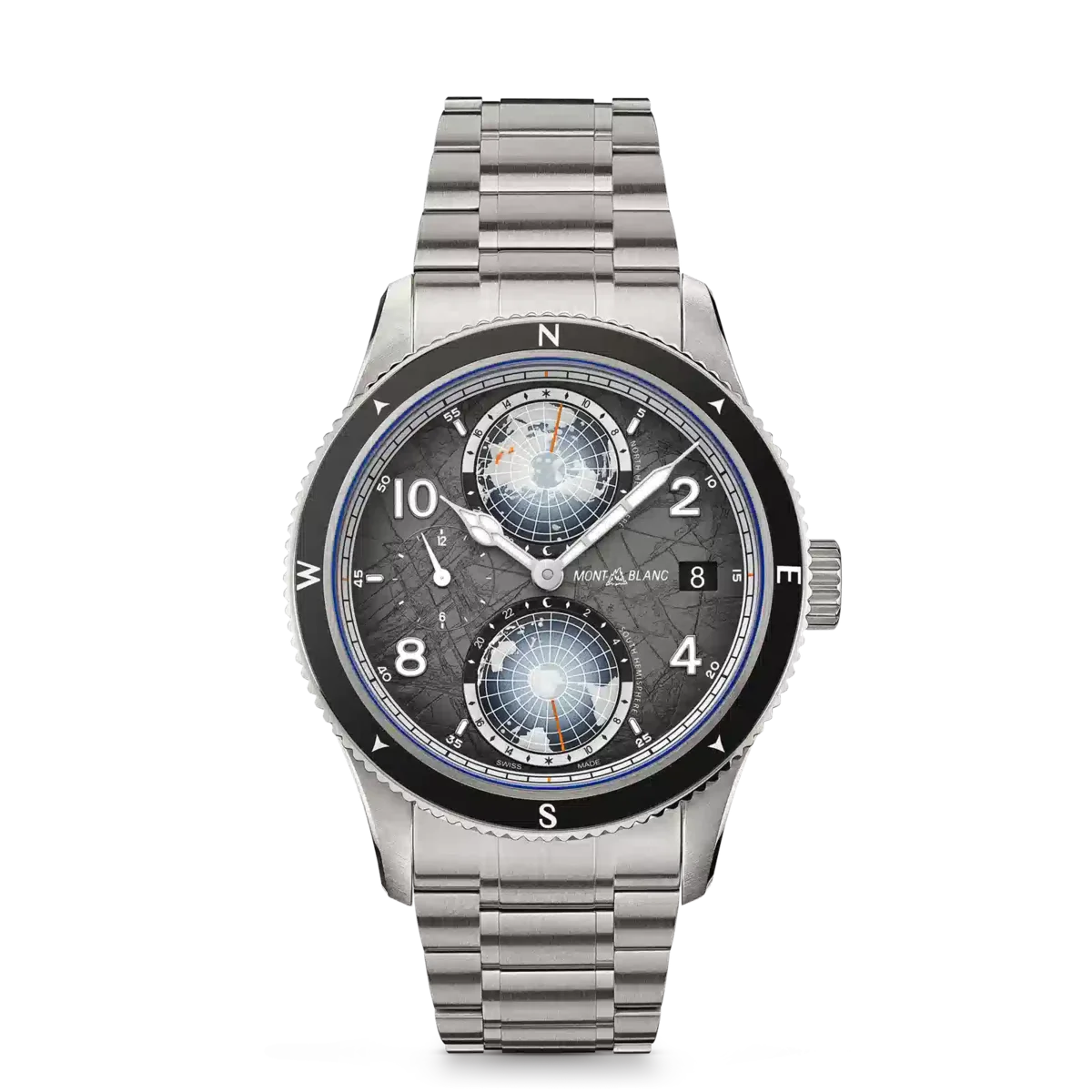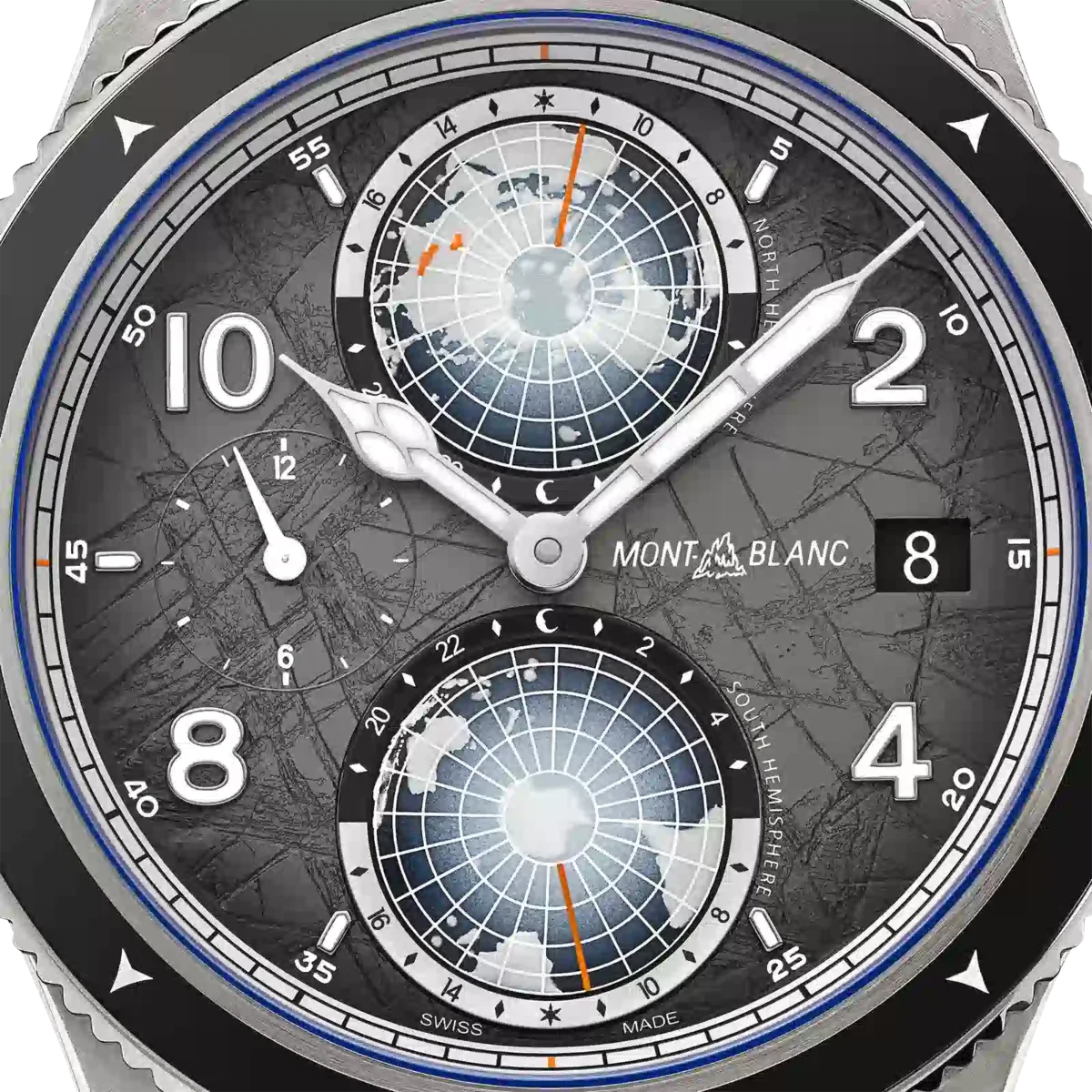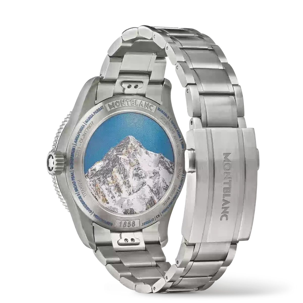 În semn de omagiu adus celor mai înalte vârfuri din lume și alpinistilor care îndrăznesc să le escaladeze în condiții extreme, acest Montblanc 1858 Geosphere 0 Oxygen The 8000 este încorporat într-o carcasă din titan de 42 mm, complet lipsită de oxigen. Aceasta prezintă mai multe avantaje pentru exploratori, eliminând aburirea și prevenind oxidarea, permițând astfel mecanismului să dureze mult mai mult timp cu o precizie mai mare. Ceasul este alimentat de mecanismul automat MB 29.25 cu complicație Manufacture Worldtime, care include ora zonelor de 24 de ore lizibile pe continentele luminescente ale globurilor rotative 3D ale emisferei nordice și sudice, indicații de zi și noapte, afișare duală a orei și dată. Ceasul este prevăzut, de asemenea, cu o ramă bidirecțională din ceramică neagră canelată, cu puncte cardinale luminescente, un cadran cu model sfumato gri închis, cu accente portocalii, și o brățară din titan interschimbabilă, cu un sistem de reglare fină și conică. Capacul din spate al acestui model prezintă o gravură laser 3D a muntelui K2, redat cu culori, profunzime și realism incredibile.