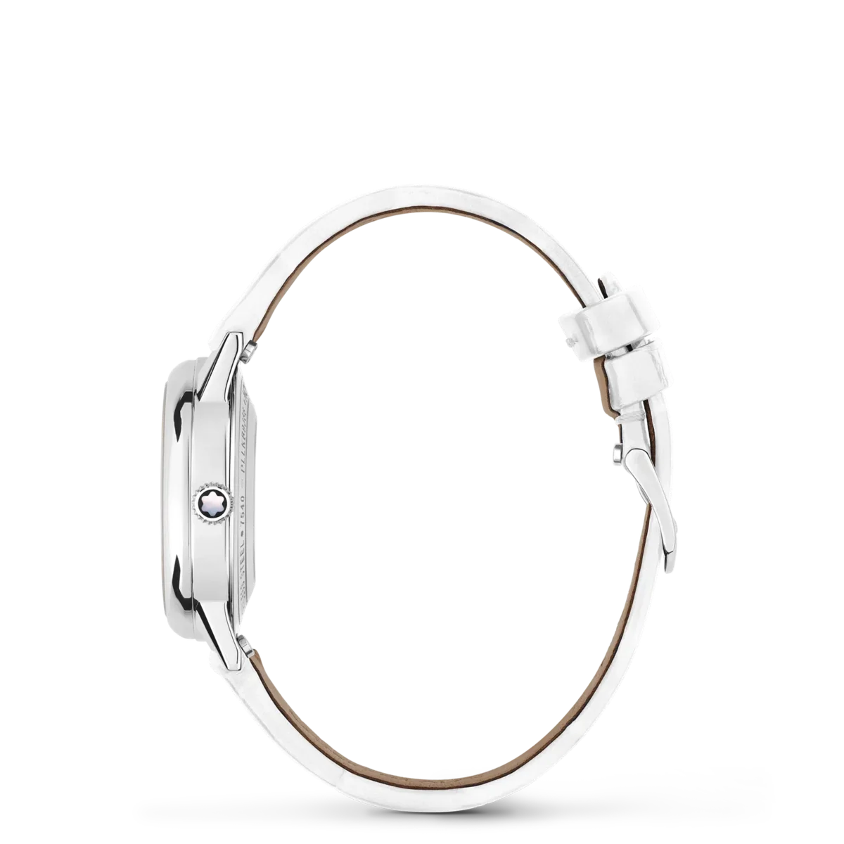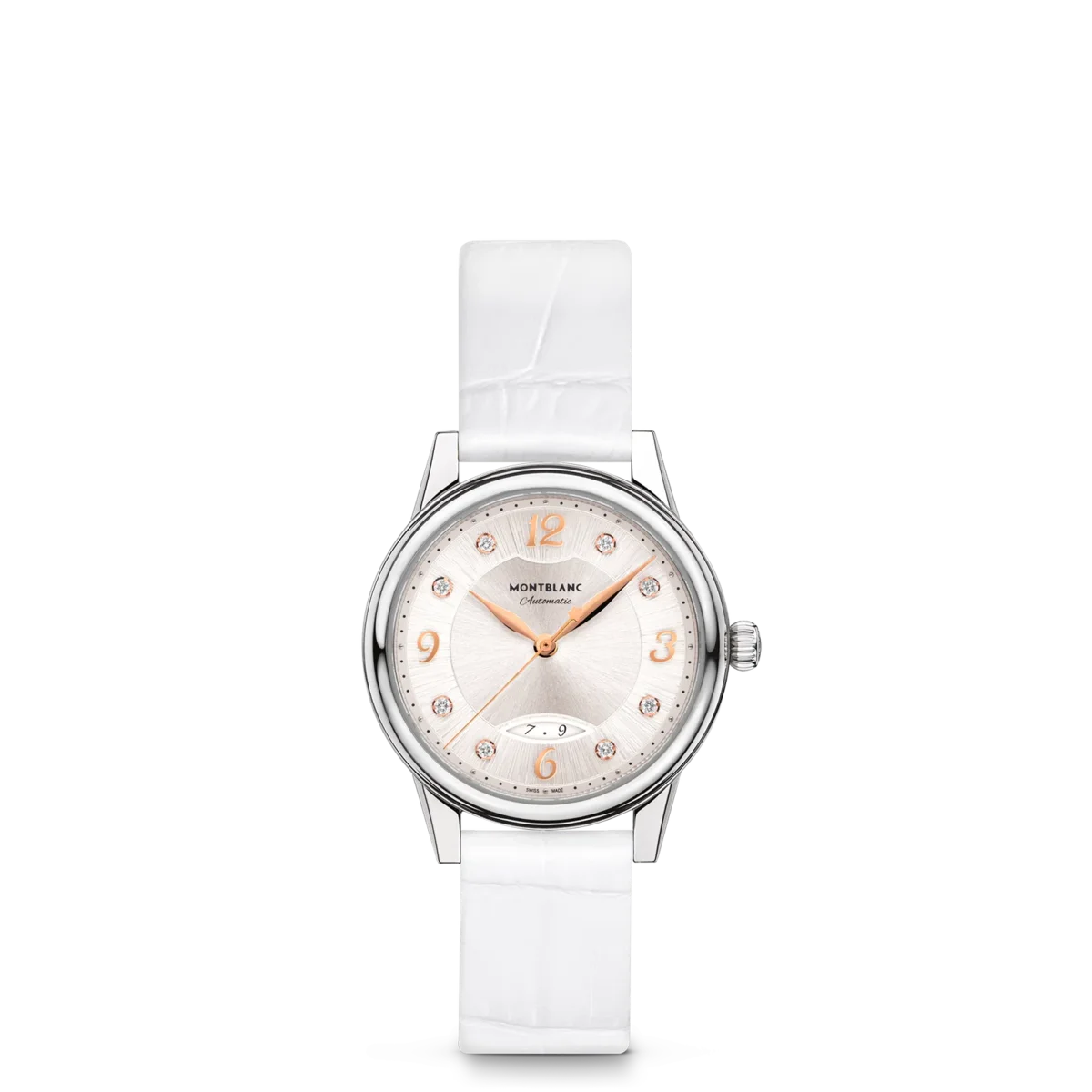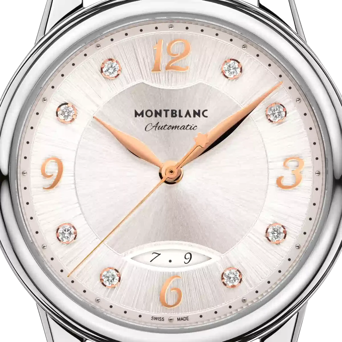 Interpretând codurile ceasornicăriei fine într-un mod elegant și feminin, Montblanc Bohème Automatic Date este inspirat din lumea scrisului de mână și vine într-o carcasă din oțel inoxidabil de 30 mm. Are un cadran elegant, argintiu-alb, cu finisaj satinat, împodobit cu indici din diamante, cifre arabe florale acoperite cu aur roz și mâini. Alte detalii rafinate includ un model filet sauté și o tehnică de ștanțare numită filé d’étoiles. Echipat cu calibrul automat MB 24.29, acest model indică orele, minutele și secundele, precum și data afișată într-o fereastră în formă de migdală cu cifre scrise de mână. Fontul romantic a fost aplicat și pe cadran pentru mențiunea „Automatic”. Acest ceas este echipat cu o curea interschimbabilă din piele de vițel albă cu imprimeu aligator și o curea suplimentară.
