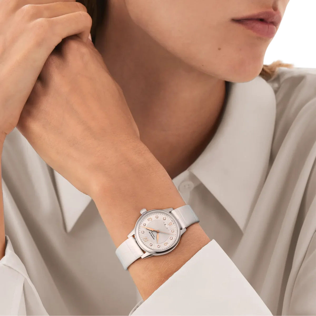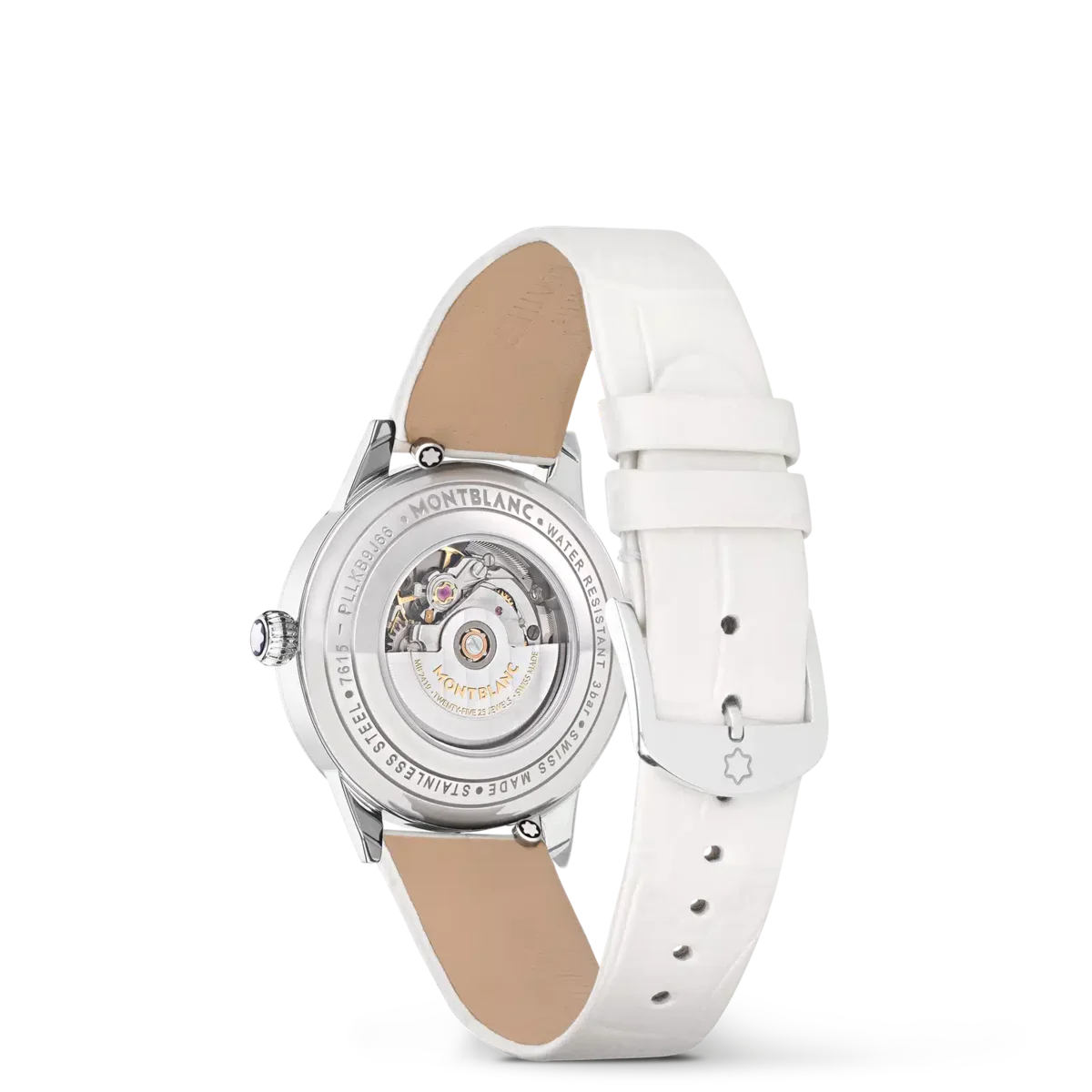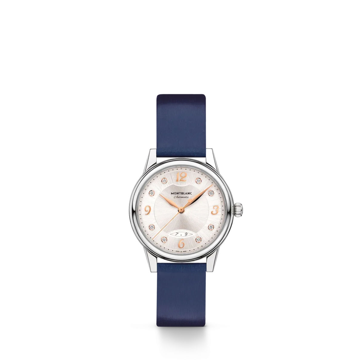 Interpretând codurile ceasornicăriei fine într-un mod elegant și feminin, Montblanc Bohème Automatic Date este inspirat din lumea scrisului de mână și vine într-o carcasă din oțel inoxidabil de 30 mm. Are un cadran elegant, argintiu-alb, cu finisaj satinat, împodobit cu indici din diamante, cifre arabe florale acoperite cu aur roz și mâini. Alte detalii rafinate includ un model filet sauté și o tehnică de ștanțare numită filé d’étoiles. Echipat cu calibrul automat MB 24.29, acest model indică orele, minutele și secundele, precum și data afișată într-o fereastră în formă de migdală cu cifre scrise de mână. Fontul romantic a fost aplicat și pe cadran pentru mențiunea „Automatic”. Acest ceas este echipat cu o curea interschimbabilă din piele de vițel albă cu imprimeu aligator și o curea suplimentară.