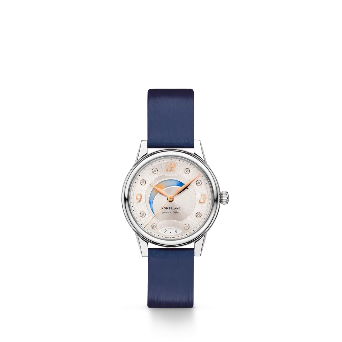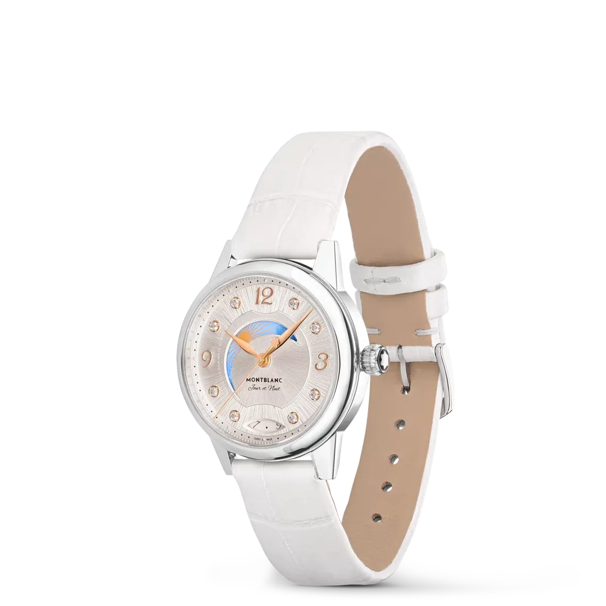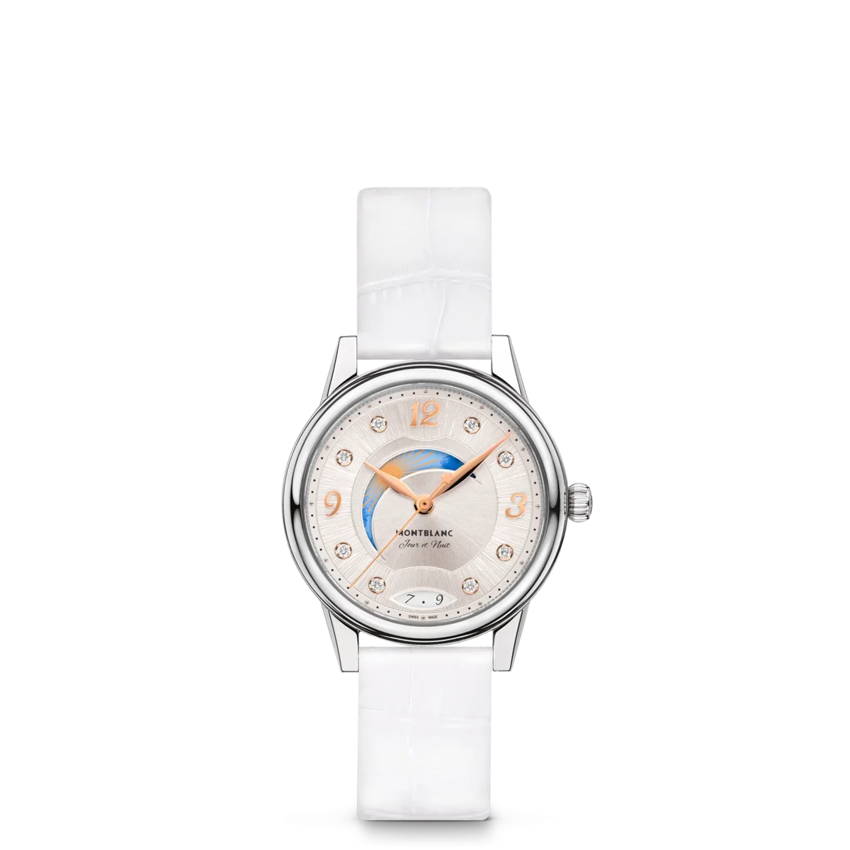 Interpretând codurile ceasornicăriei fine într-un mod elegant și feminin, Montblanc Bohème Day & Night este inspirat din lumea scrisului de mână și a acuarelelor și este disponibil într-o carcasă din oțel inoxidabil de 30 mm. Are un cadran elegant, de culoare alb-argintiu, cu finisaj satinat, decorat cu indici din diamante, cifre arabe florale și ace acoperite cu aur roz. Alte detalii rafinate includ un model filet sauté și o tehnică de ștanțare numită filé d’étoiles. Echipat cu calibrul automat MB 24.20, acest model indică orele, minutele și secundele, precum și data afișată într-o fereastră în formă de migdală cu cifre scrise de mână. Fontul romantic a fost aplicat și pe cadran pentru mențiunea zi și noapte „Jour et Nuit”. Complicația celestă zi și noapte arată schimbarea cerului pe o perioadă de 24 de ore și conferă ceasului o notă romantică și artistică, fiind creată cu acuarele. Acest ceas este echipat cu o curea interschimbabilă din piele de vițel albă cu imprimeu aligator și o curea suplimentară.