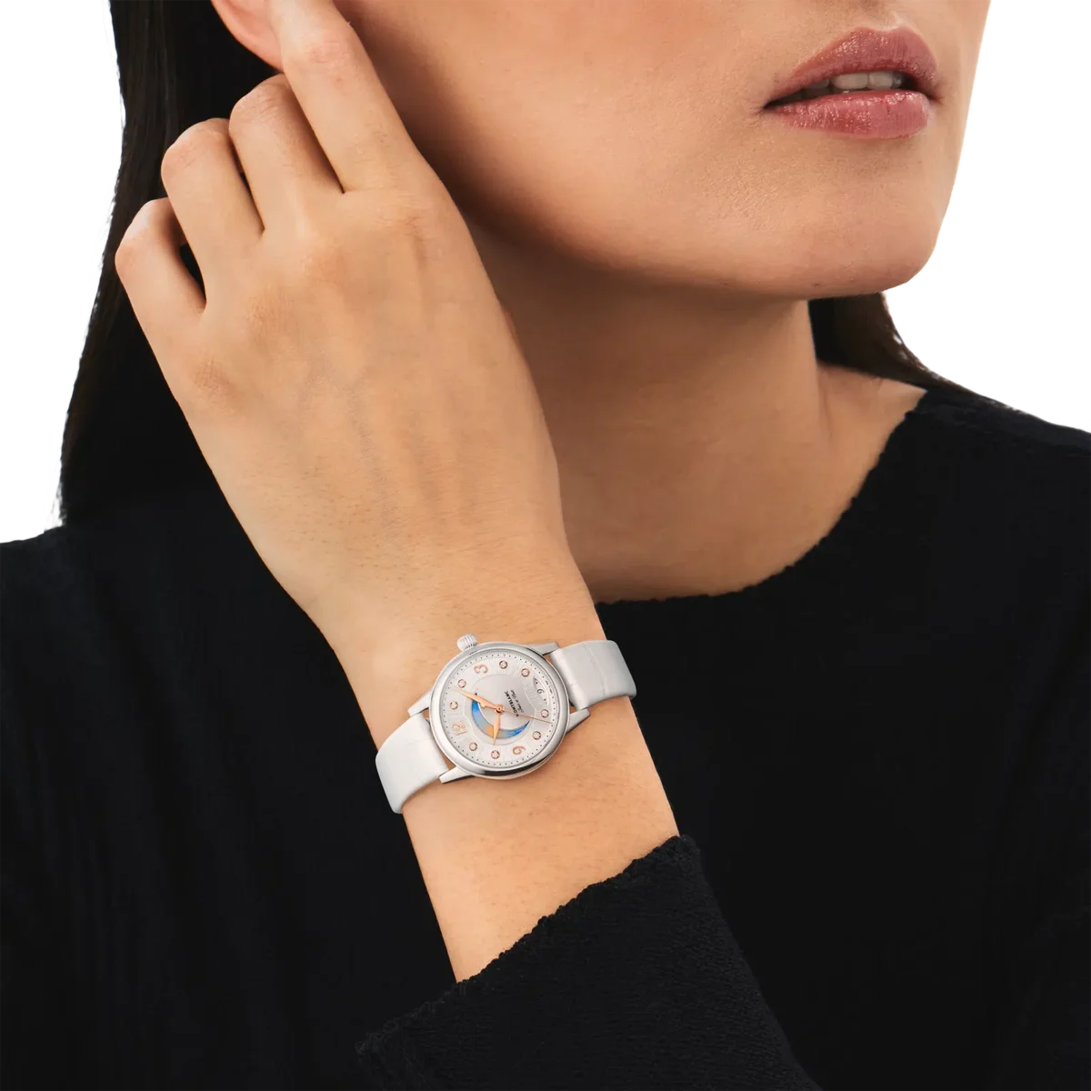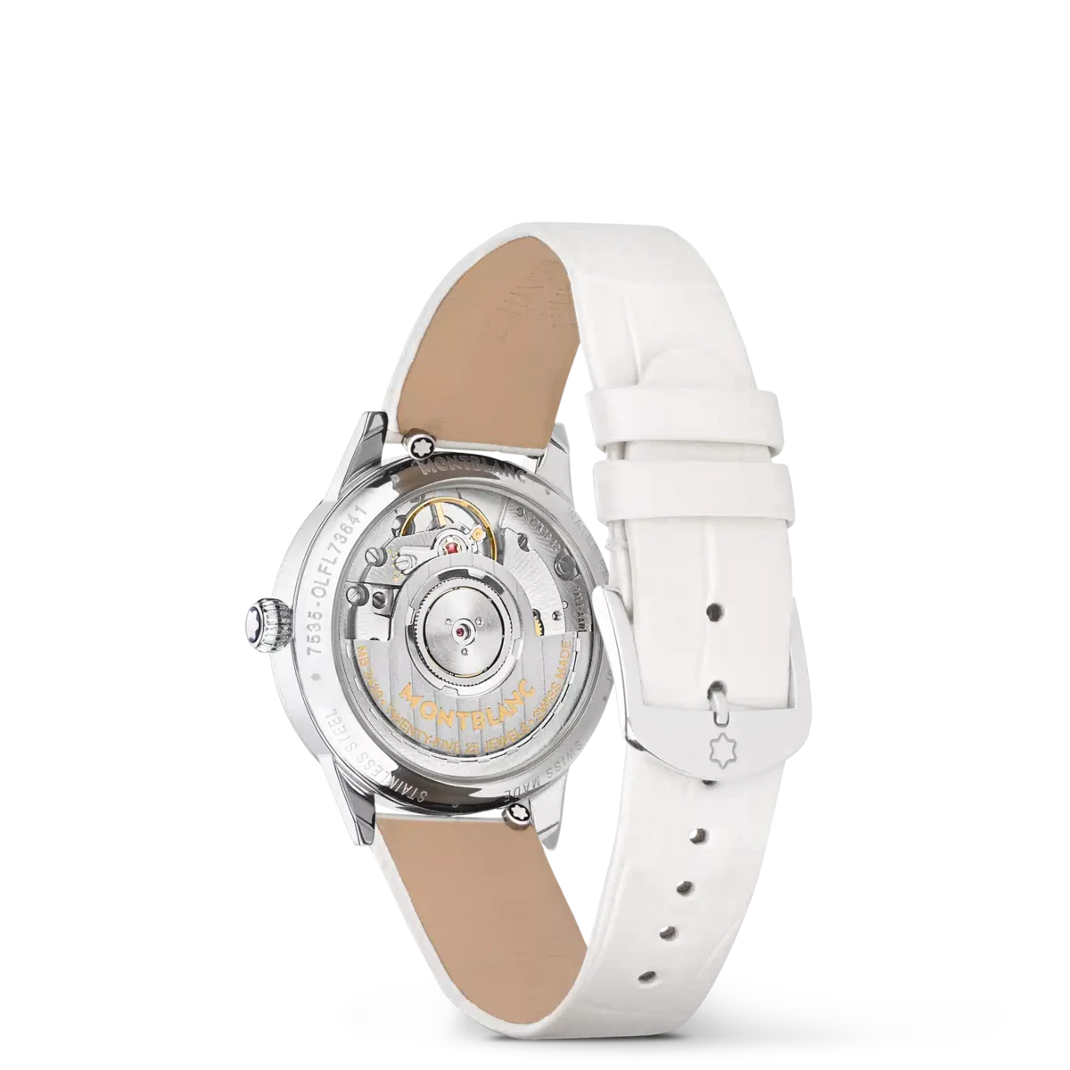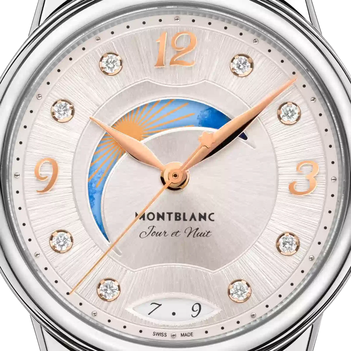 Interpretând codurile ceasornicăriei fine într-un mod elegant și feminin, Montblanc Bohème Day & Night este inspirat din lumea scrisului de mână și a acuarelelor și este disponibil într-o carcasă din oțel inoxidabil de 30 mm. Are un cadran elegant, de culoare alb-argintiu, cu finisaj satinat, decorat cu indici din diamante, cifre arabe florale și ace acoperite cu aur roz. Alte detalii rafinate includ un model filet sauté și o tehnică de ștanțare numită filé d’étoiles. Echipat cu calibrul automat MB 24.20, acest model indică orele, minutele și secundele, precum și data afișată într-o fereastră în formă de migdală cu cifre scrise de mână. Fontul romantic a fost aplicat și pe cadran pentru mențiunea zi și noapte „Jour et Nuit”. Complicația celestă zi și noapte arată schimbarea cerului pe o perioadă de 24 de ore și conferă ceasului o notă romantică și artistică, fiind creată cu acuarele. Acest ceas este echipat cu o curea interschimbabilă din piele de vițel albă cu imprimeu aligator și o curea suplimentară.