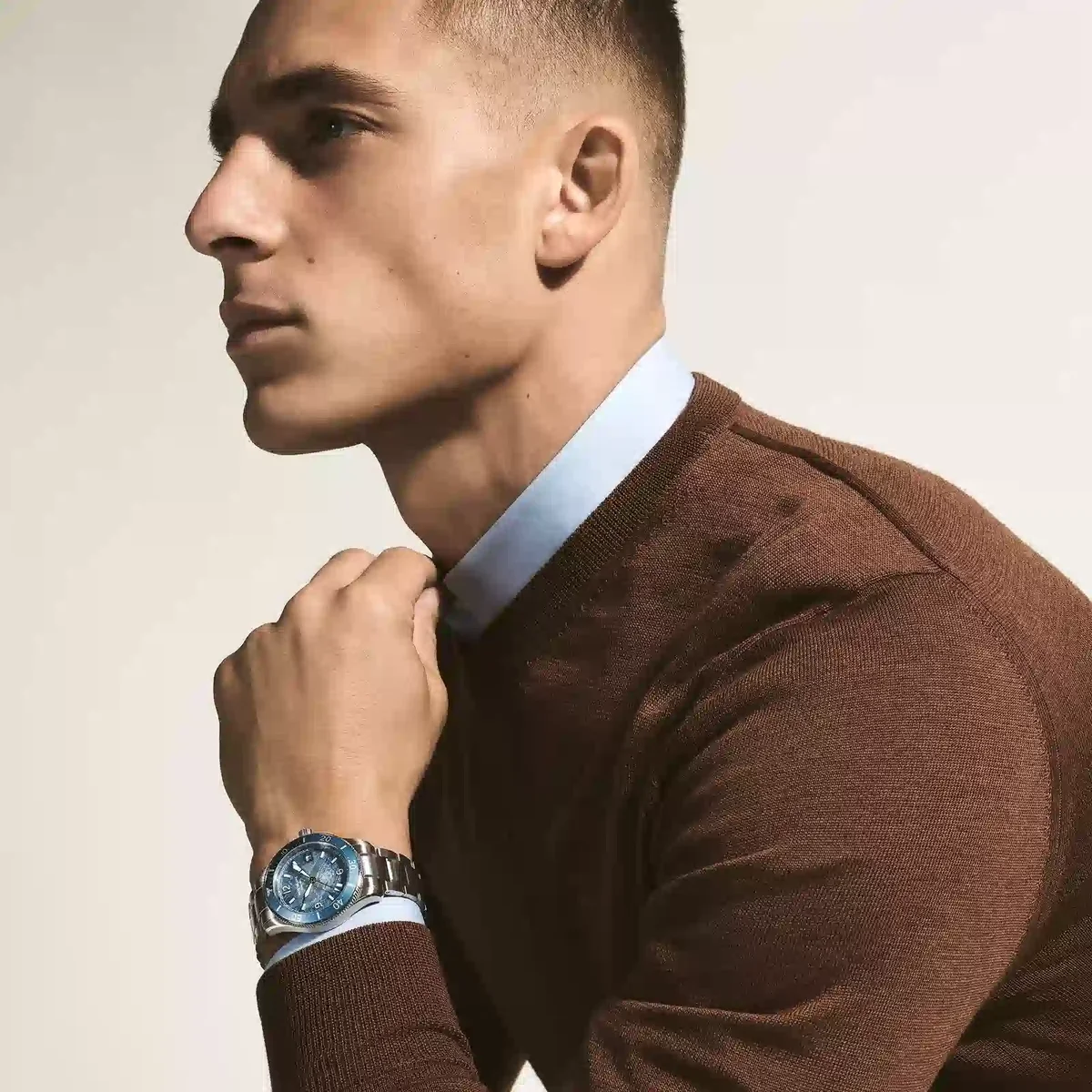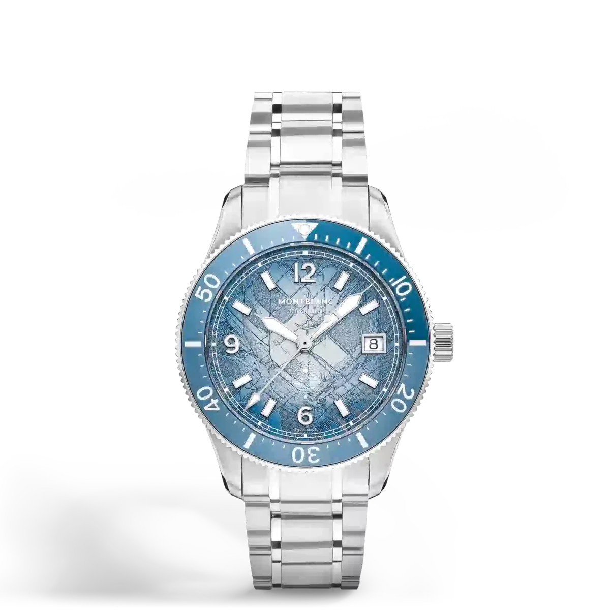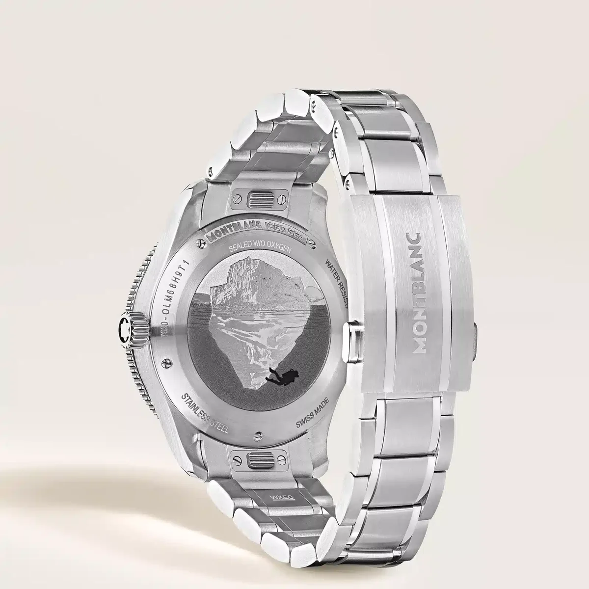 Ceasul Montblanc Iced Sea Automatic Date 0 Oxygen, cu cadran albastru cu model sfumato glacier, dă impresia că privești în adâncurile unui ghețar. Inspirată de Mer de Glace, această textură glacială a fost obținută folosind o tehnică ancestrală aproape uitată, numită gratté-boisé. Ceasul este încorporat într-o carcasă din oțel inoxidabil de 38 mm, complet lipsită de oxigen, și este dotat cu o lunetă rotativă unidirecțională cu inserție din aluminiu anodizat albastru bicolor, o gravură 3D pe spatele carcasei și o brățară din oțel inoxidabil interschimbabilă, cu sistem de reglare fină. Ceasul este conform cu norma ISO 6425 pentru scufundări și are o rezistență la apă de 300 de metri. Nr. de identificare: MB134022