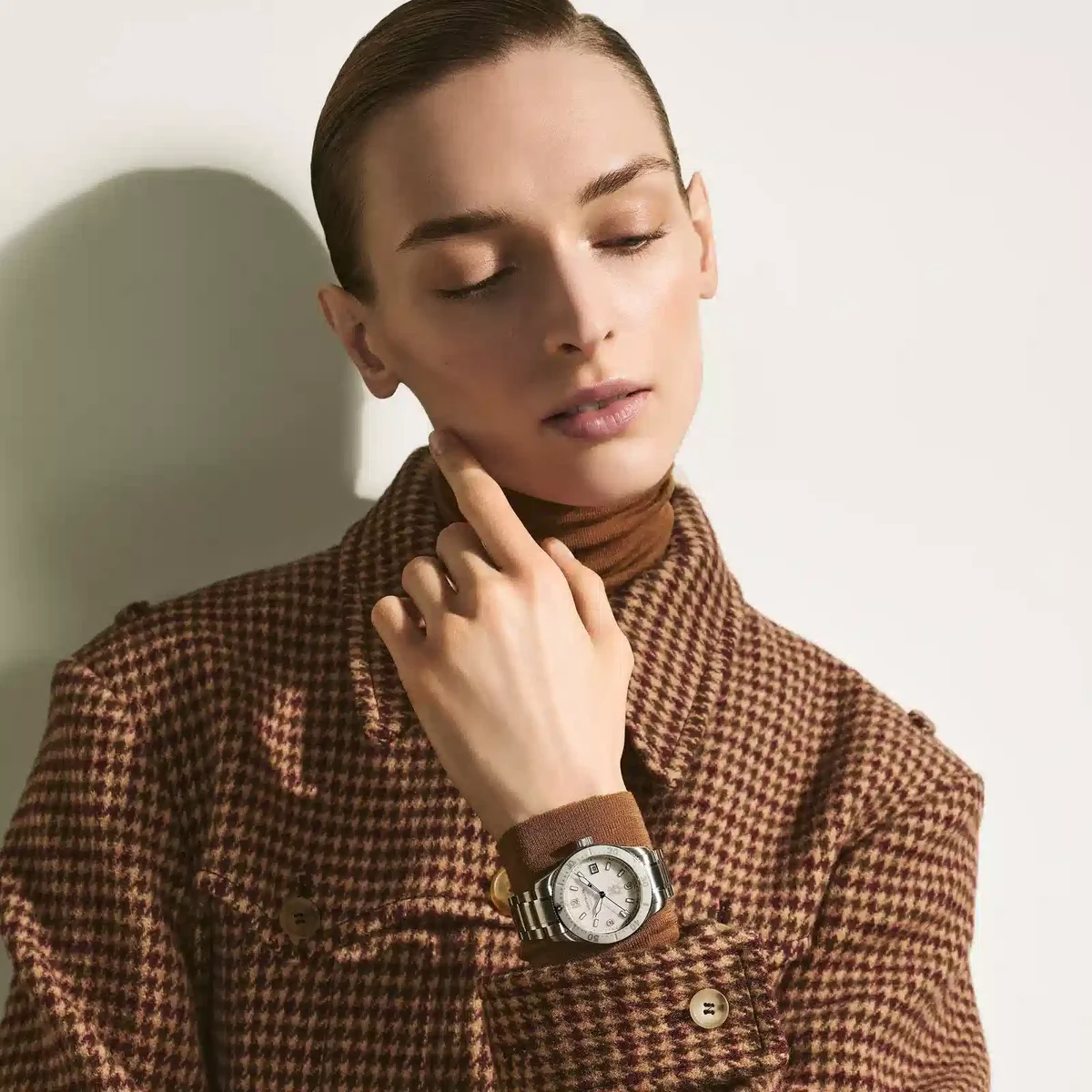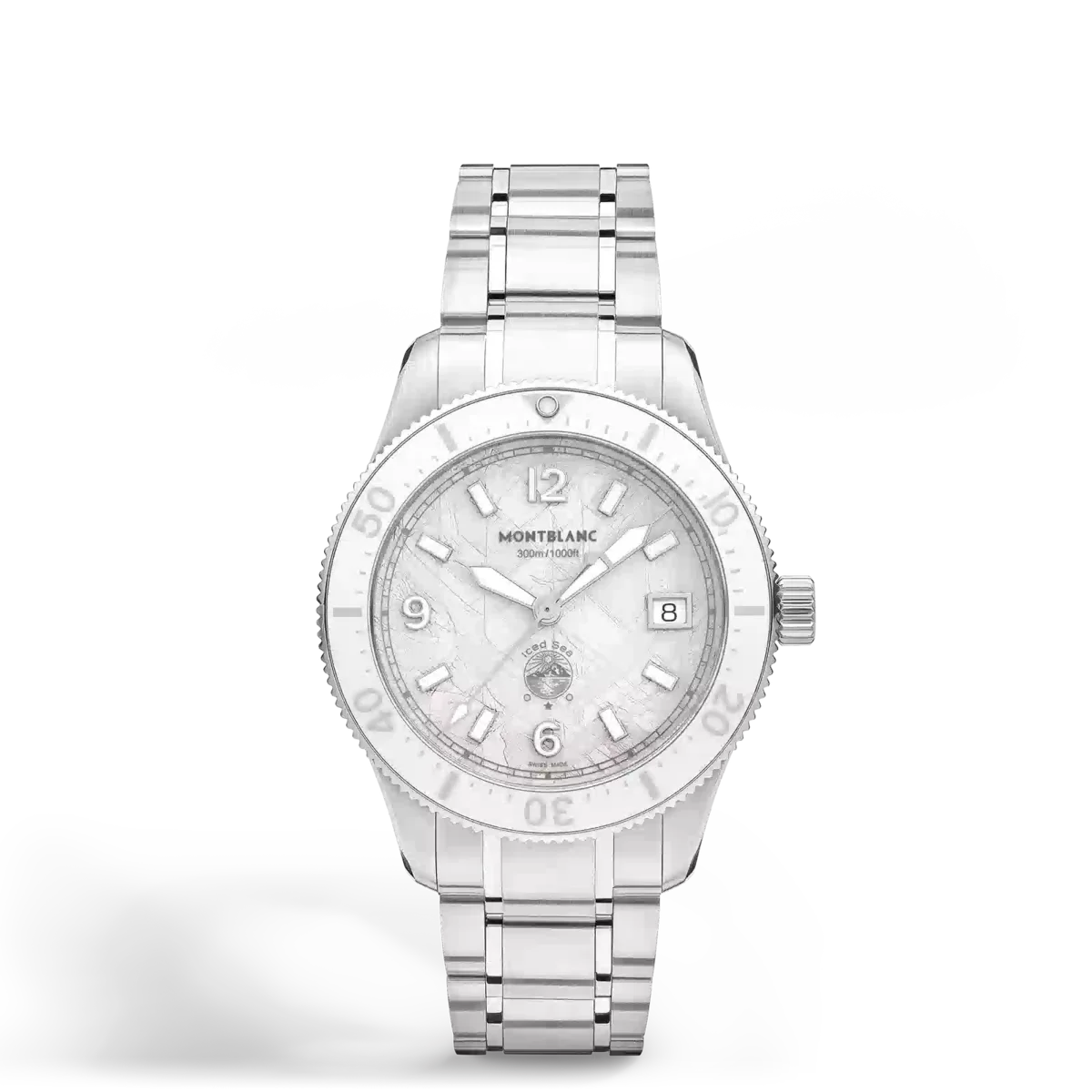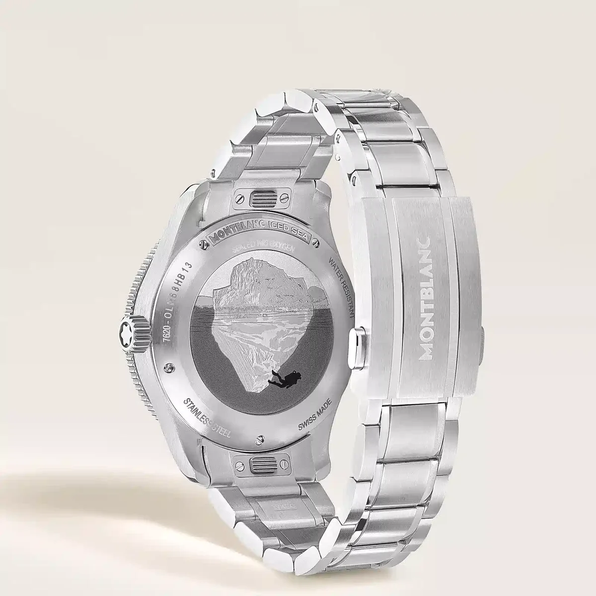 Ceasul Montblanc Iced Sea Automatic Date 0 Oxygen, cu cadran alb cu model de ghețar, dă impresia că privești în adâncurile unui ghețar. Inspirată de Mer de Glace, această textură glacială a fost obținută folosind o tehnică ancestrală aproape uitată, numită gratté-boisé. Ceasul este încorporat într-o carcasă din oțel inoxidabil de 38 mm, complet lipsită de oxigen, și este dotat cu o lunetă rotativă unidirecțională cu inserție din ceramică albă, o gravură 3D pe spatele carcasei și o brățară din oțel inoxidabil interschimbabilă, cu sistem de reglare fină. Ceasul este conform cu norma ISO 6425 pentru scufundări și are o rezistență la apă de 300 de metri. Nr. de identificare: MB134024