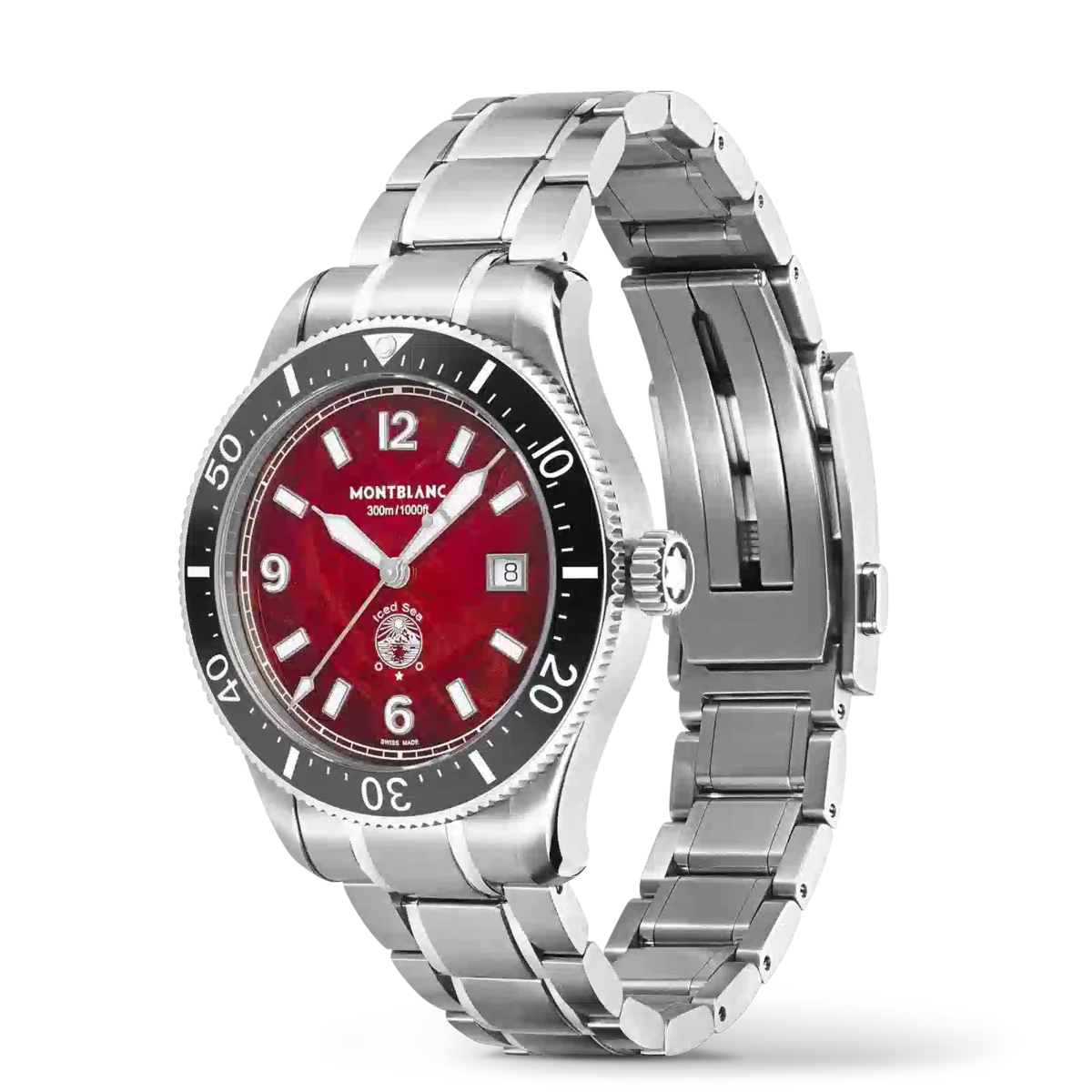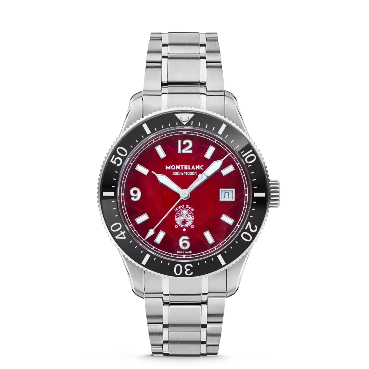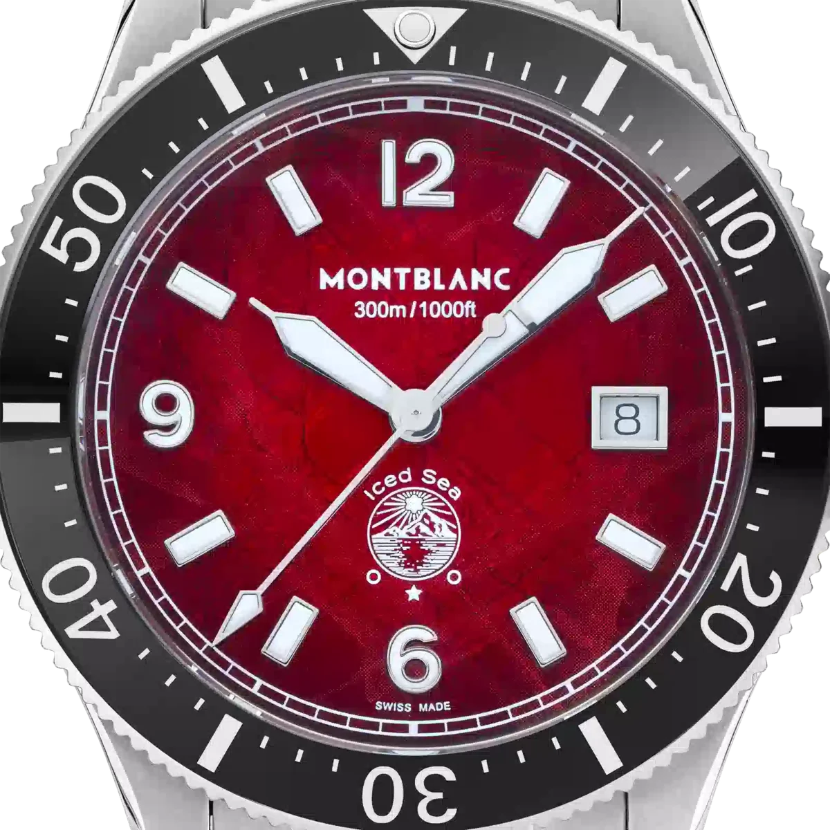 Ceasul Montblanc Iced Sea Automatic Date cu cadran în tonuri de burgund și model de ghețar amintește de culoarea roșu intens a soarelui de seară care lovește ghețarul. Cadranul cu model de ghețar este inspirat de Mer de Glace – Marea de Gheață – principalul ghețar al masivului Mont-Blanc. Textura sa a fost obținută folosind o tehnică ancestrală aproape uitată, numită gratté-boisé. Ceasul este dotat cu o ramă ceramică unidirecțională neagră, o gravură 3D pe spatele carcasei și o brățară interschimbabilă din oțel inoxidabil cu sistem de reglare fină. Ceasul este conform cu norma ISO 6425 pentru scufundări și are o rezistență la apă de 300 de metri.
