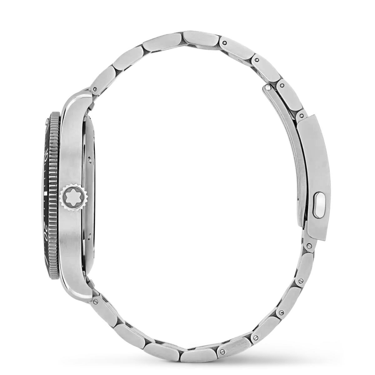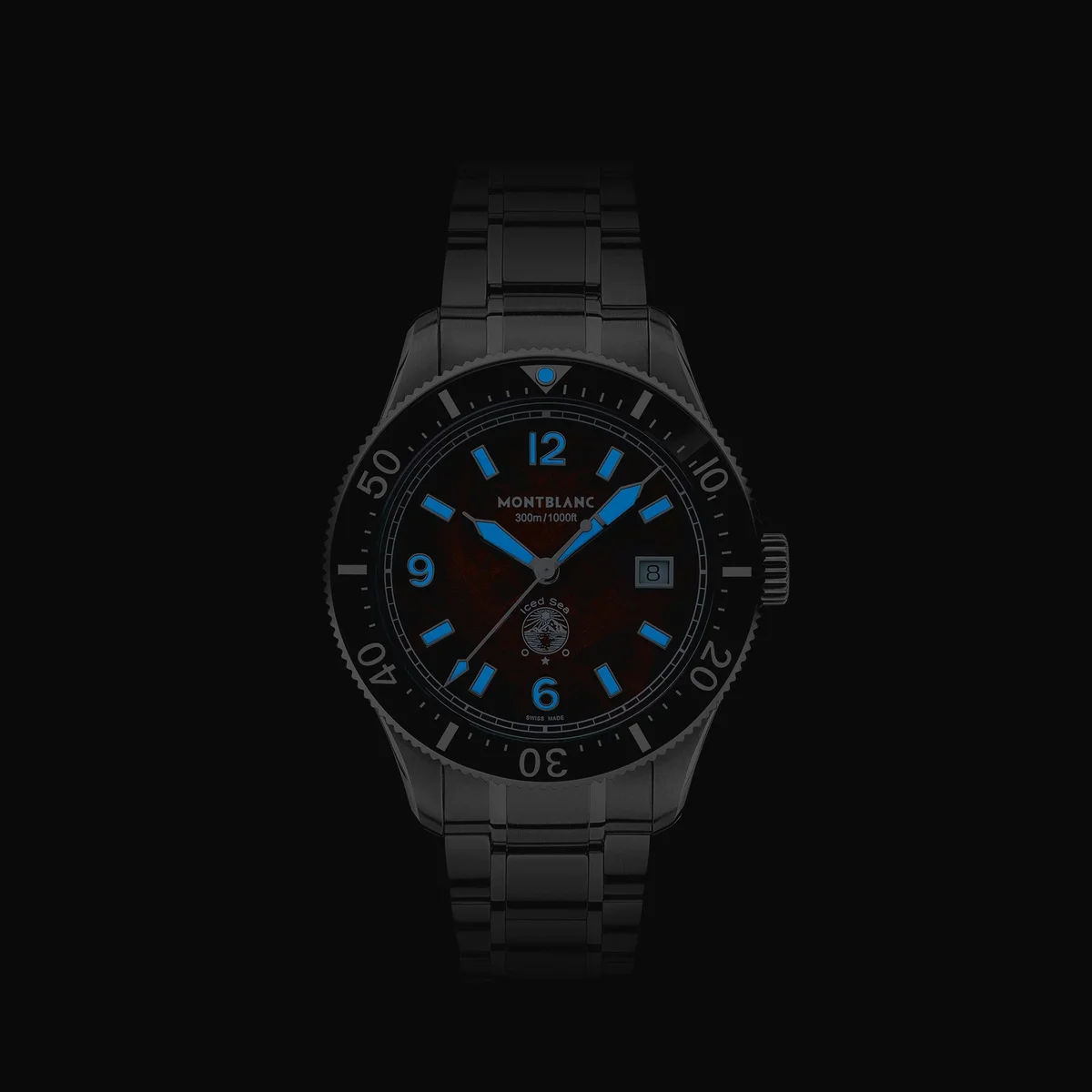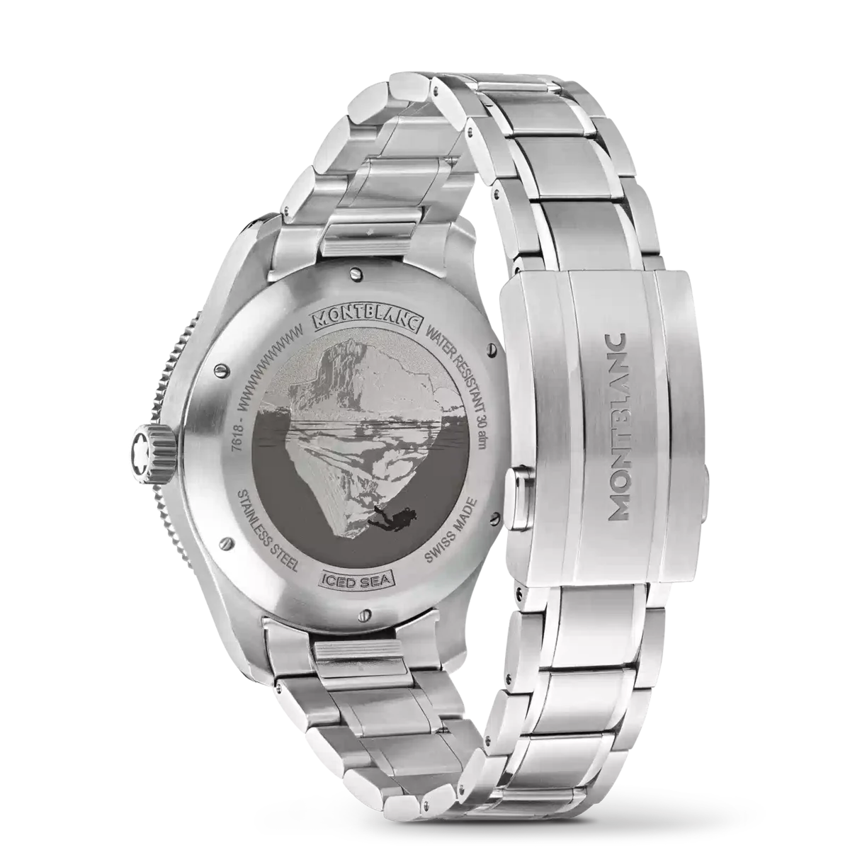 Ceasul Montblanc Iced Sea Automatic Date cu cadran în tonuri de burgund și model de ghețar amintește de culoarea roșu intens a soarelui de seară care lovește ghețarul. Cadranul cu model de ghețar este inspirat de Mer de Glace – Marea de Gheață – principalul ghețar al masivului Mont-Blanc. Textura sa a fost obținută folosind o tehnică ancestrală aproape uitată, numită gratté-boisé. Ceasul este dotat cu o ramă ceramică unidirecțională neagră, o gravură 3D pe spatele carcasei și o brățară interschimbabilă din oțel inoxidabil cu sistem de reglare fină. Ceasul este conform cu norma ISO 6425 pentru scufundări și are o rezistență la apă de 300 de metri.