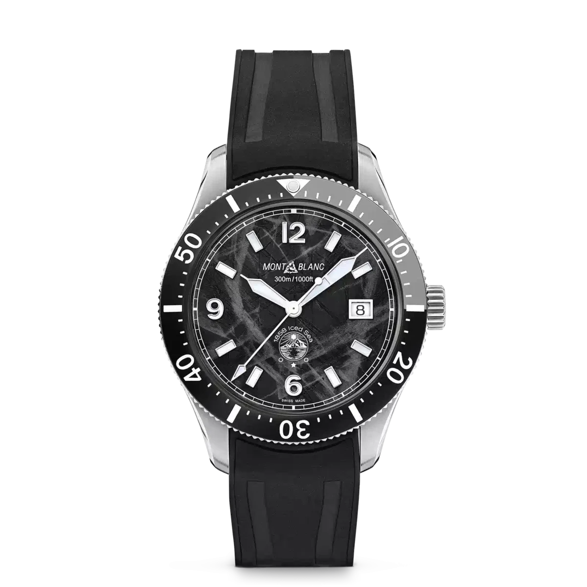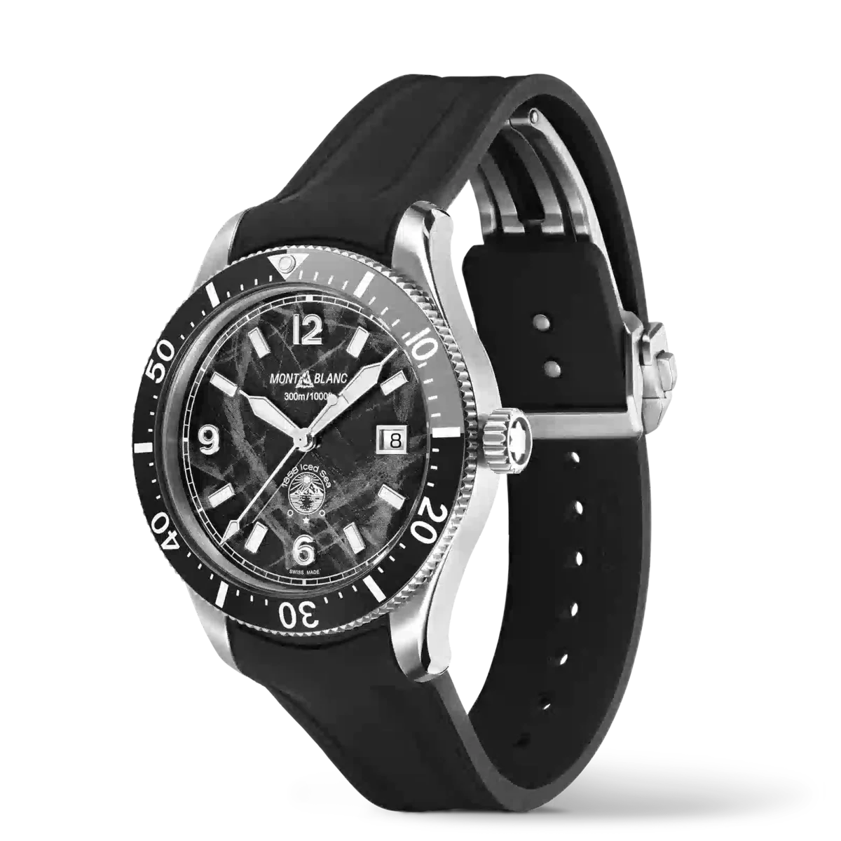 Primul ceas de scufundări sportiv al Montblanc, Montblanc Iced Sea Automatic Date are un cadran cu model de ghețar care dă impresia că privești în adâncurile unui ghețar. Acest cadran negru cu model de ghețar este inspirat de Mer de Glace – Marea de Gheață – principalul ghețar al Masivului Mont-Blanc. Textura sa a fost obținută folosind o tehnică ancestrală aproape uitată, numită gratté-boisé. Ceasul are o carcasă din oțel inoxidabil de 41 mm și este dotat cu o lunetă ceramică unidirecțională bicoloră, un fond gravat și o curea din cauciuc negru interschimbabilă, cu sistem de reglare fină. Ceasul este conform cu norma ISO 6425 pentru ceasurile de scufundare și este rezistent la apă până la 300 de metri.