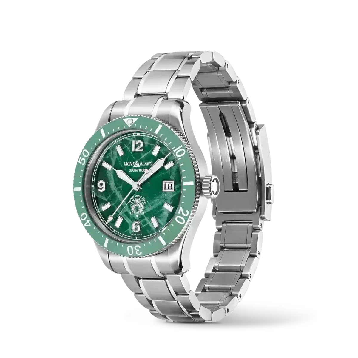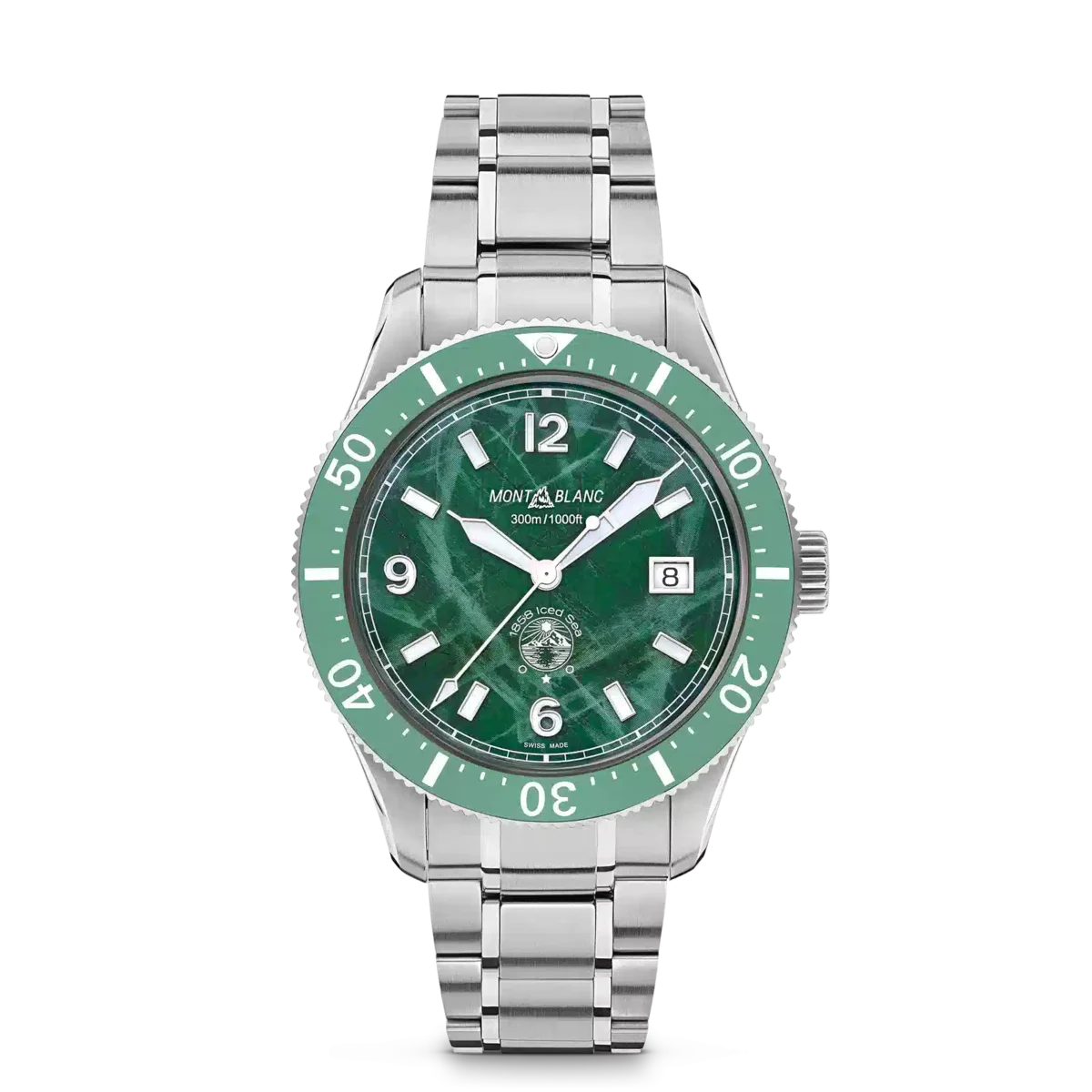Primul ceas de scufundări sportiv al Montblanc, Montblanc Iced Sea Automatic Date are un cadran cu model de ghețar care dă impresia că privești în adâncurile unui ghețar. Cadranul cu model glaciar verde este inspirat de Mer de Glace – Marea de Gheață – principalul ghețar al masivului Mont-Blanc. Textura sa a fost obținută folosind o tehnică ancestrală aproape uitată, numită gratté-boisé. Ceasul are o carcasă din oțel inoxidabil de 41 mm și este dotat cu o lunetă ceramică unidirecțională bicoloră, un fond gravat și o brățară din oțel inoxidabil interschimbabilă, cu sistem de reglare fină. Ceasul este conform cu norma ISO 6425 pentru ceasurile de scufundare și este rezistent la apă până la 300 de metri.