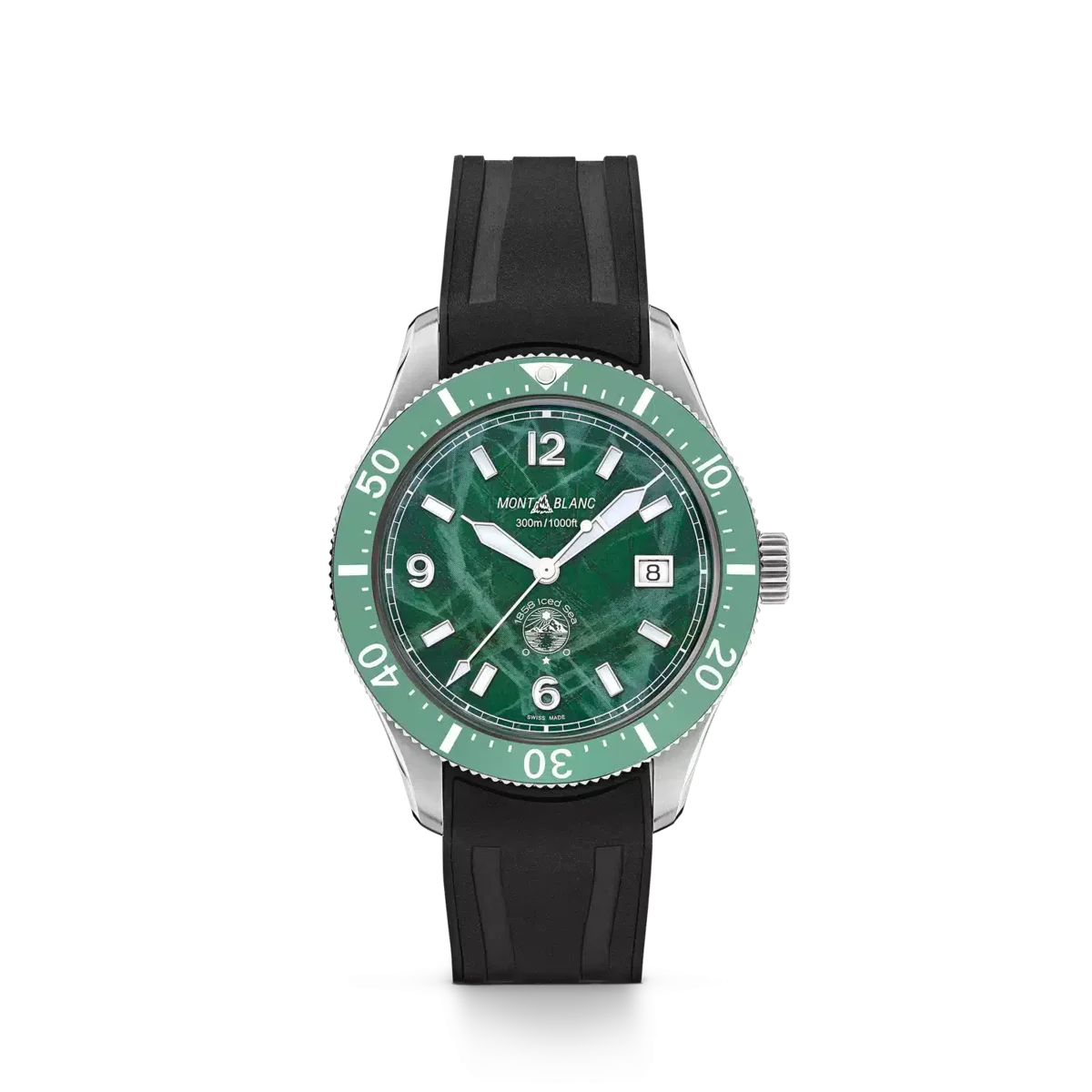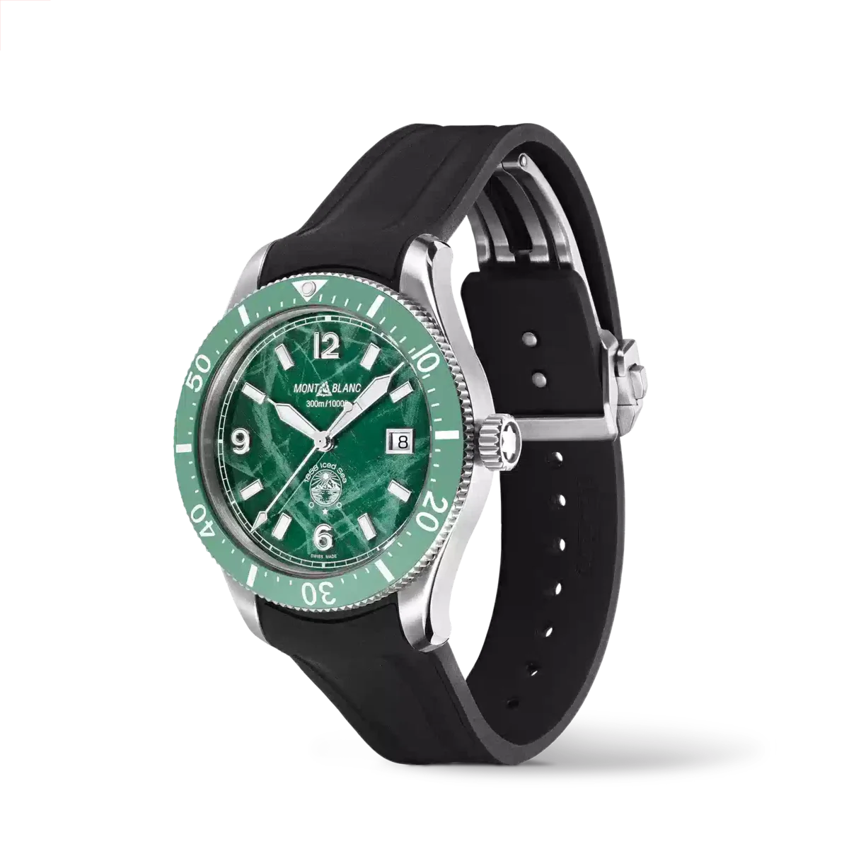 Primul ceas de scufundări sportiv al Montblanc, Montblanc Iced Sea Automatic Date are un cadran cu model glaciar care dă impresia că privești în adâncurile unui ghețar. Cadranul cu model glaciar verde este inspirat de Mer de Glace – Marea de Gheață – principalul ghețar al masivului Mont-Blanc. Textura sa a fost obținută folosind o tehnică ancestrală aproape uitată, numită gratté-boisé. Ceasul are o carcasă din oțel inoxidabil de 41 mm și este dotat cu o lunetă ceramică unidirecțională bicoloră, un fond gravat și o curea din cauciuc negru interschimbabilă, cu sistem de reglare fină. Ceasul este conform cu norma ISO 6425 pentru ceasurile de scufundare și este rezistent la apă până la 300 de metri. Nr. de identificare MB129765 Lățime lug 20 mm
