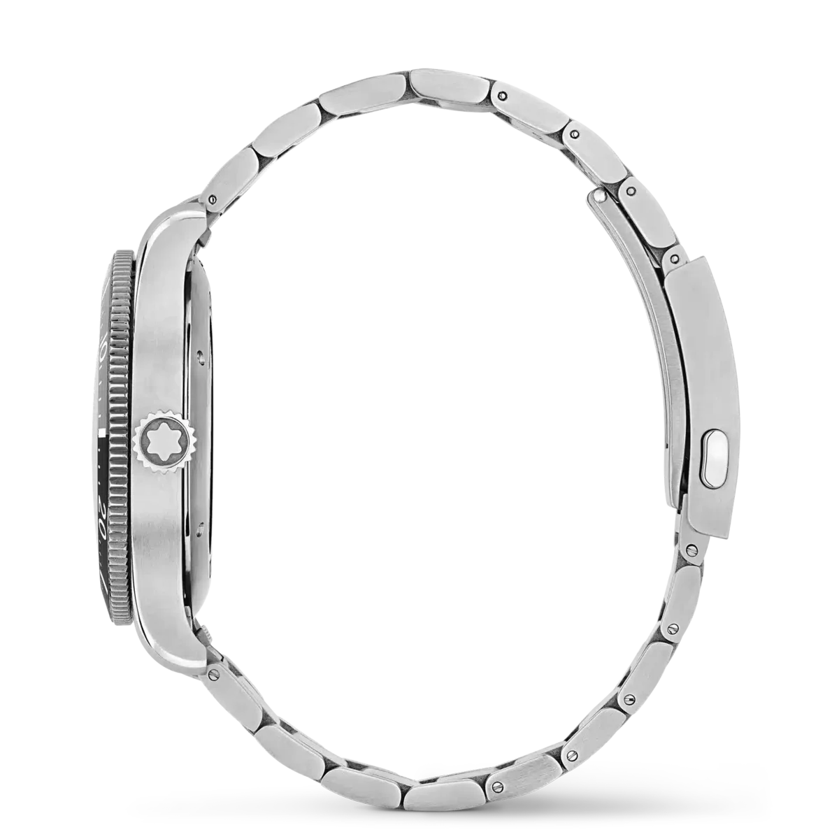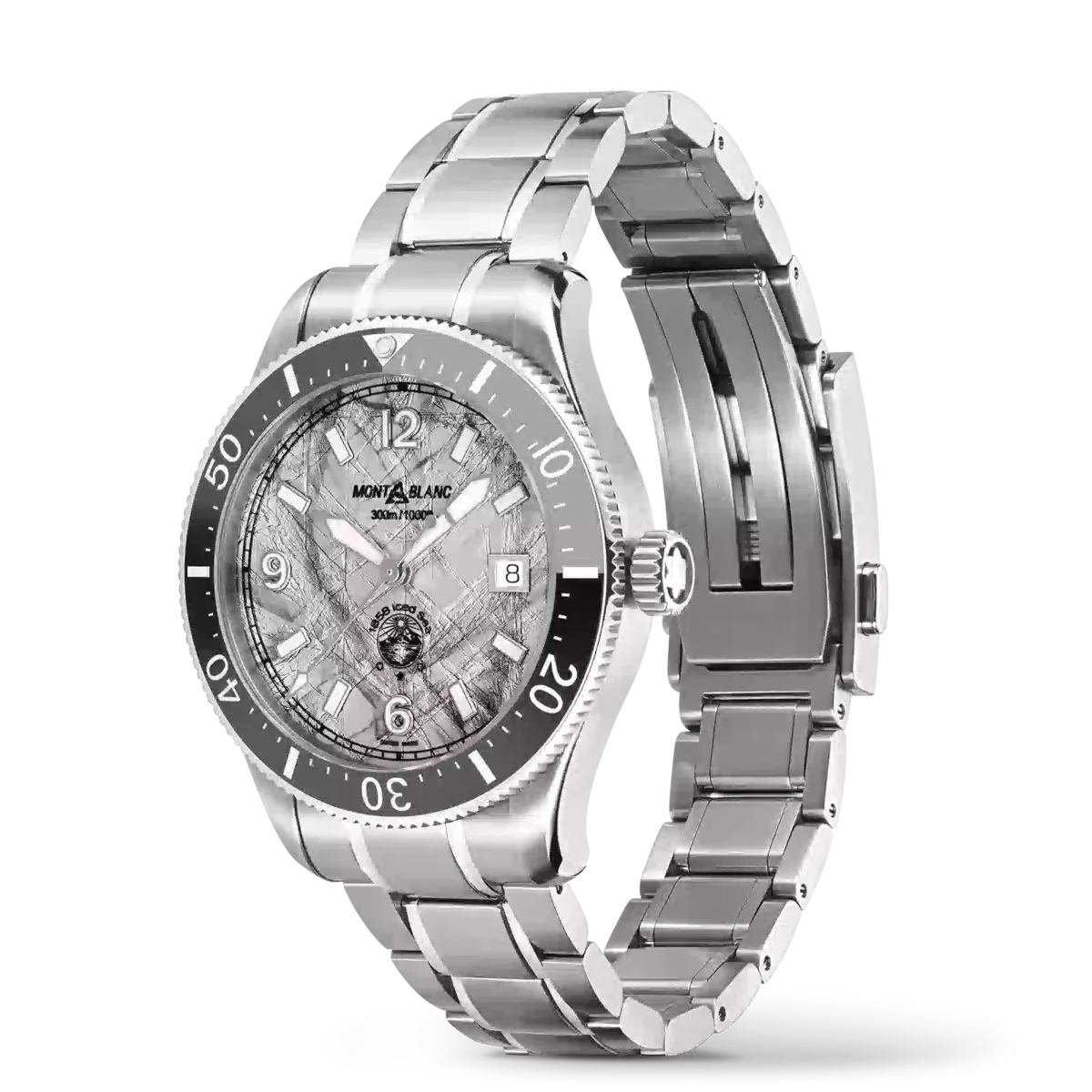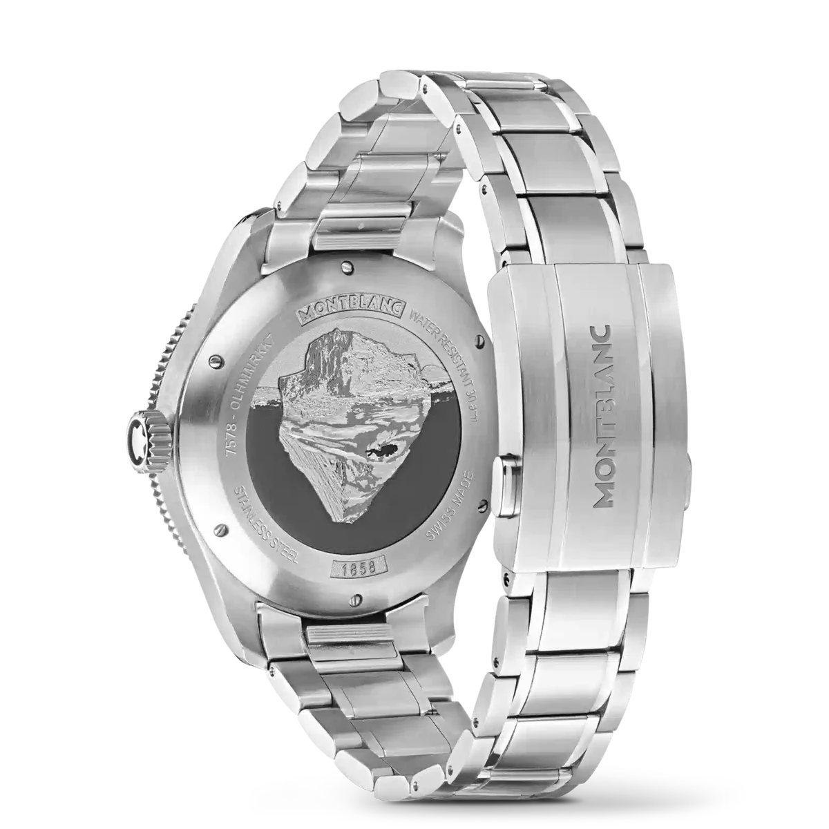 Ceasul Montblanc Iced Sea Automatic Date, cu cadranul său gri cu model de ghețar, dă impresia că privești în adâncurile unui ghețar, cu toate mineralele sale capturate în timp de milenii. Inspirată de Mer de Glace, această textură glacială a fost obținută folosind o tehnică ancestrală aproape uitată, numită gratté-boisé. Ceasul de 41 mm este dotat cu o brățară interschimbabilă din oțel inoxidabil, care poate fi înlocuită rapid și ușor cu o curea din cauciuc negru cu contur gri, fără a fi necesar să vă întoarceți la magazin sau să utilizați vreun instrument. De asemenea, poate fi ajustat la încheietura mâinii atunci când purtați ceasul pentru scufundări. Ceasul este conform cu norma ISO 6425 pentru scufundări și are o rezistență la apă de 300 de metri și marcaje luminescente pentru citire în condiții de lumină slabă.