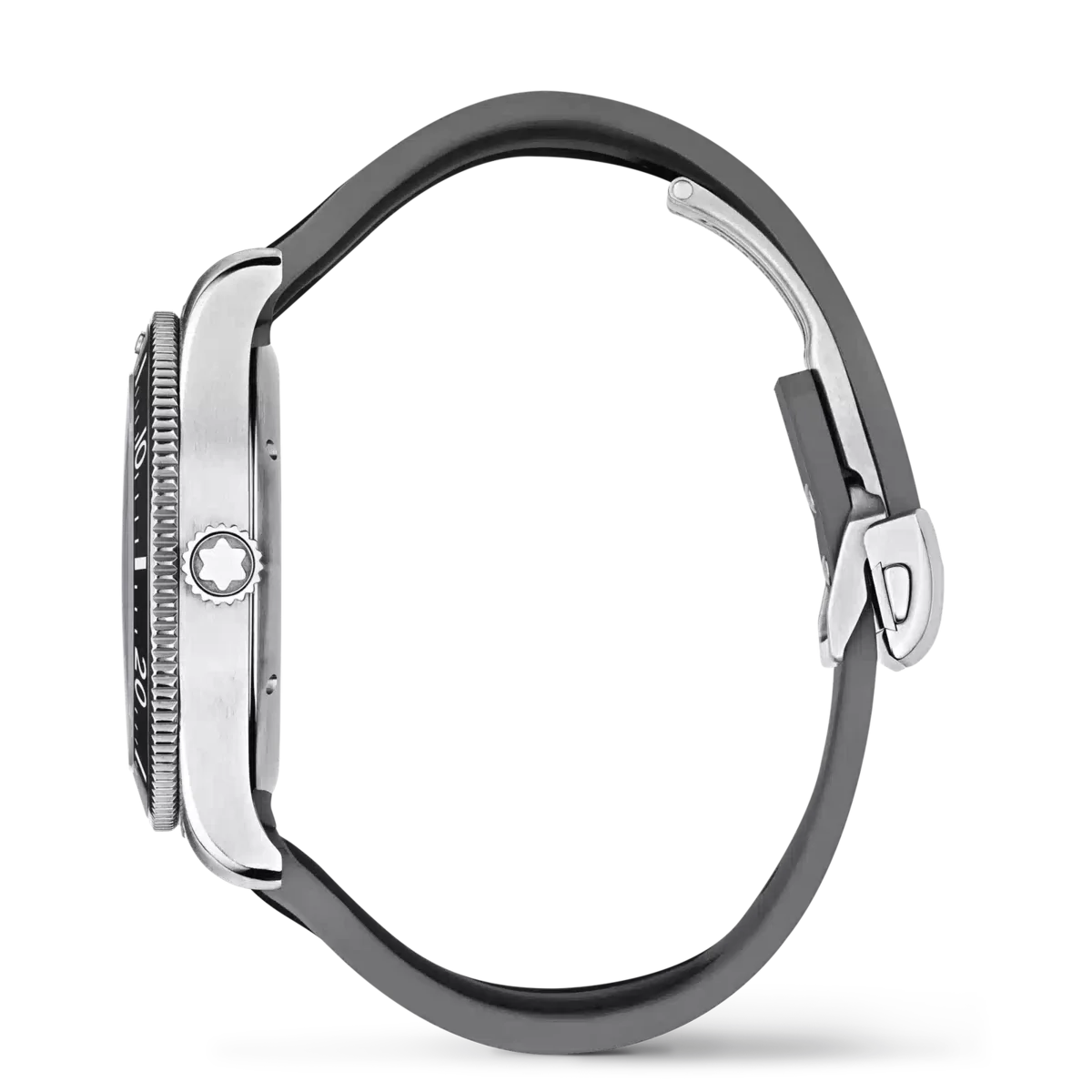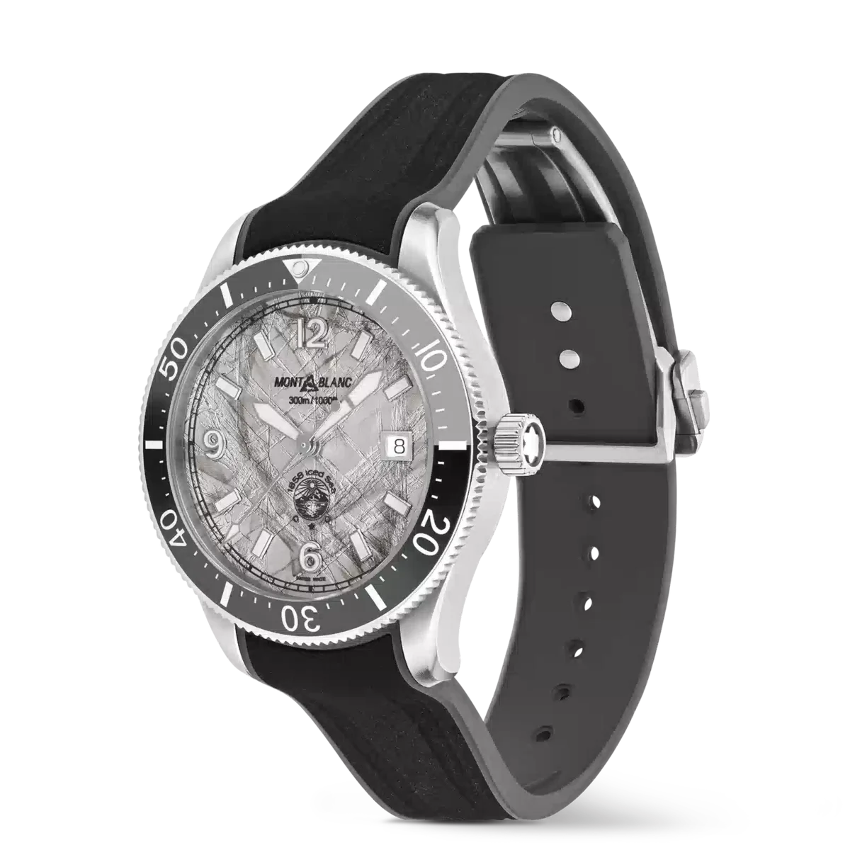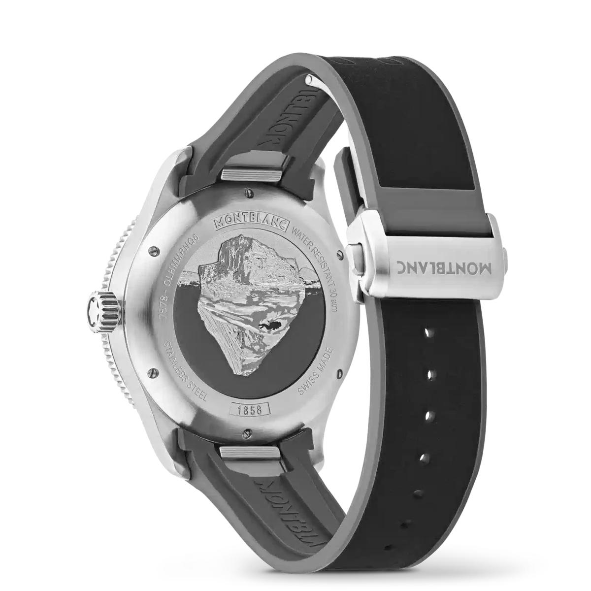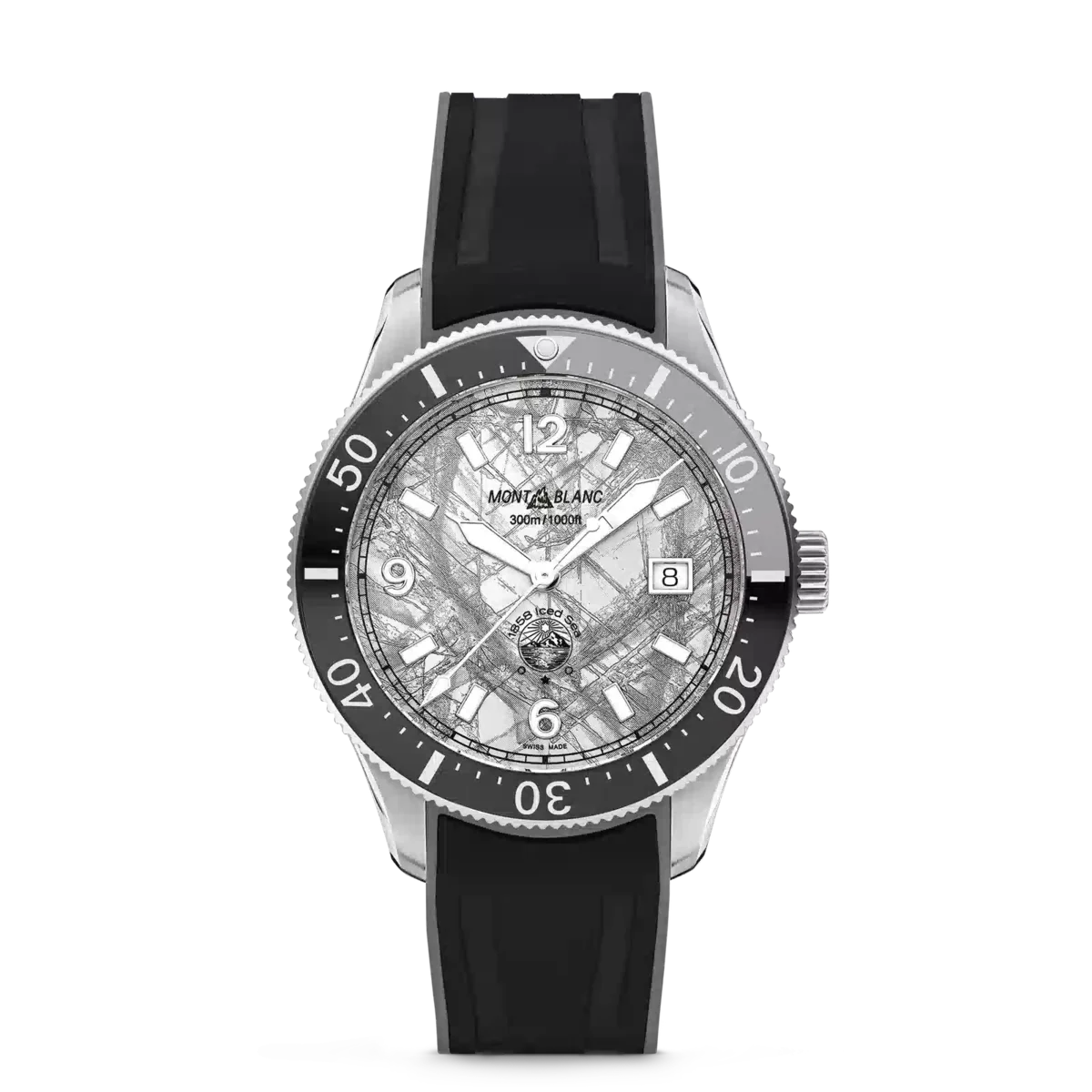 Ceasul Montblanc Iced Sea Automatic Date cu cadran gri cu model de ghețar dă impresia că privești în adâncurile unui ghețar cu toate mineralele sale capturate în timp de milenii. Inspirată de Mer de Glace, această textură glacială a fost obținută folosind o tehnică ancestrală aproape uitată, numită gratté-boisé. Ceasul de 41 mm este prevăzut cu o curea de cauciuc neagră interschimbabilă, cu contur gri, care poate fi înlocuită rapid și ușor cu o brățară din oțel inoxidabil, fără a fi necesar să vă întoarceți la magazin sau să utilizați vreun instrument. De asemenea, poate fi ajustat la încheietura mâinii atunci când purtați ceasul pentru scufundări. Ceasul este conform cu norma ISO 6425 pentru scufundări și are o rezistență la apă de 300 de metri și marcaje luminescente pentru citire în condiții de lumină slabă.