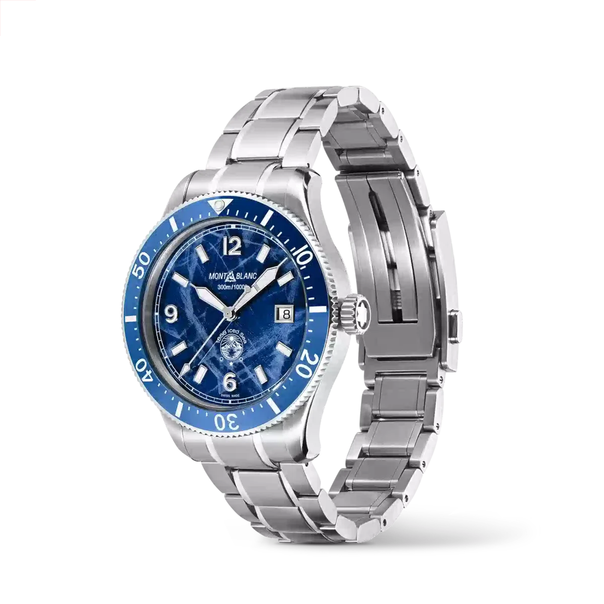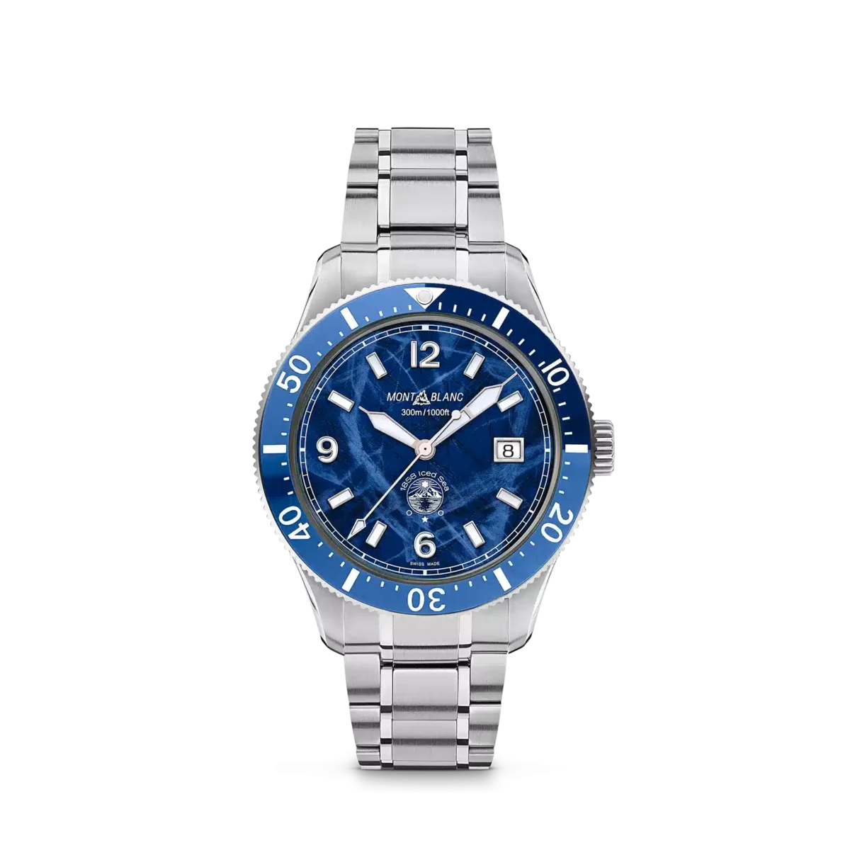 Primul ceas sportiv de scufundări pentru Montblanc, Montblanc Iced Sea Automatic Date are un cadran cu model de ghețar care dă impresia că privești în adâncurile unui ghețar. Cadranul cu model glaciar albastru este inspirat de Mer de Glace – Marea de Gheață – principalul ghețar al masivului Mont-Blanc. Textura sa a fost obținută folosind o tehnică ancestrală aproape uitată, numită gratté-boisé. Ceasul are o carcasă din oțel inoxidabil de 41 mm și este dotat cu o lunetă unidirecțională din ceramică bicoloră, un fond gravat și o brățară conică din oțel inoxidabil interschimbabilă, cu reglare fină pentru o potrivire precisă. Ceasul este conform cu norma ISO 6425 pentru ceasurile de scufundare și este rezistent la apă până la 300 de metri.