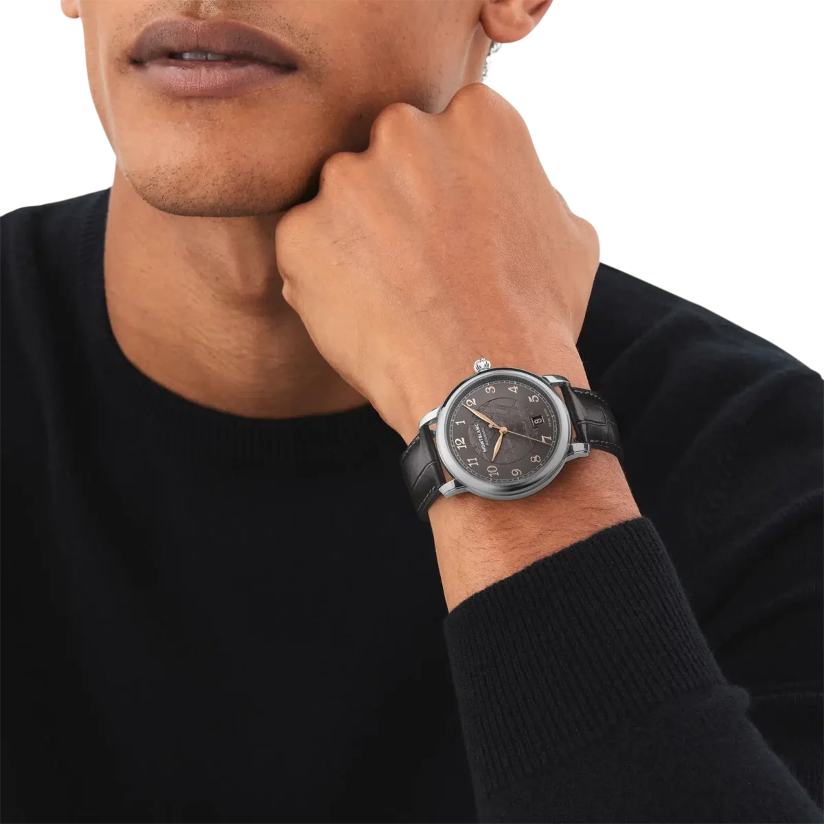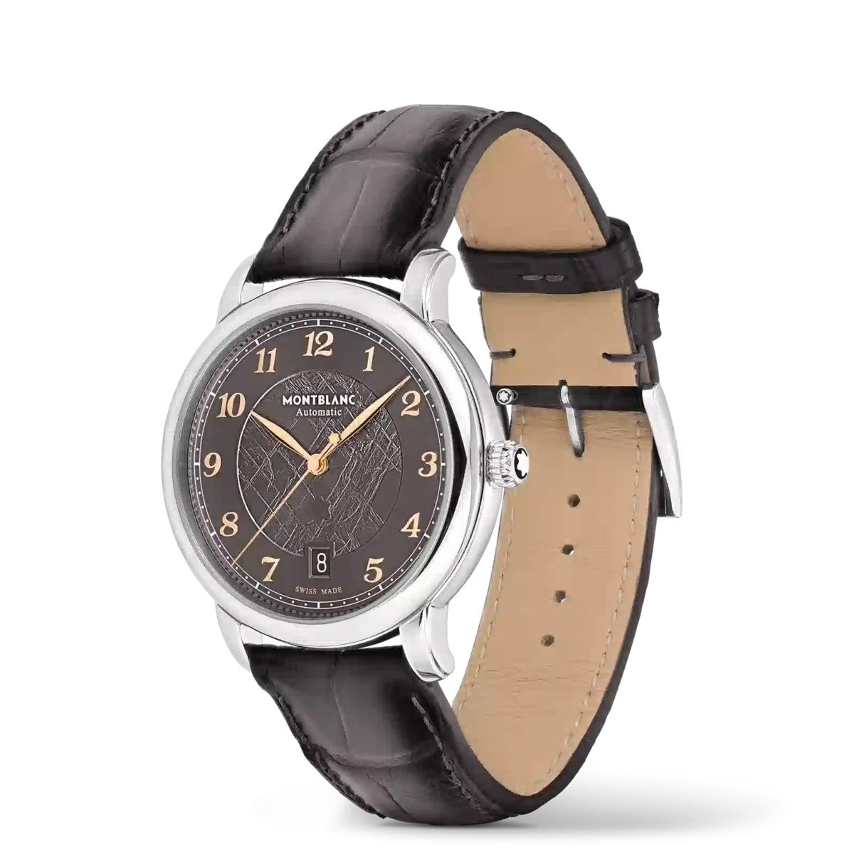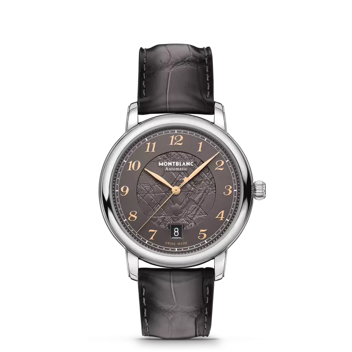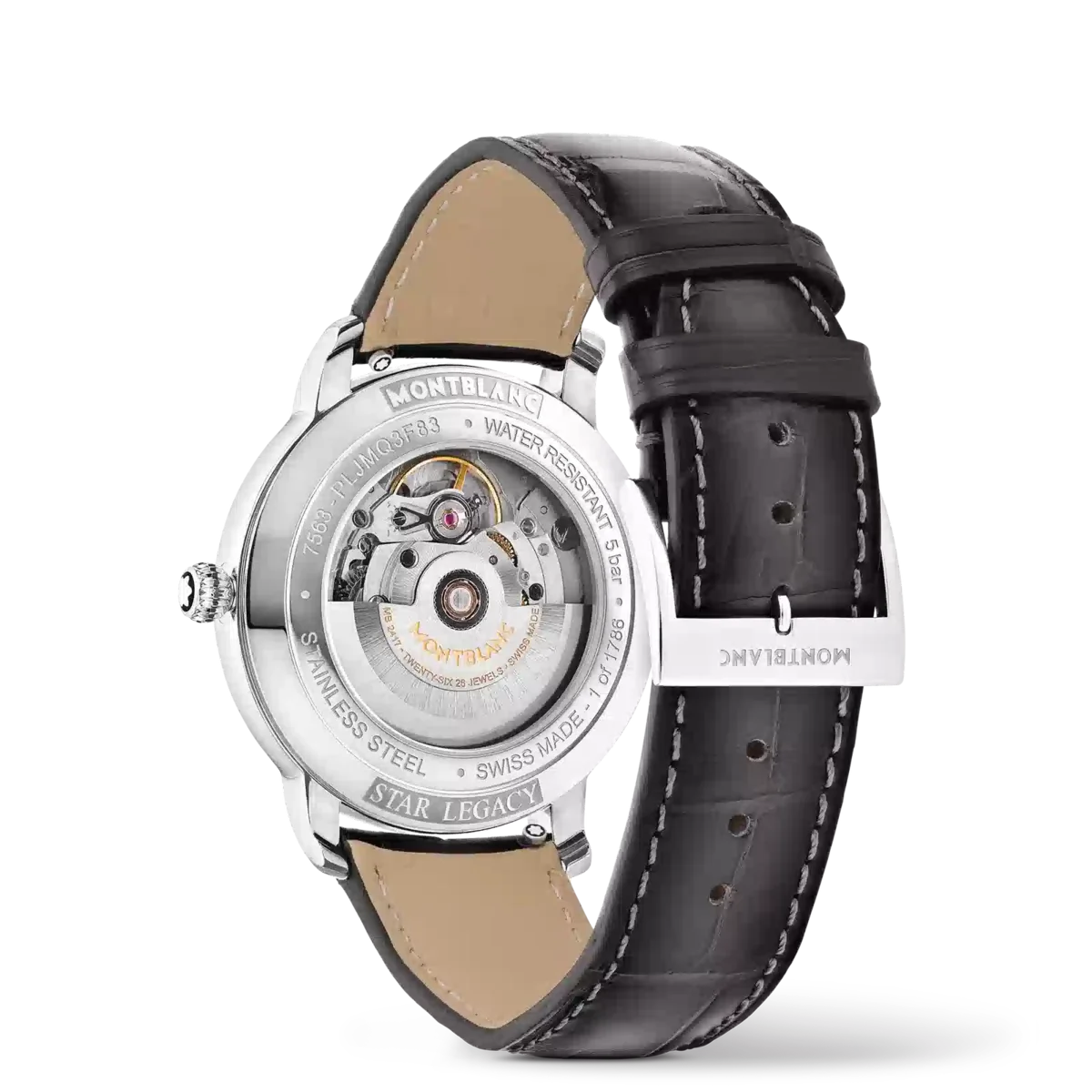Montblanc Star Legacy Grey Automatic Date Limited Edition, în ediție limitată de 1786 de bucăți, are o carcasă din oțel inoxidabil de 39 mm care evidențiază o nouă fațetă a Mont Blanc – versantul stâncos orientat spre sud, unde zăpada se depune cu dificultate pe suprafața verticală. Cadranul cu model gri ghețar al acestui ceas este pus în evidență de indicatoarele și cifrele arabe placate cu aur roz. Un alt detaliu frumos este faptul că emblema Montblanc, atât pe acul secundar, cât și pe cadranul de lângă dată, se intersectează la fiecare minut. Ceasul este prevăzut cu o curea interschimbabilă din piele de vițel gri cu imprimeu de aligator.
