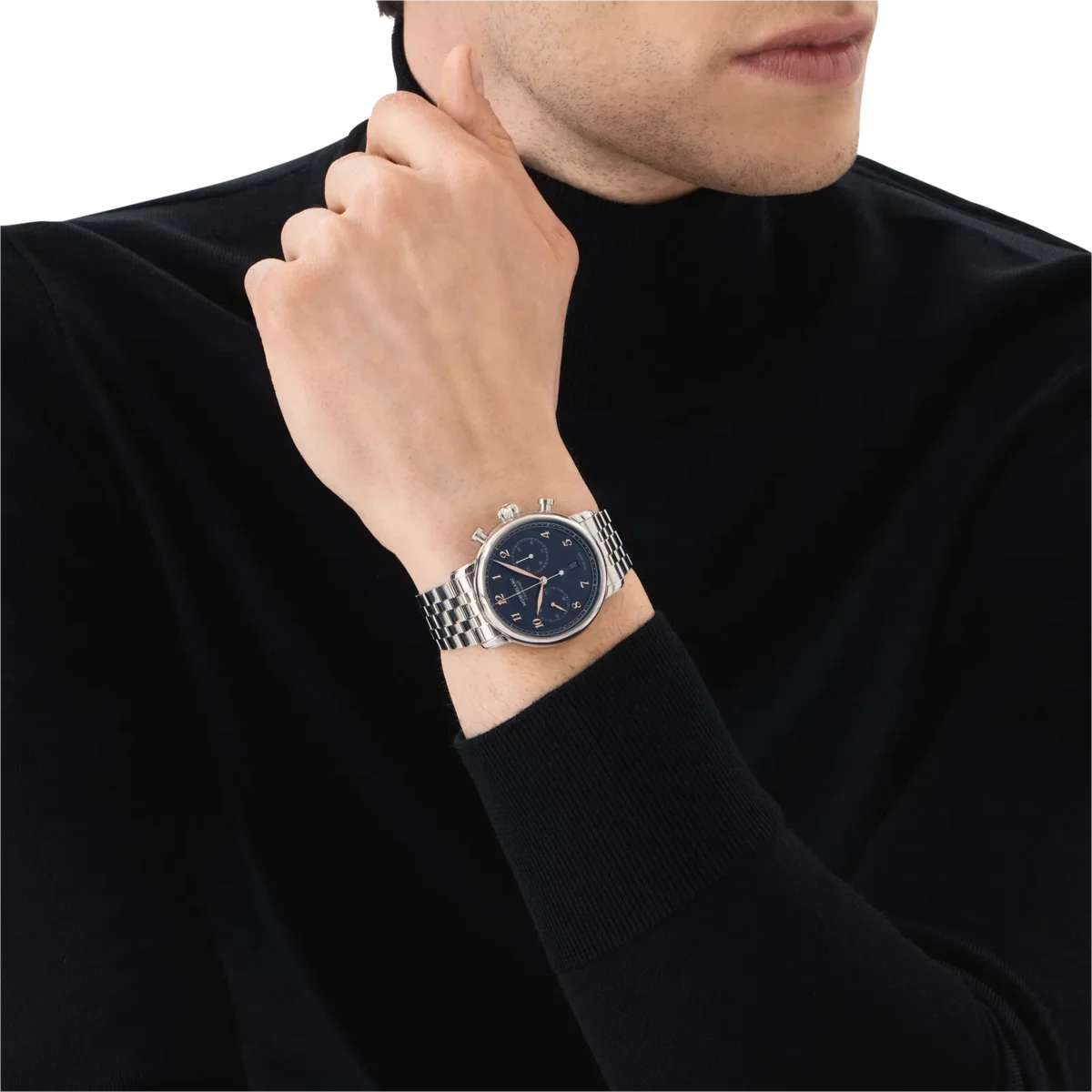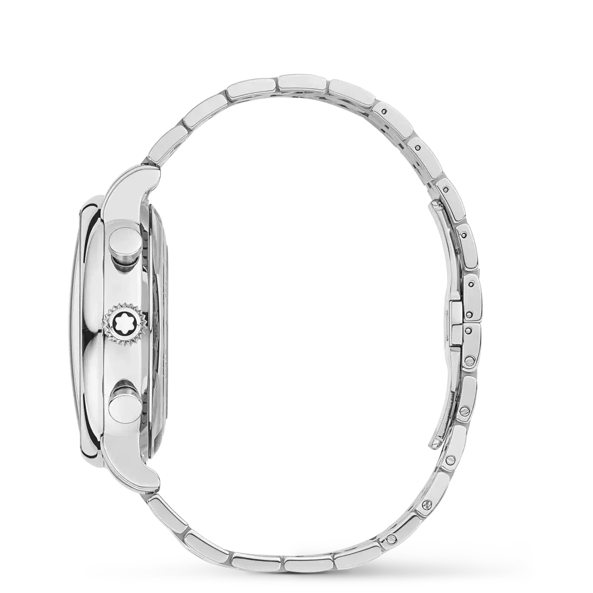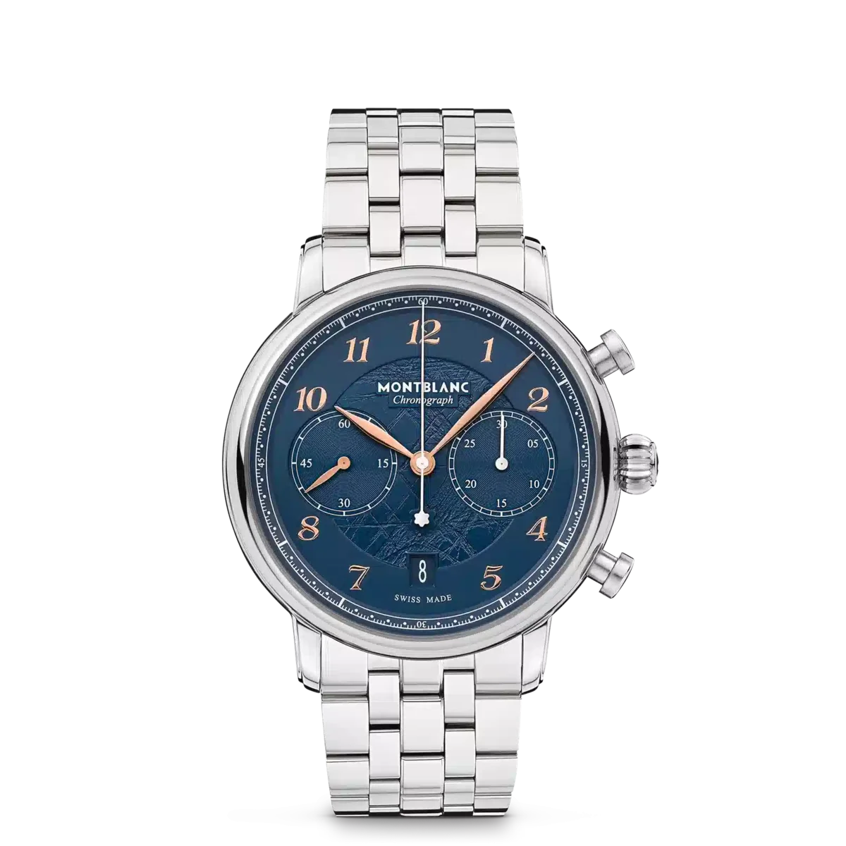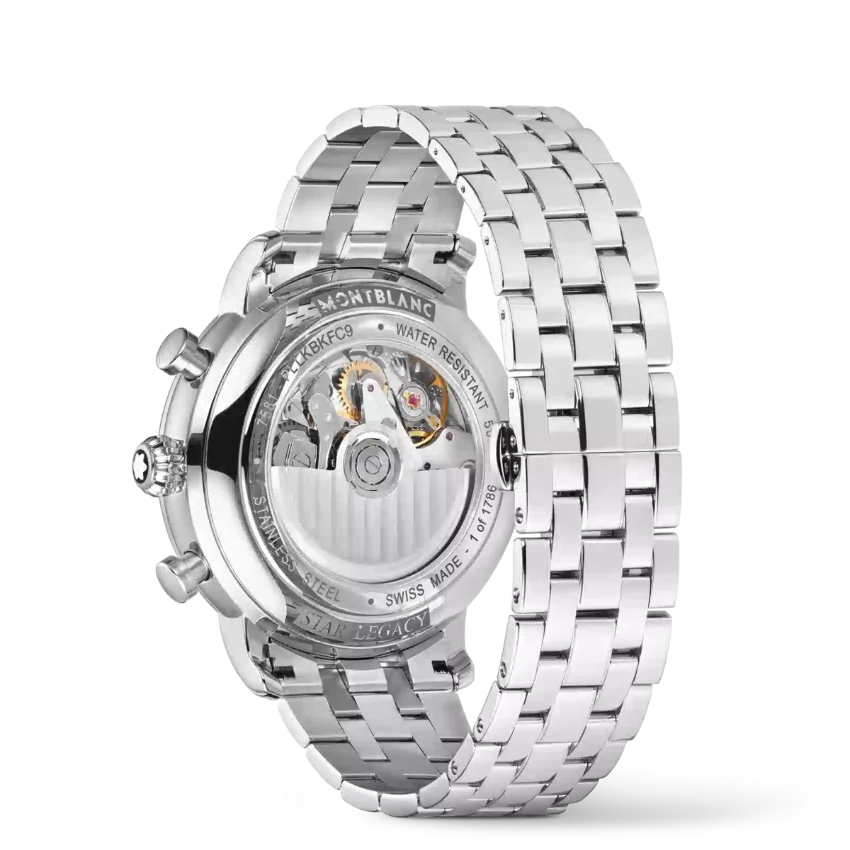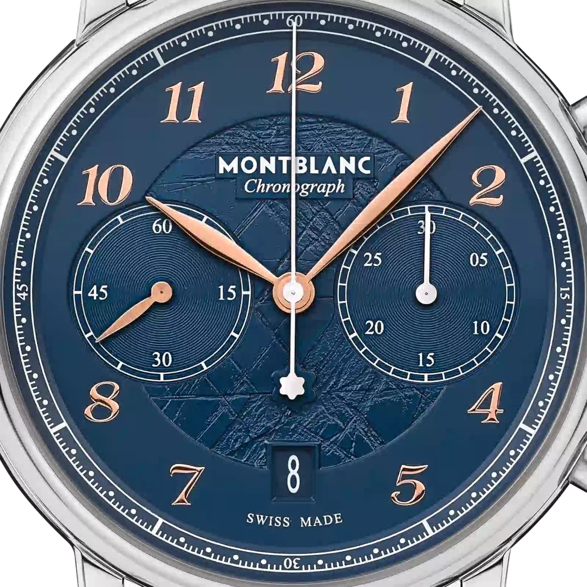 Montblanc Star Legacy Chronograph este limitat la 1786 de exemplare și vine într-o carcasă din oțel inoxidabil în formă de pietricică de 42 mm, cu cifre arabe acoperite cu aur roz și un cadran albastru cu un model glaciar atrăgător. Cadranul este decorat cu un design stratificat de gheață inspirat de Mer de Glace, principalul ghețar al muntelui Mont-Blanc. Centrul cadranului este creat folosind o ștampilă specială care reproduce textura acestui ghețar și celebrează „ora albastră” – „l’heure bleue”, în timpul căreia o nuanță de albastru intens cade peste ghețar la apus, când luna răsare și stelele încep să strălucească. La această oră a zilei, Jacques Balmat a devenit prima persoană care a ajuns pe vârful Mont Blanc – la ora 18:23, pe 7 august 1786. Funcțiile includ ore, minute, secunde centrale cu emblema Montblanc pe contragreutate, cronograf și dată, alimentate de mișcarea automată MB 25.13, care poate fi admirată prin capacul din cristal de safir. Funcțiile de timp sunt afișate cu ace în formă de frunză acoperite cu aur roz, în timp ce indicațiile cronografului utilizează ace „baton” acoperite cu rodiu. Ceasul este asortat cu o brățară din oțel inoxidabil.