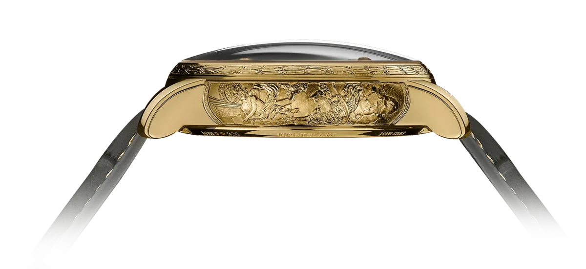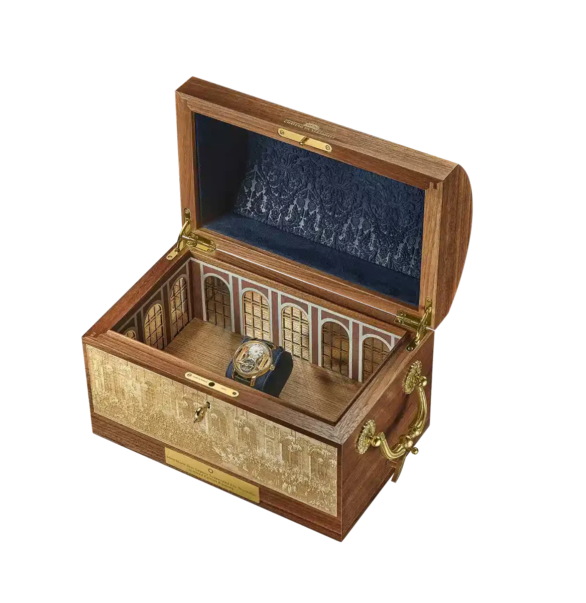 Recreați un grandios bal mascat organizat în 1745 de Ludovic al XV-lea în renumita Sală a Oglinzilor de la Versailles cu Montblanc Star Legacy Suspended Exo Tourbillon Château de Versailles: „Le Secret du Bal des Ifs”. Acest ceas excepțional combină haute horlogerie tradițională, marchetărie, gravură manuală și email champlevé cu modelare digitală 3D și gravură laser. Cadranul principal recreează faimosul „Bal al Tisa”, cu o bază din aur alb 750/1000 (18 karate) acoperită cu email negru și paillons din aur, evocând reflexiile candelabrelor aprinse cu lumânări în ferestrele Sălii Oglinzilor. Arcadele sunt realizate din piatră Cacholong și marmură Sarrancolin, provenite din aceeași carieră din regiunea Hautes-Pyrénées din Franța, utilizată la Versailles. Parchetul este reprodus fidel din stejar masiv. Candelabrele și oaspeții costumați sunt gravați pe o placă de safir suprapusă cadranului principal. Inspirat de ceasurile din epoca lui Ludovic al XIV-lea, cadranul situat la ora 12 amintește de tradițiile Haute Horlogerie, folosind email champlevé și un inel gravat din aur galben 750/1000 (18 karate), în timp ce mâinile scheletate din aur galben 750/1000 (18 karate) sunt încoronate cu capul lui Apollo. Carcasa din aur galben 750/1000 (18 karate) este decorată cu o coroană de lauri gravată manual pe lunetă și o scenă care îi înfățișează pe Minerva și Mercur pe banda carcasei, recreând un tablou din Salonul Păcii – o cameră situată lângă Sala Oglinzilor. Acest ceas este alimentat de calibrul Manufacture MB M16.68 cu complicația brevetată Suspended Exo Tourbillon, care a necesitat trei ani de dezvoltare. Cureaua interschimbabilă din piele de vițel gri cu imprimeu aligator și catarama triplă pliabilă din aur galben 750/1000 (18 karate) completează acest ceas excepțional. Limitat la 8 exemplare, Montblanc Star Legacy Exo Tourbillon Château de Versailles: „Le Secret du Bal des Ifs” este livrat într-un coșuleț din lemn de nuc, care conține o cutiuță muzicală ce redă o melodie dintr-o comedie-balet de Jean-Philippe Rameau. Un spectacol încântător pe o podea miniaturală din parchet, înconjurată de arcade din marmură, care evocă balul mascat de la Versailles din Sala Oglinzilor.