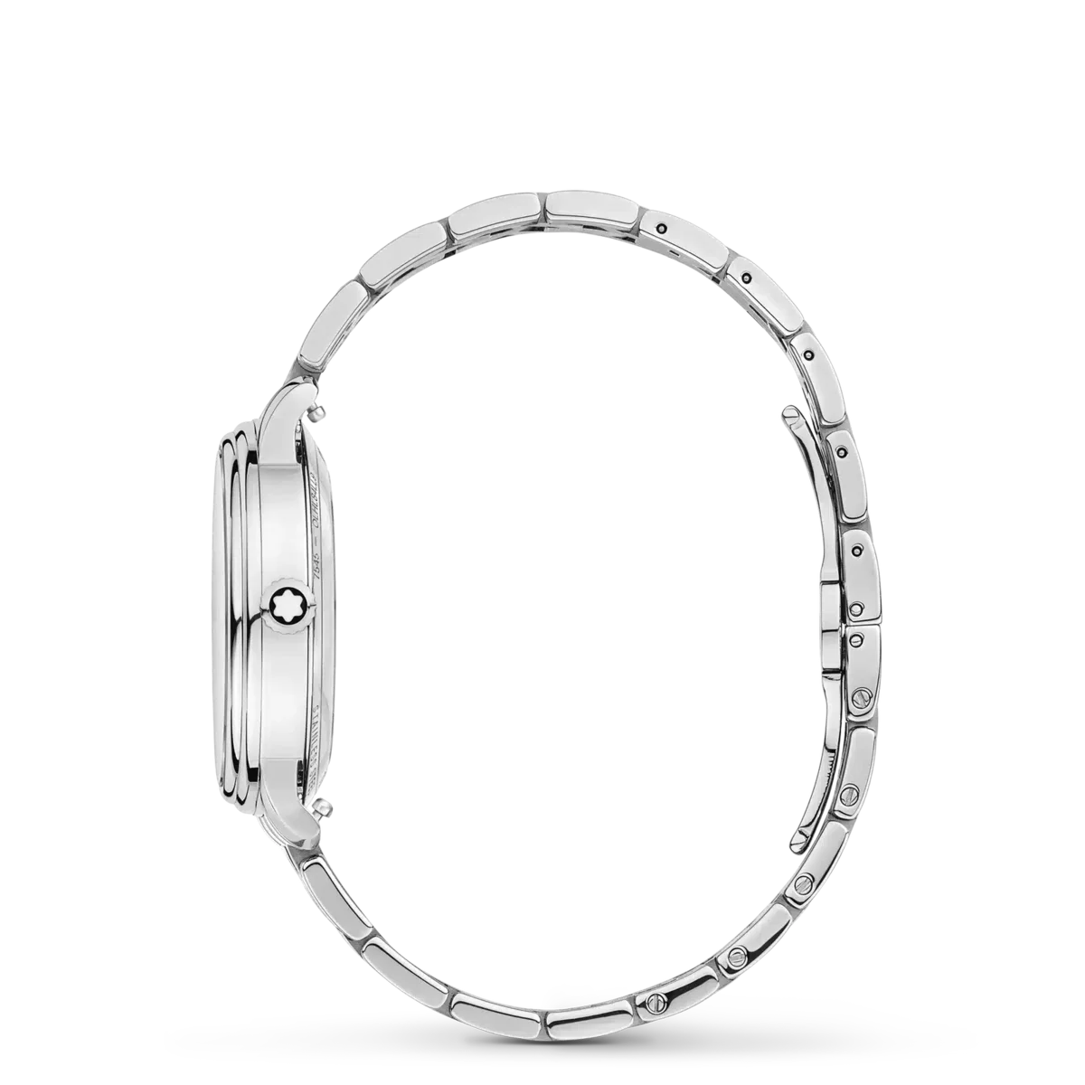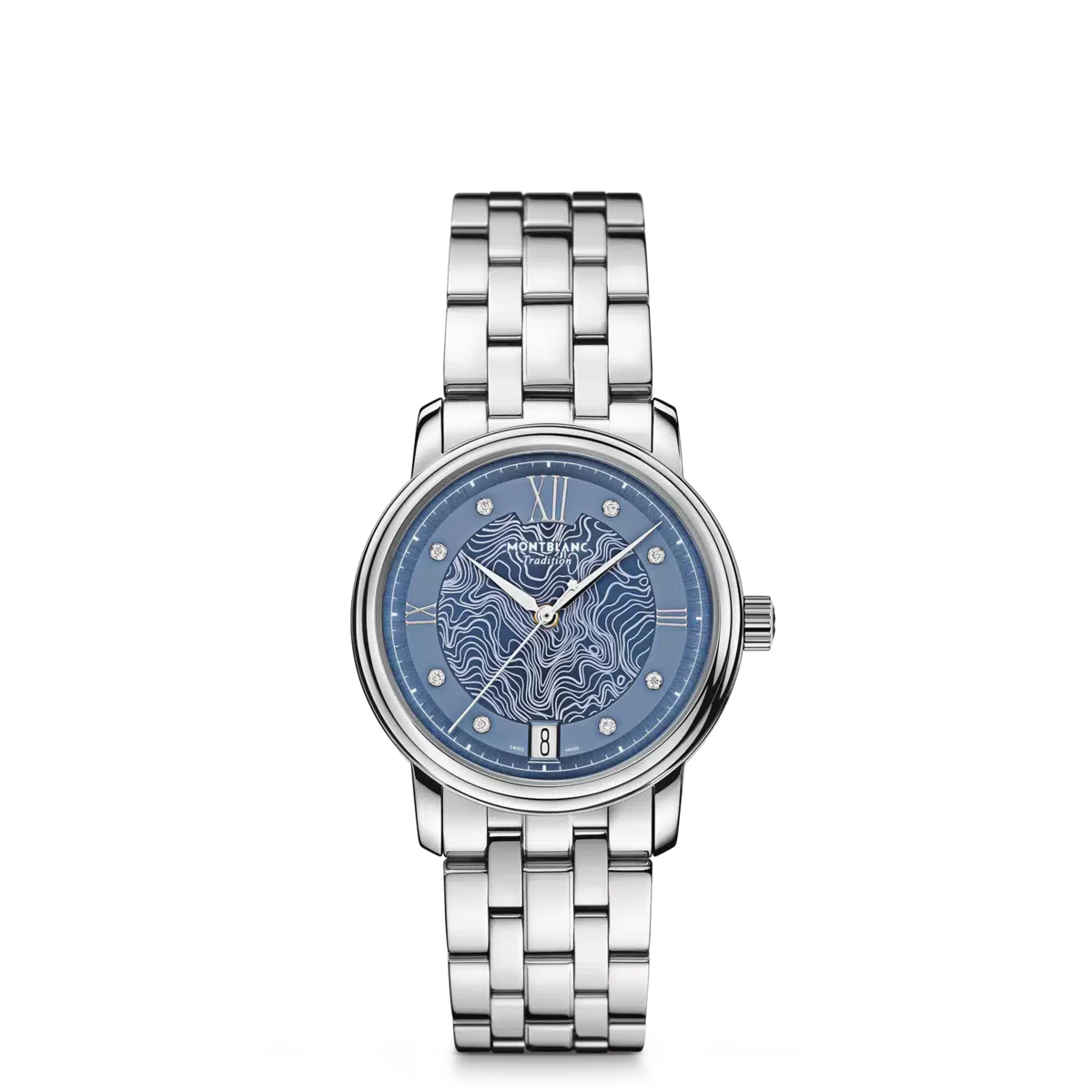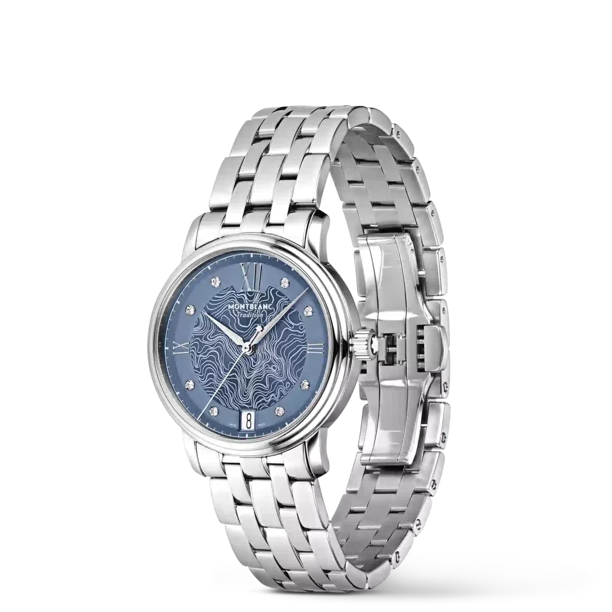Montblanc Tradition Automatic Date are o carcasă din oțel inoxidabil de 32 mm, cu coarne drepte și o lunetă dublă. Ceasul are un cadran albastru care redă topografia Mont Blanc, cu indici din diamante, cifre romane argintii și un „XII” roman proeminent. Acele orelor și minutelor în formă de sabie, acul secundelor și coroana cu emblema Montblanc, precum și brățara din oțel inoxidabil interschimbabilă completează aspectul său contemporan și elegant.
